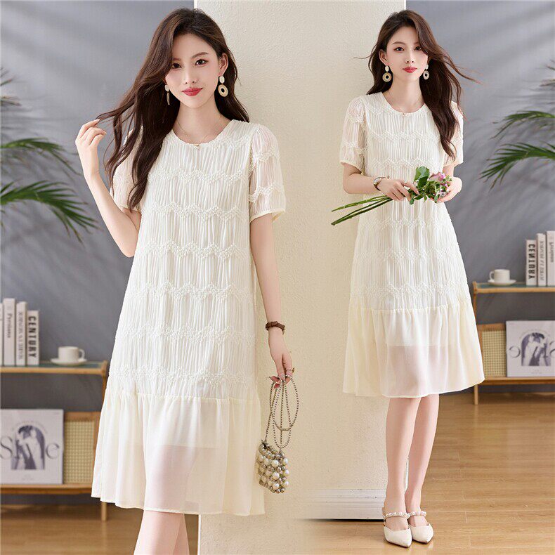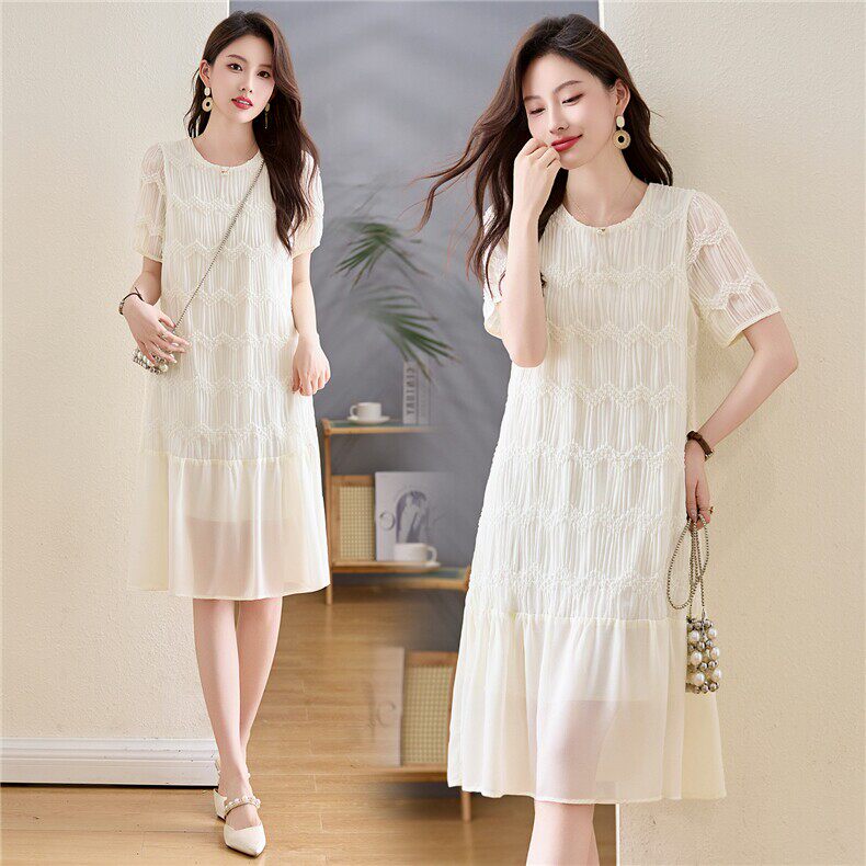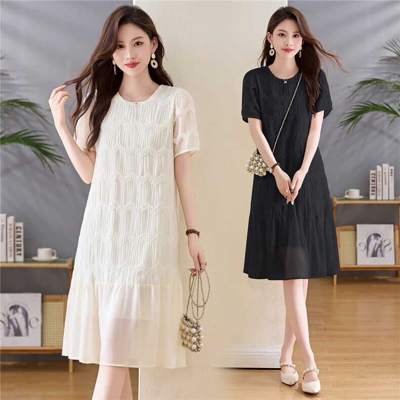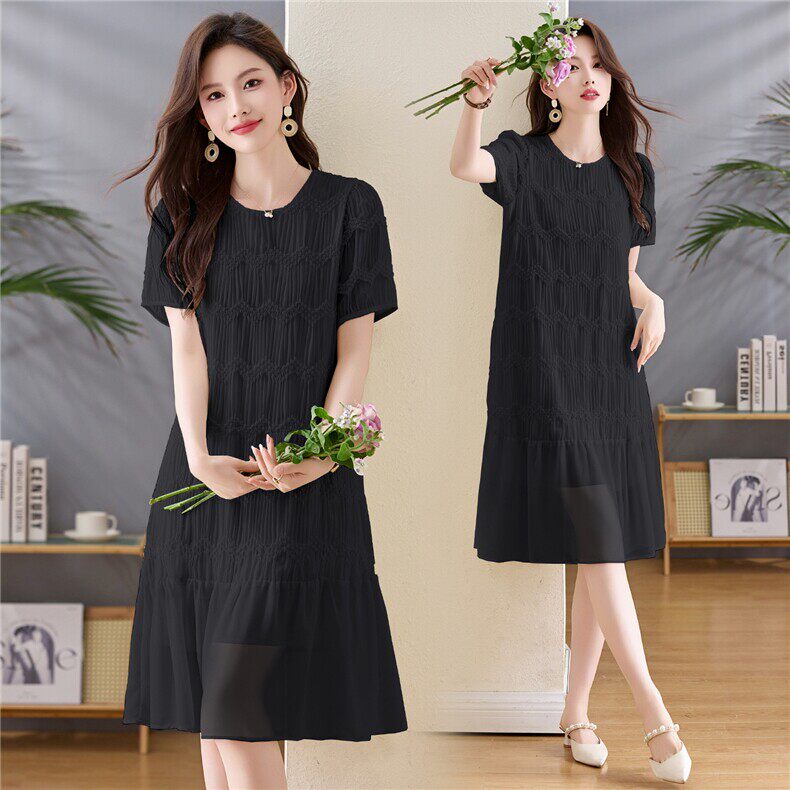2025夏新款法式优雅气质高级感小个子短袖褶皱拼接中长款连衣裙女