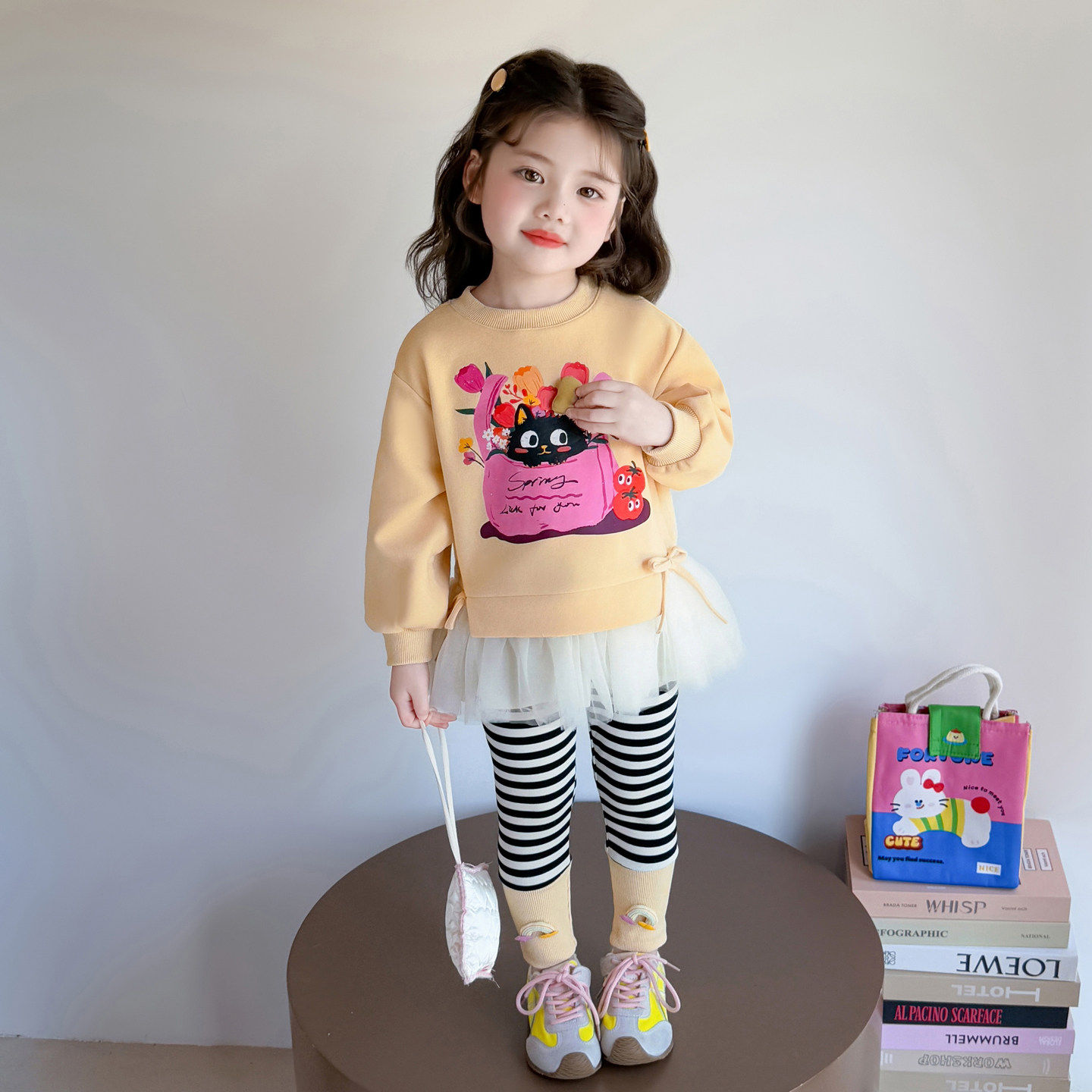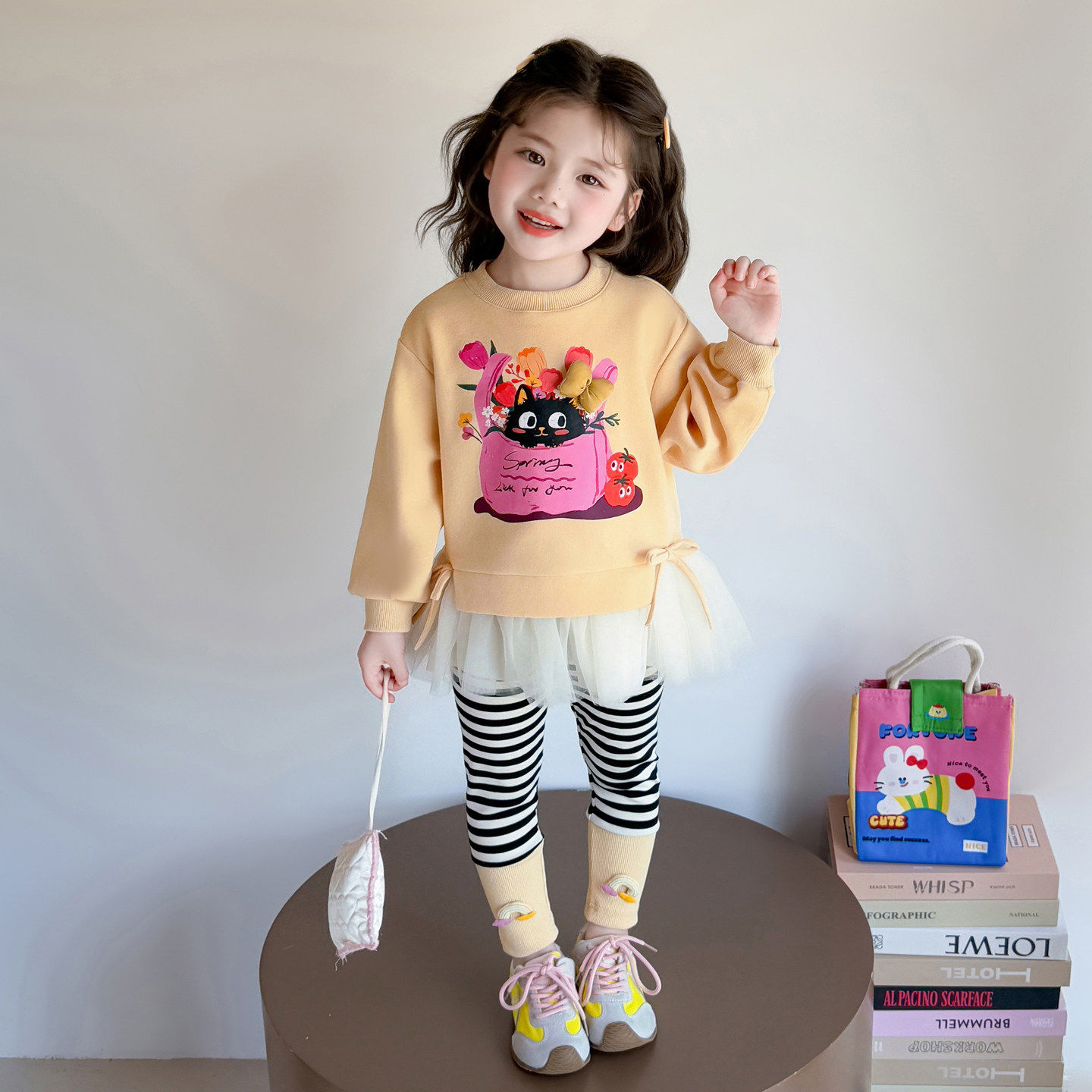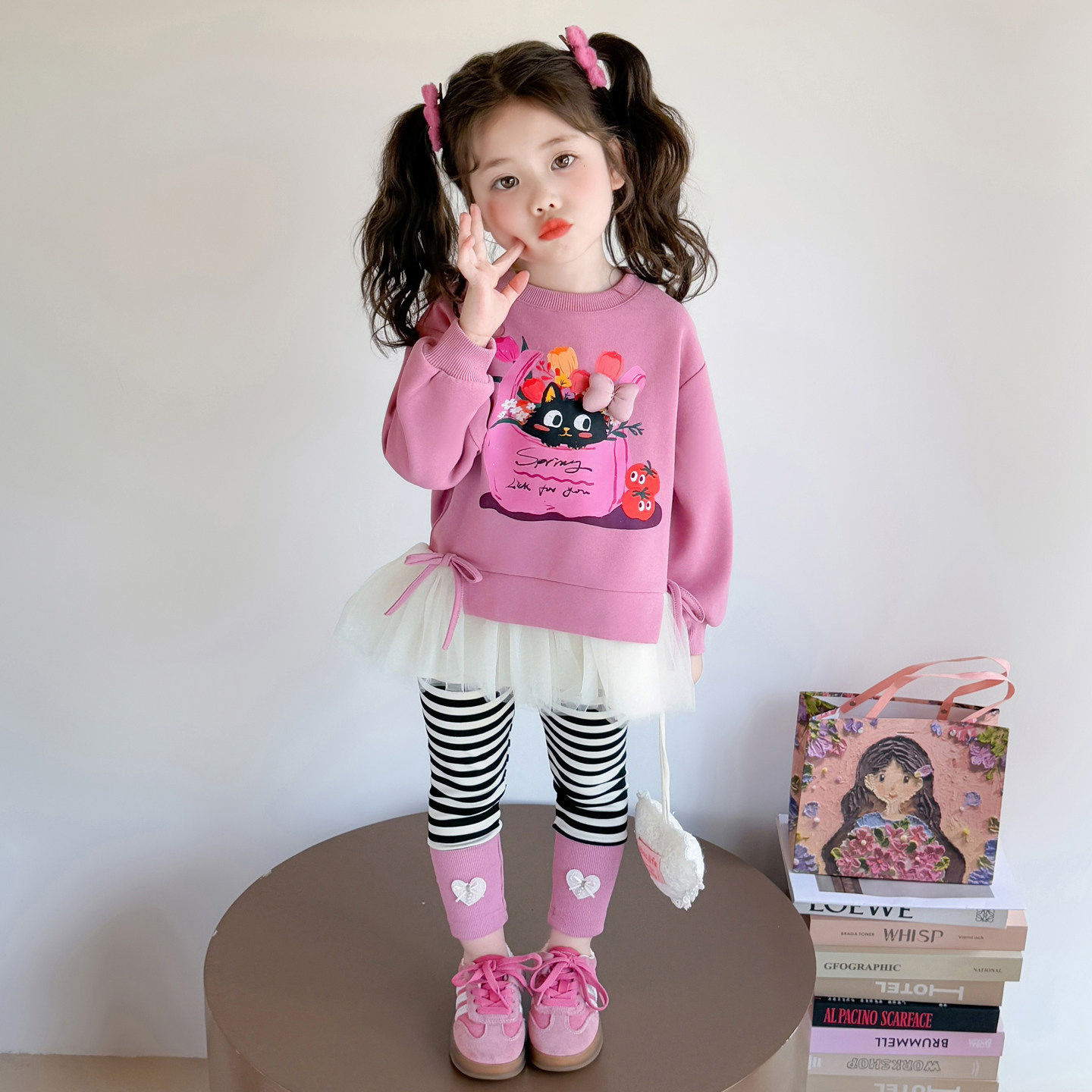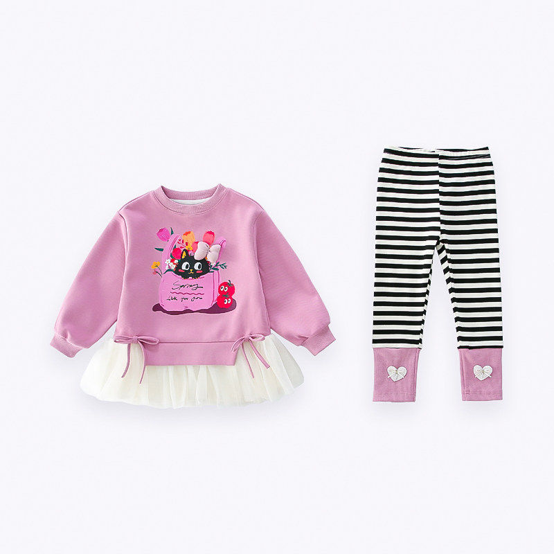 女童春装卫衣2026新款儿童卡通网纱花边休闲春季条纹打底裤两件套