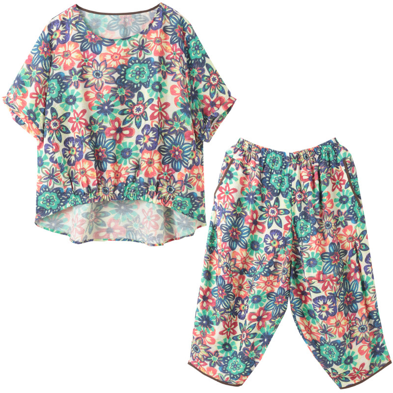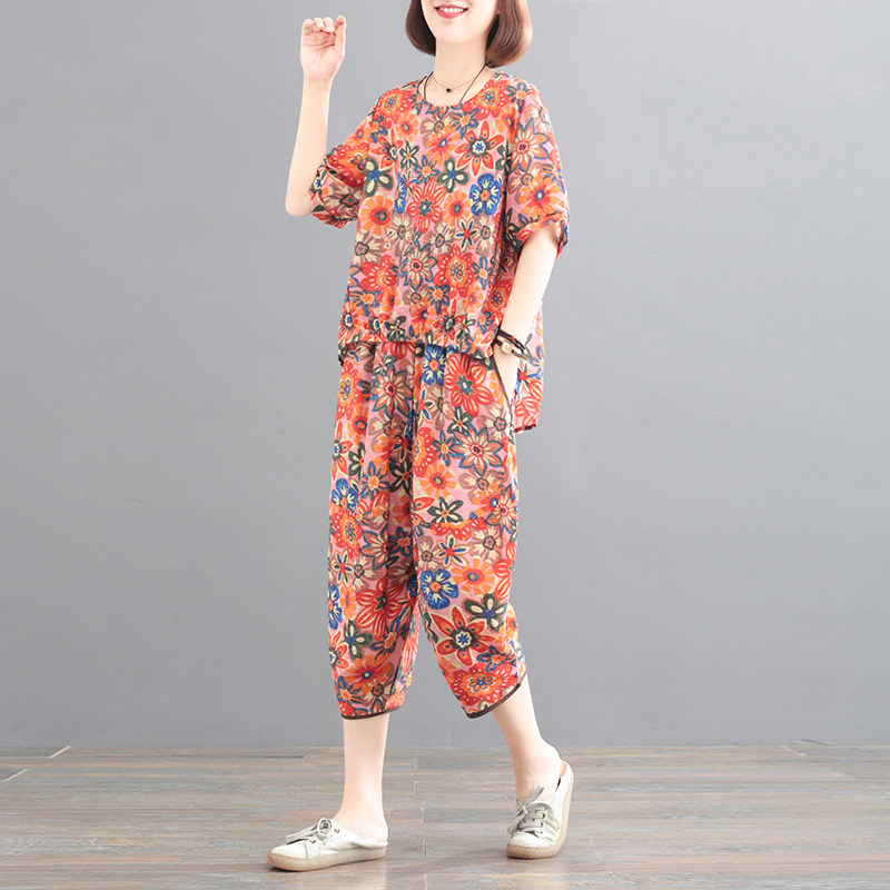 孔雀飞飞2026夏装新款韩版大码遮肉印花复古棉麻民族风女装套装