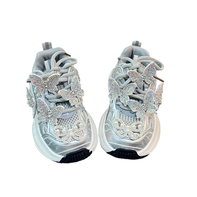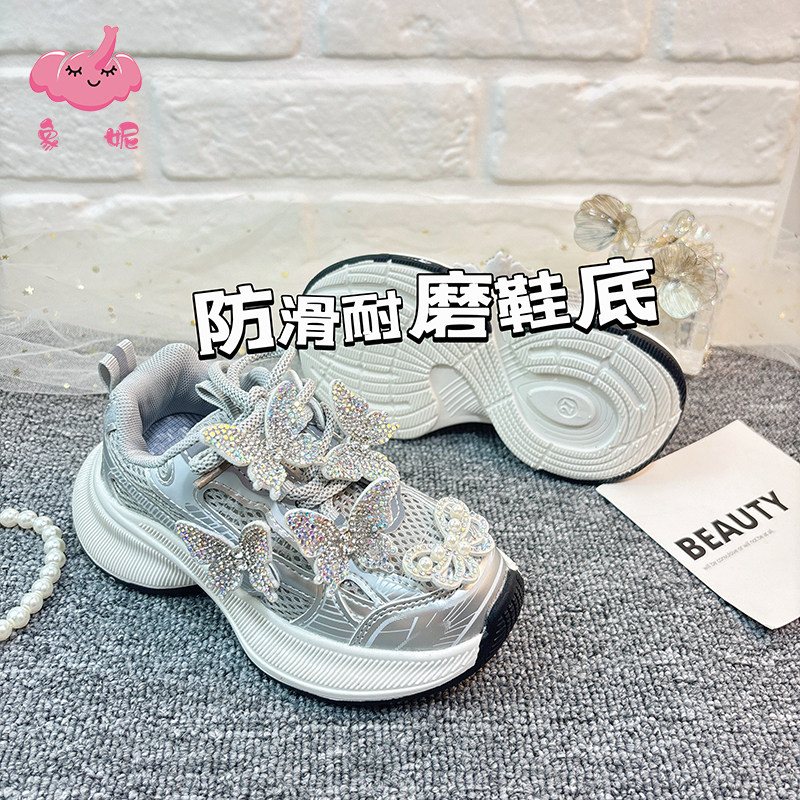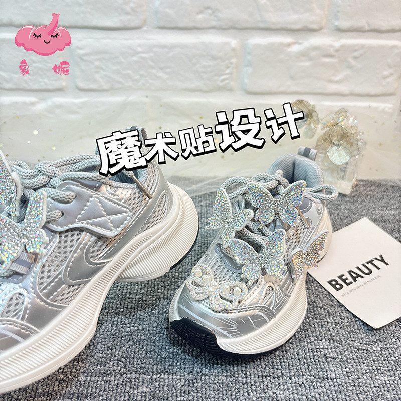 女童老爹鞋2026春季新款网面透气儿童银色蝴蝶运动鞋软底防滑女款