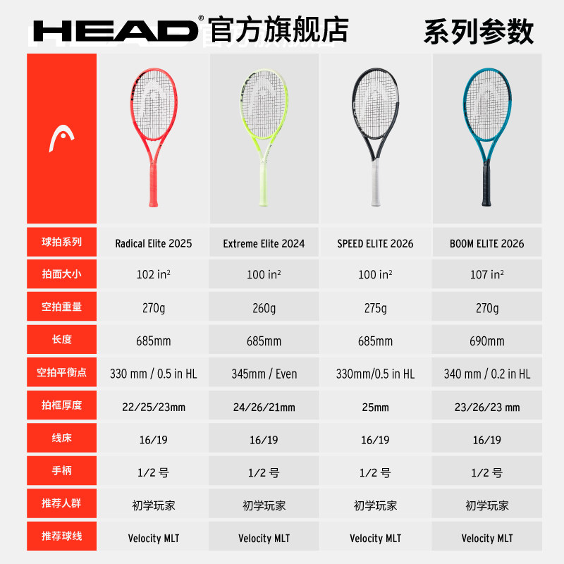 HEAD海德BOOM ELITE系列全碳素初学者大学生男女专业网球拍PWR