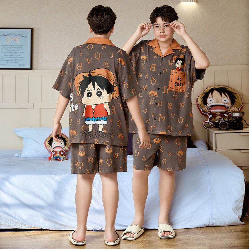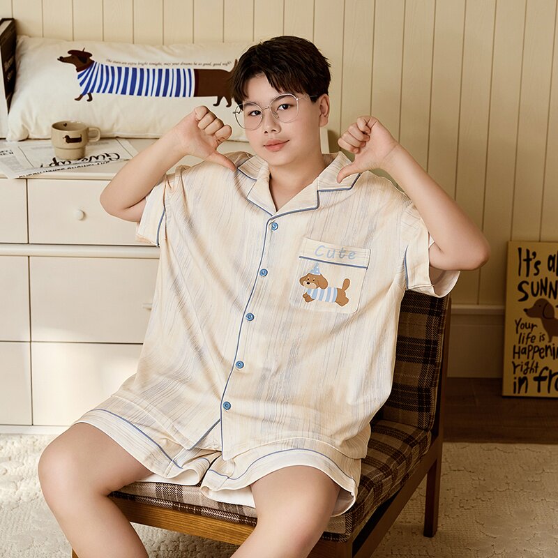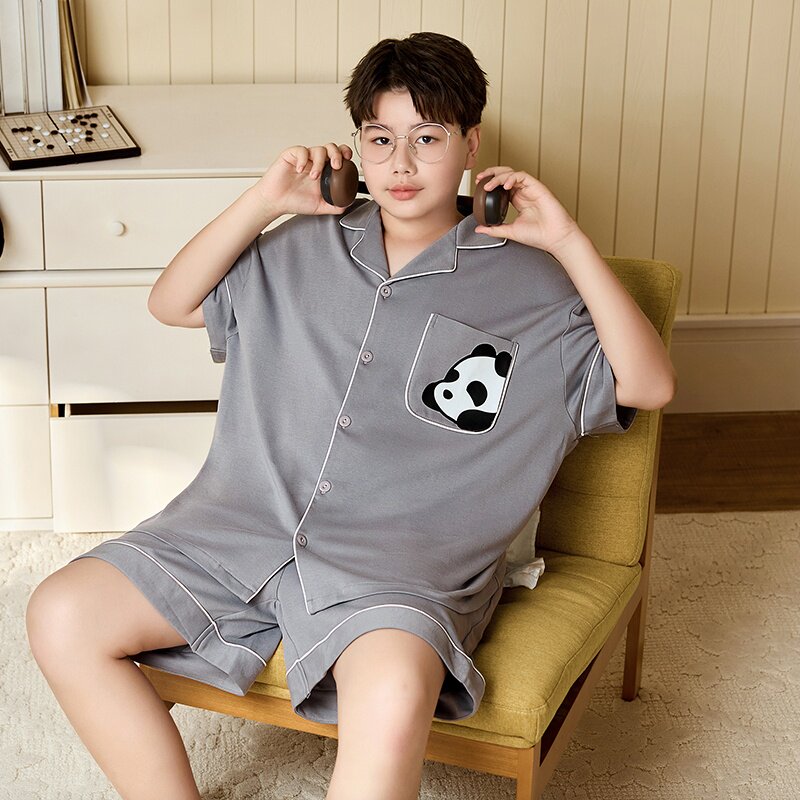 胖童睡衣男孩青少年夏季纯棉薄款短袖套装加肥加大男童熊猫家居服