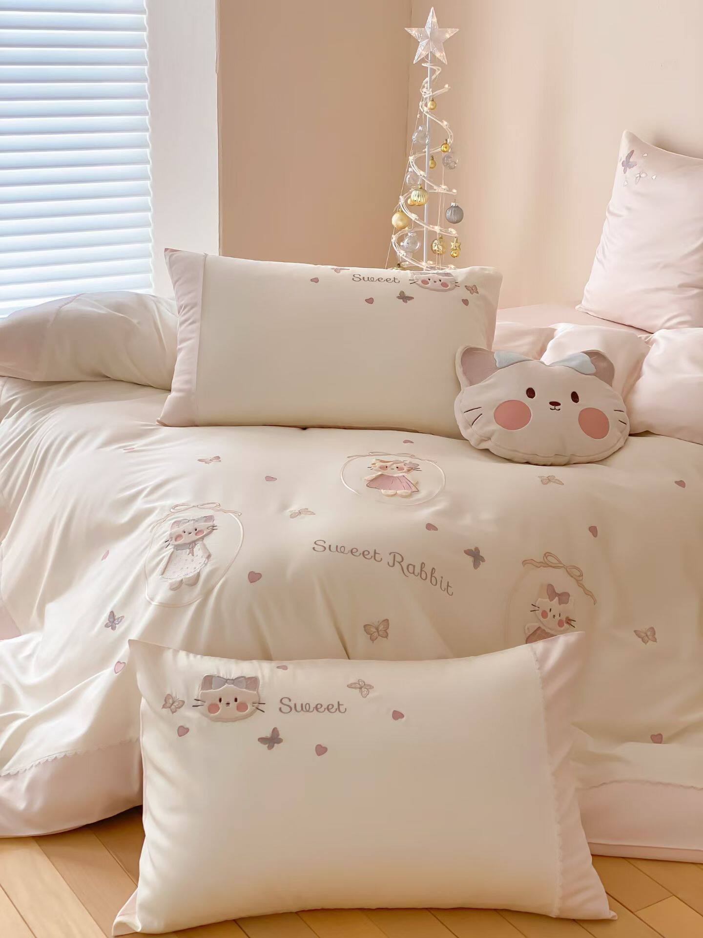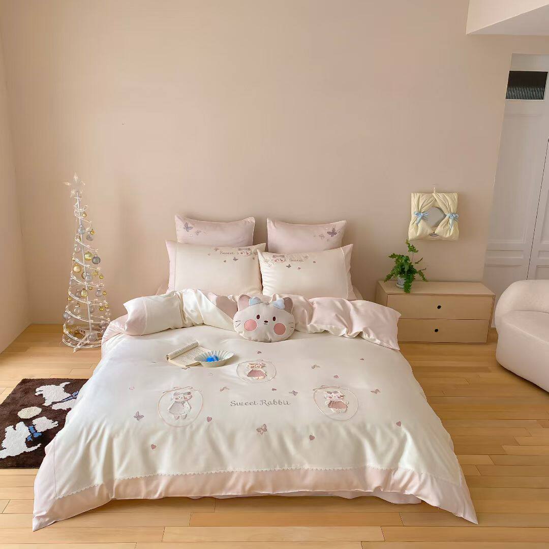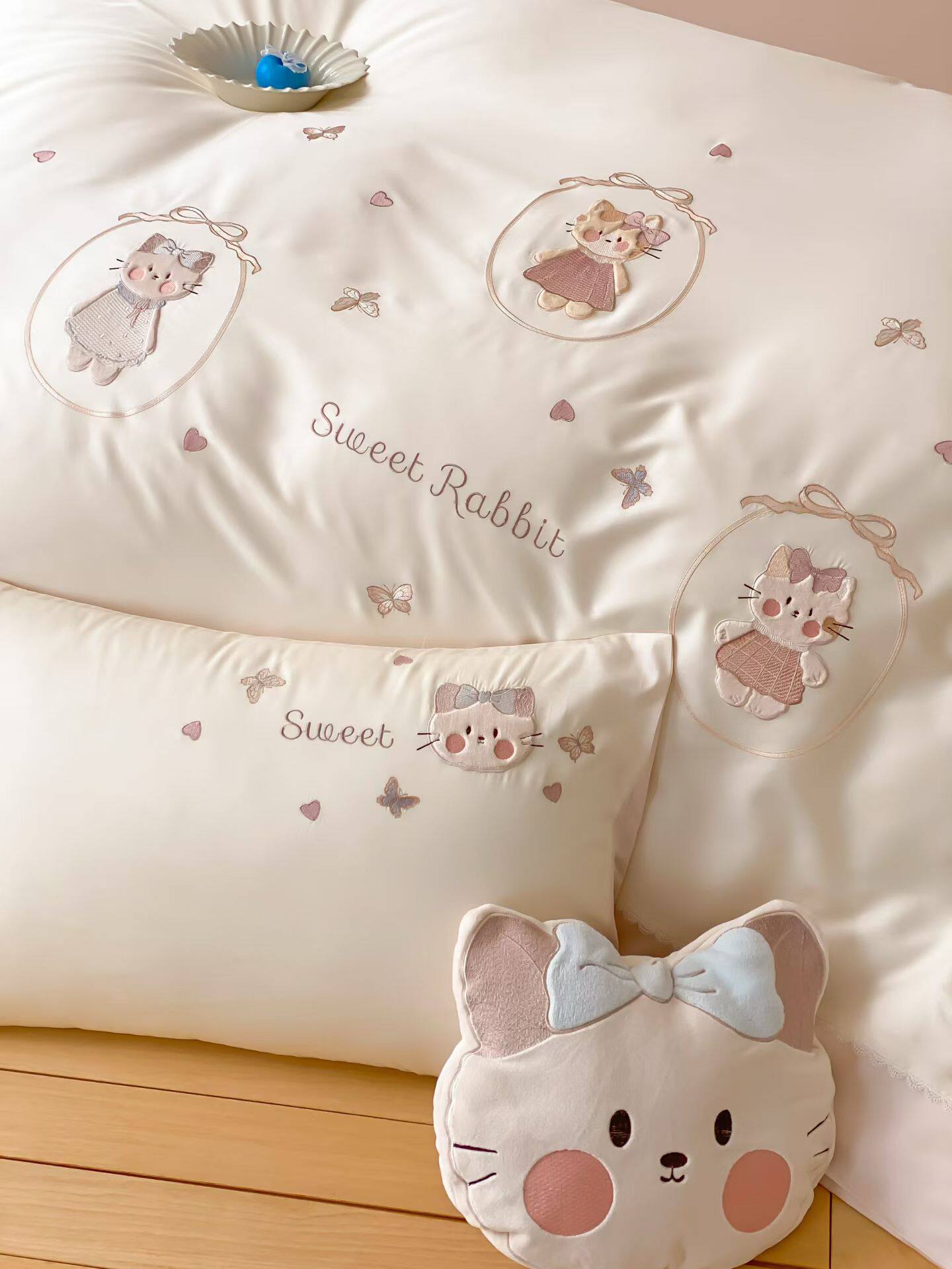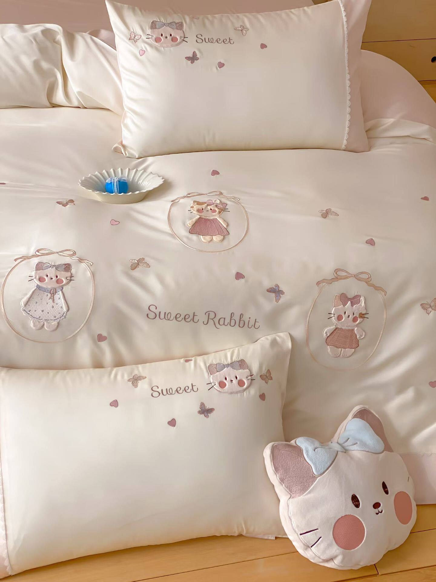 夏季冰丝天丝四件套儿童莱赛尔凉感被套猫咪床单床上用品粉色1.2