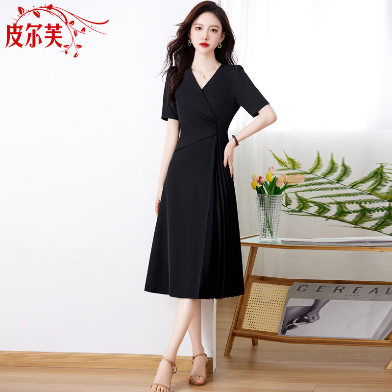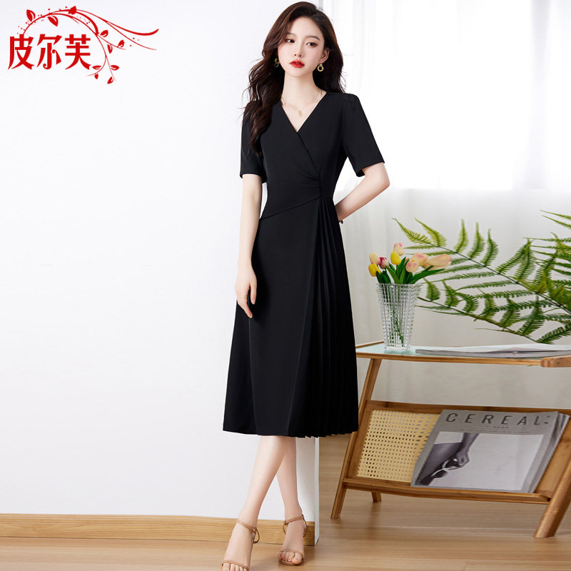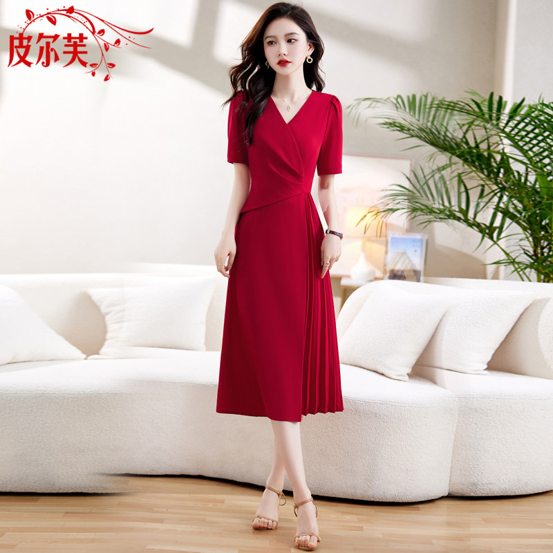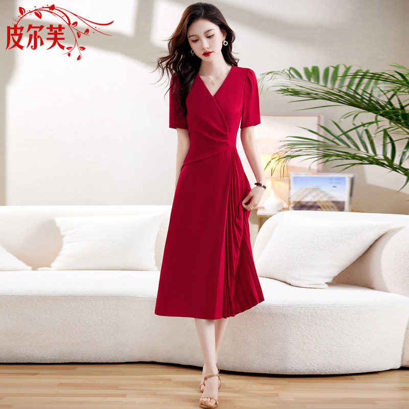 轻奢高级感红色名媛连衣裙女夏季新款气质洋气减龄中长款百褶裙子