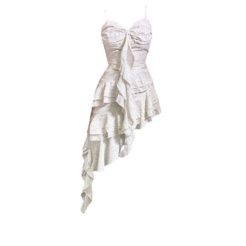 大码胖mm海边度假仙女长裙夏季不规则层次感荷叶边气质吊带连衣裙