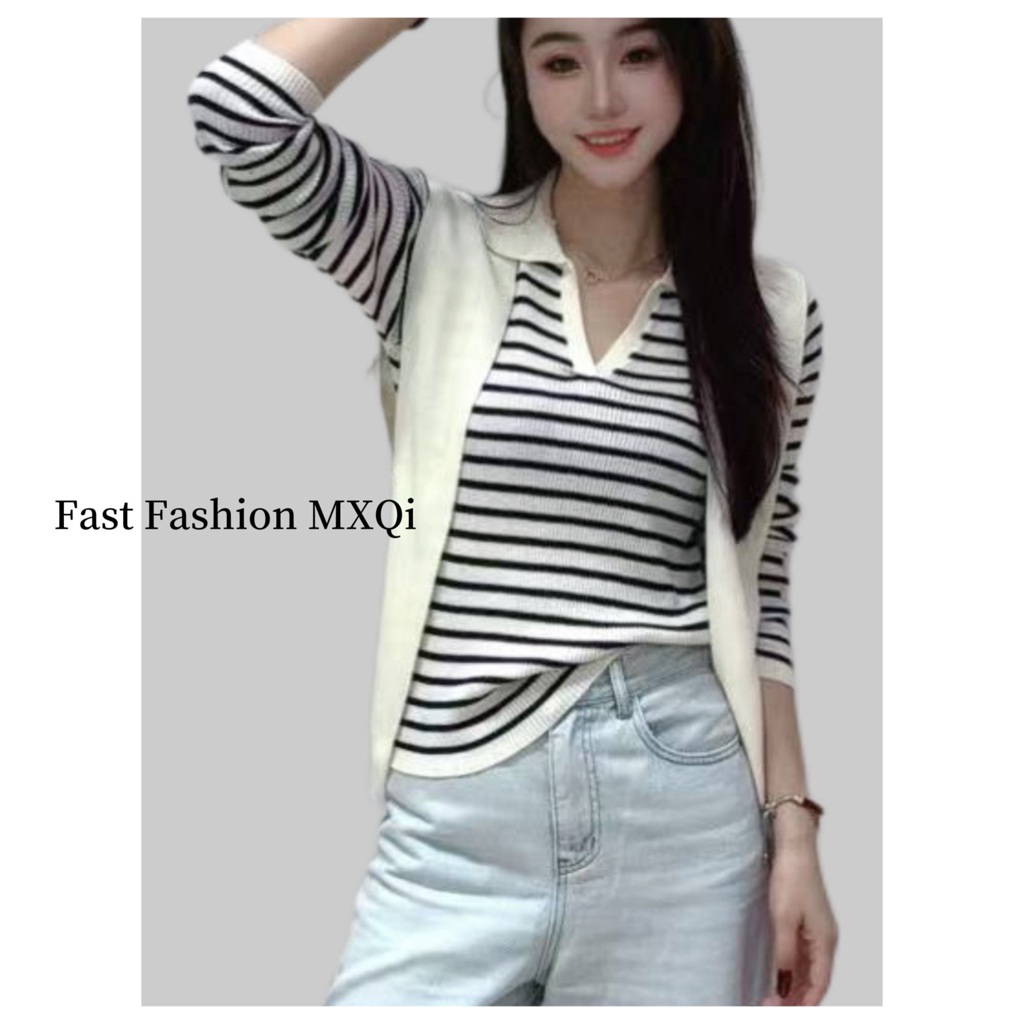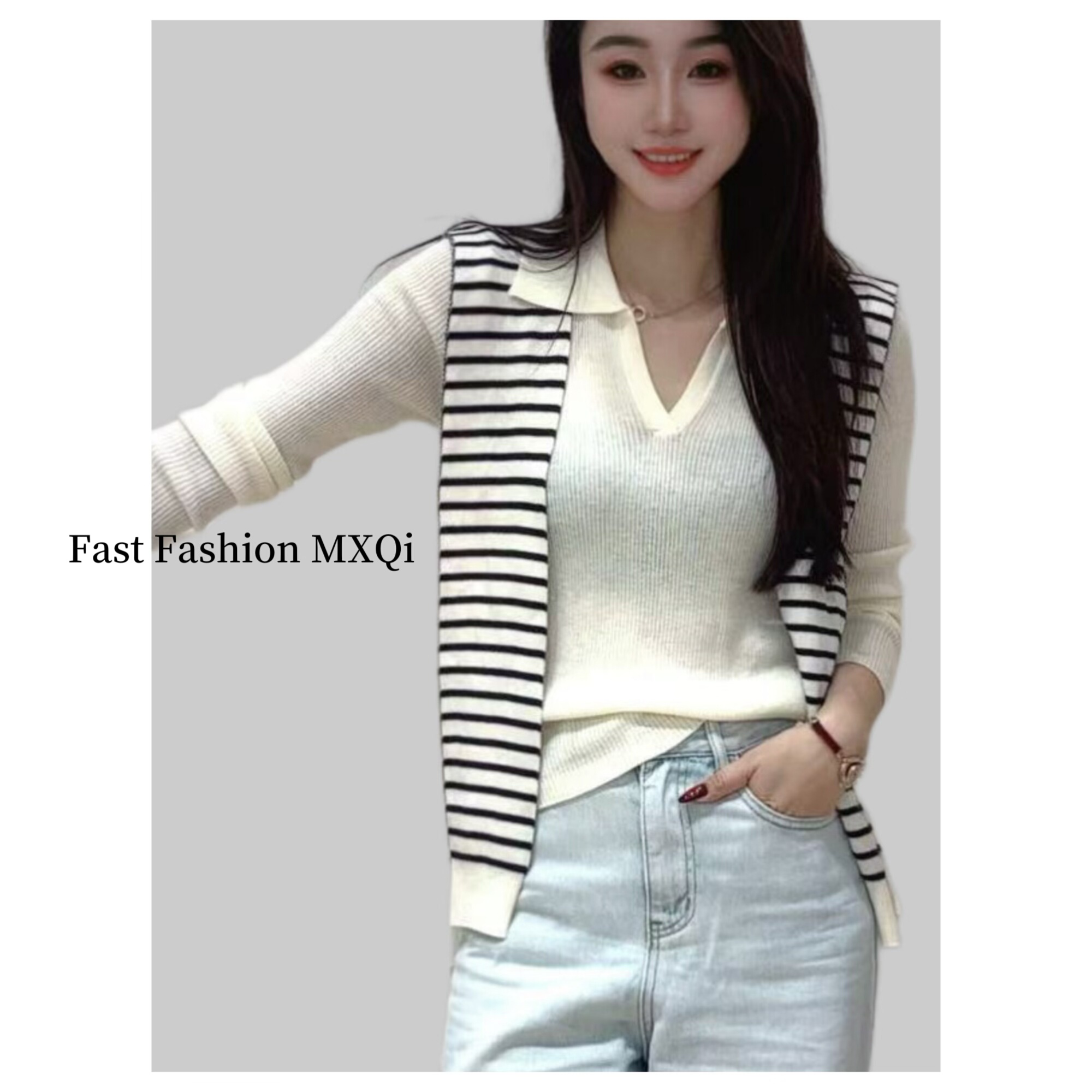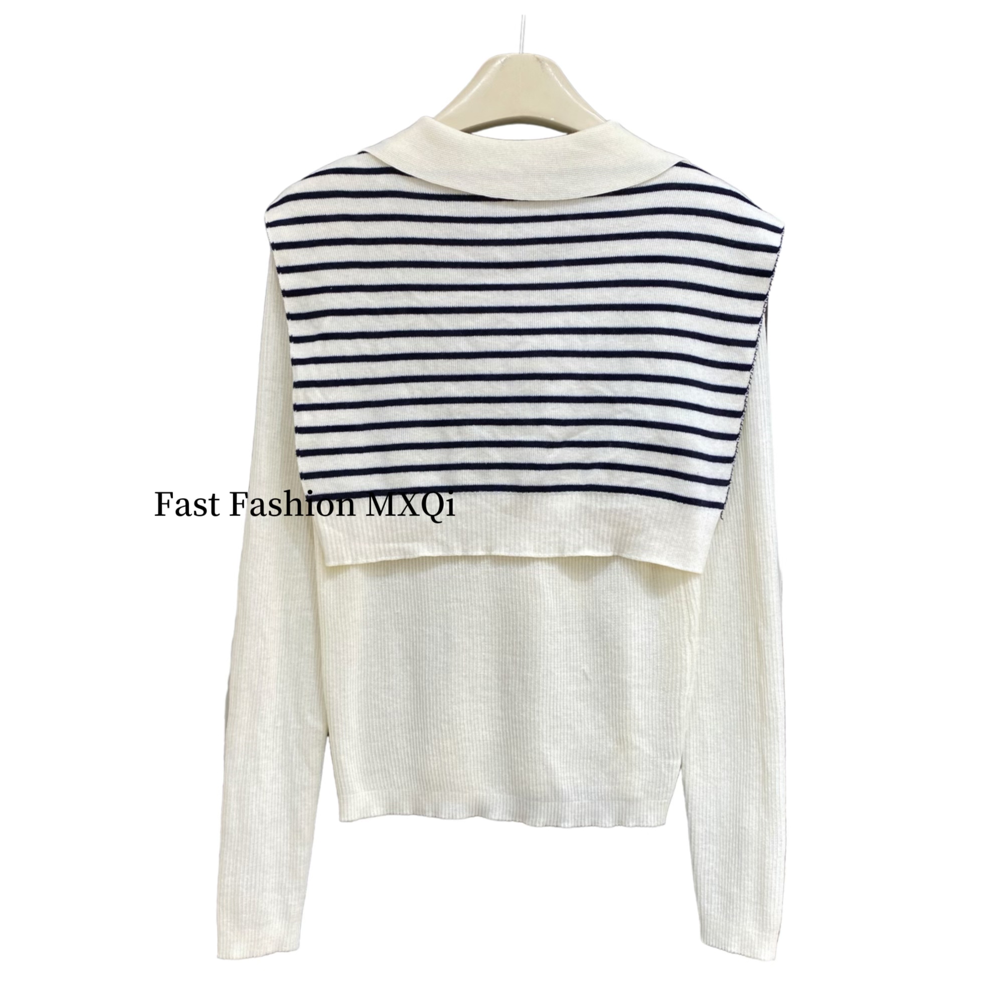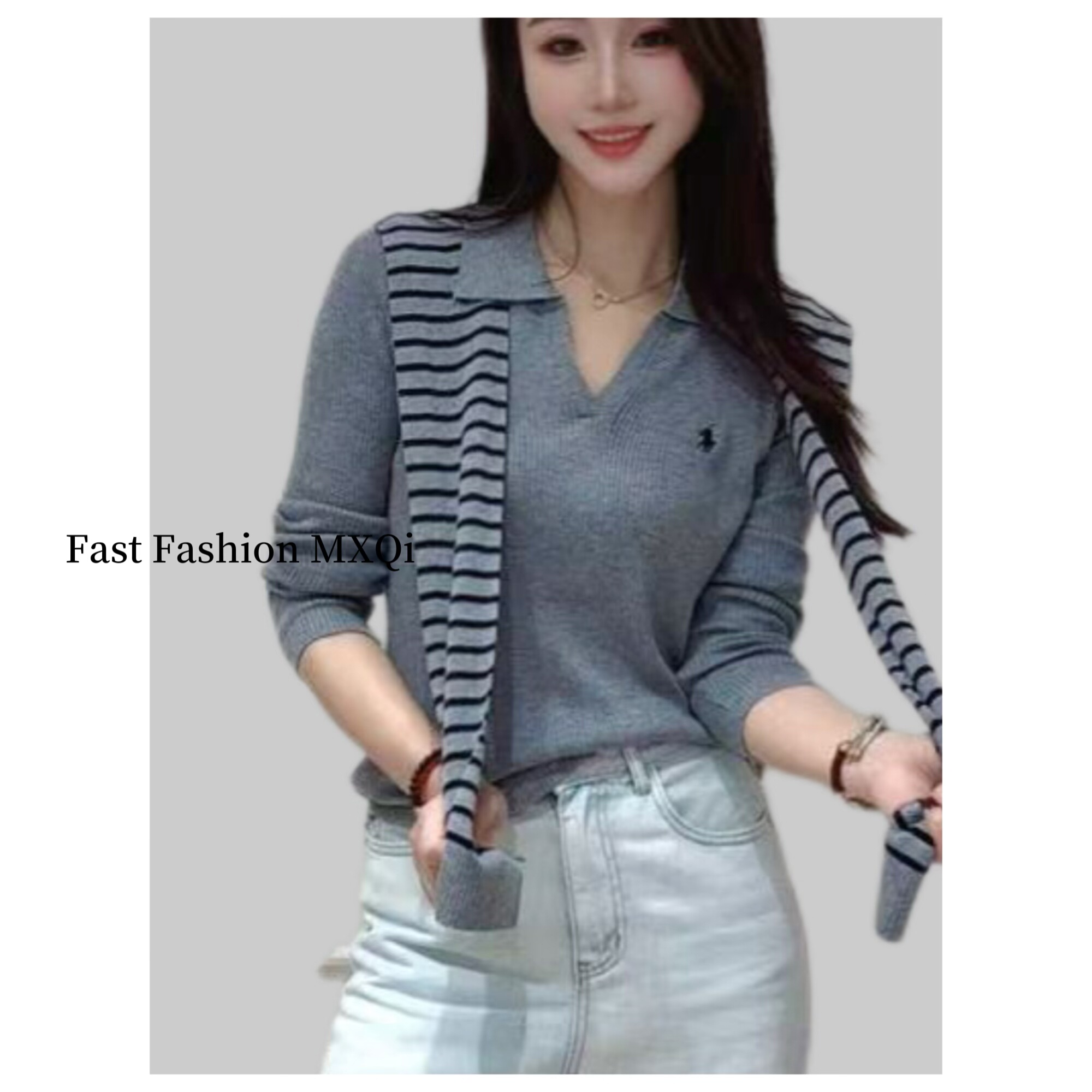2026早春新款条纹披肩Polo领针织衫女毛衣长袖洋气韩版针织上衣