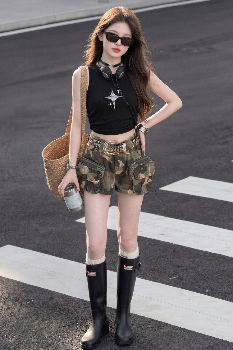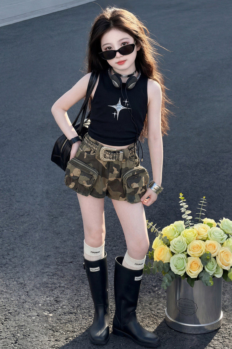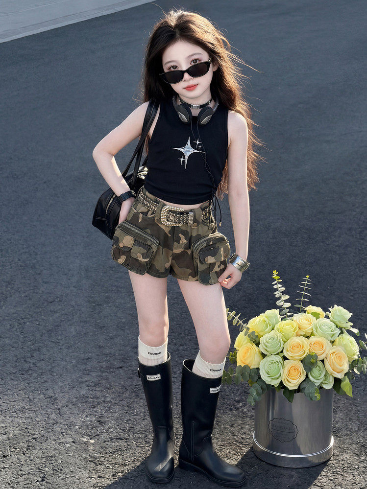 女童套装夏季新品中大女儿童上衣短裤两件套女孩背心迷彩短裤套装