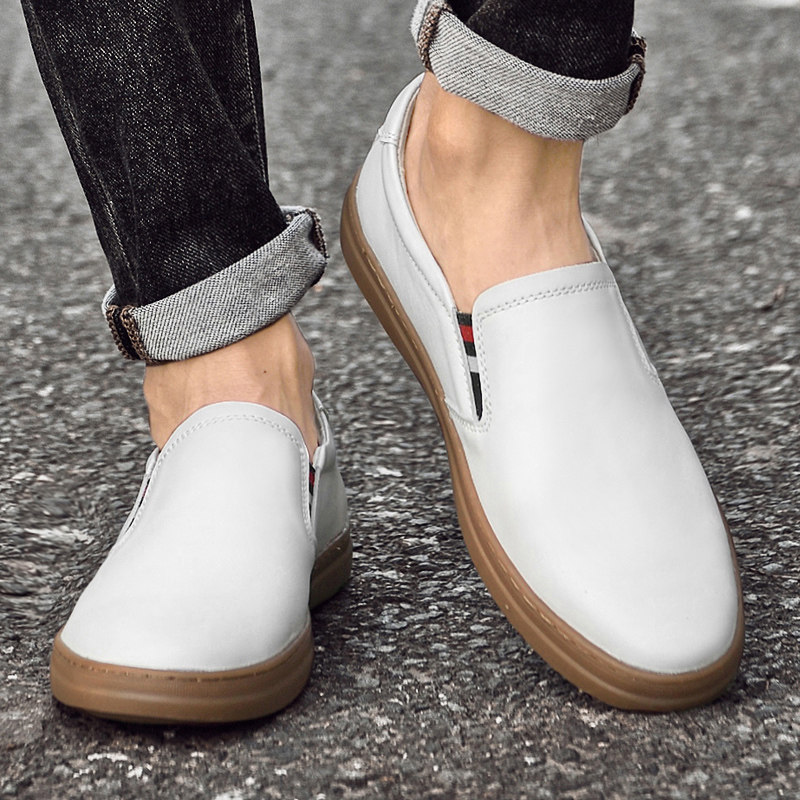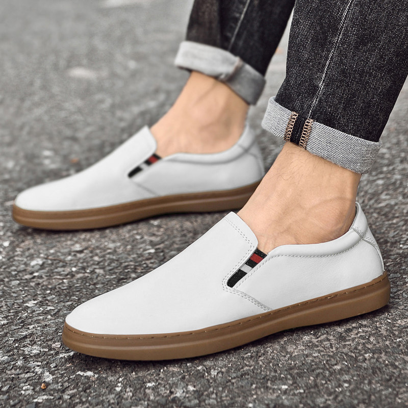 头层牛皮男士休闲皮鞋男真皮时尚白色板鞋纯皮一脚蹬无鞋带小白鞋