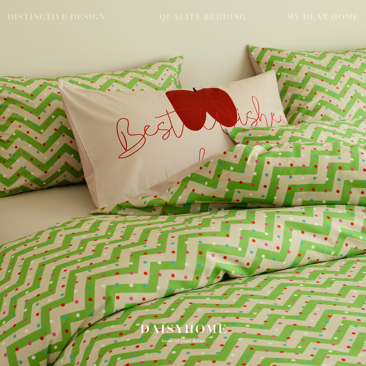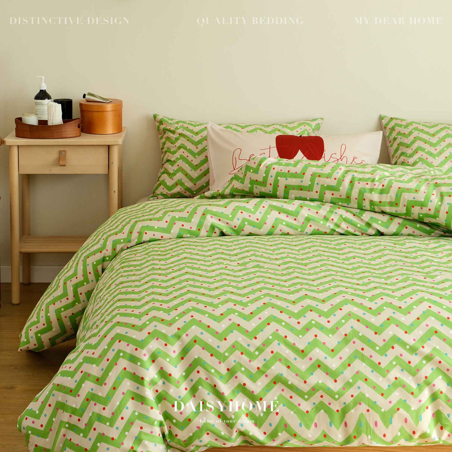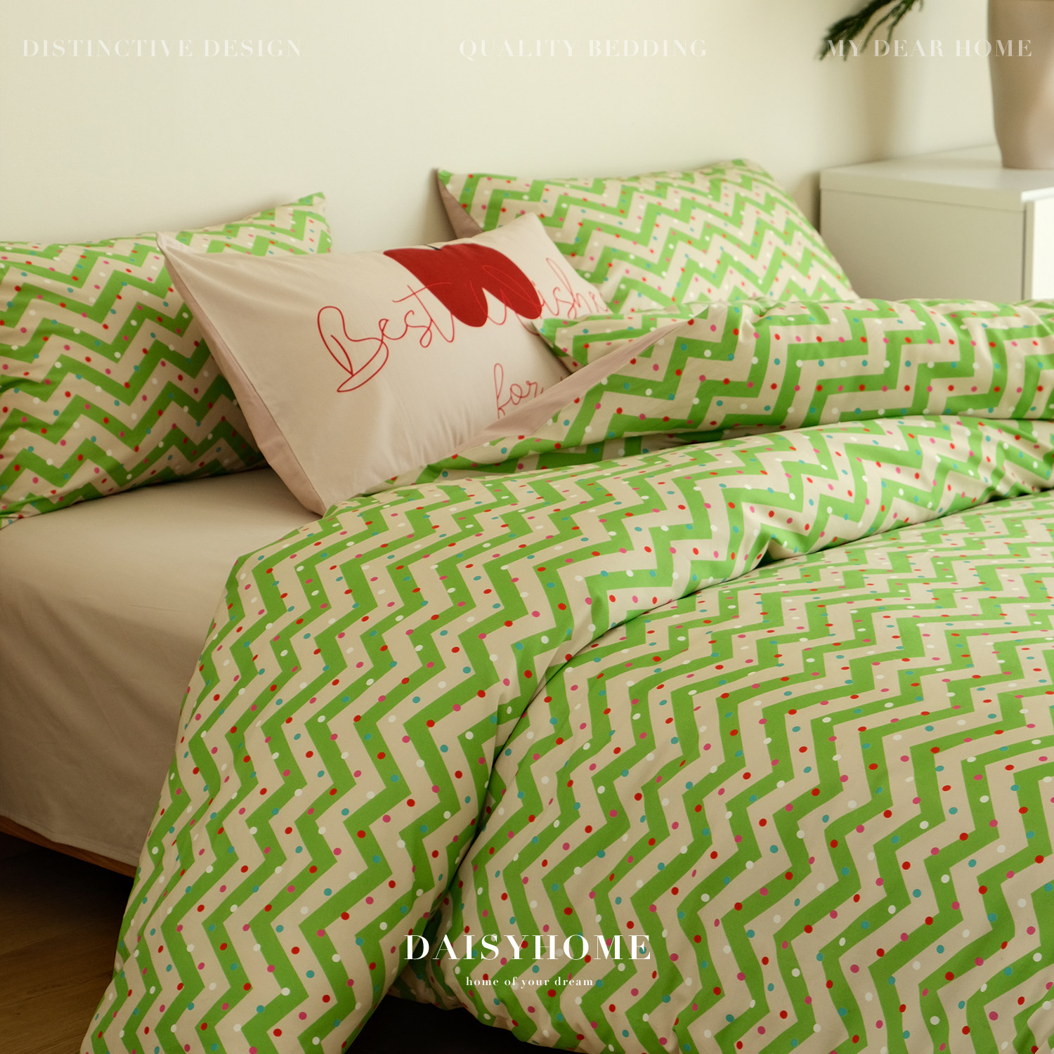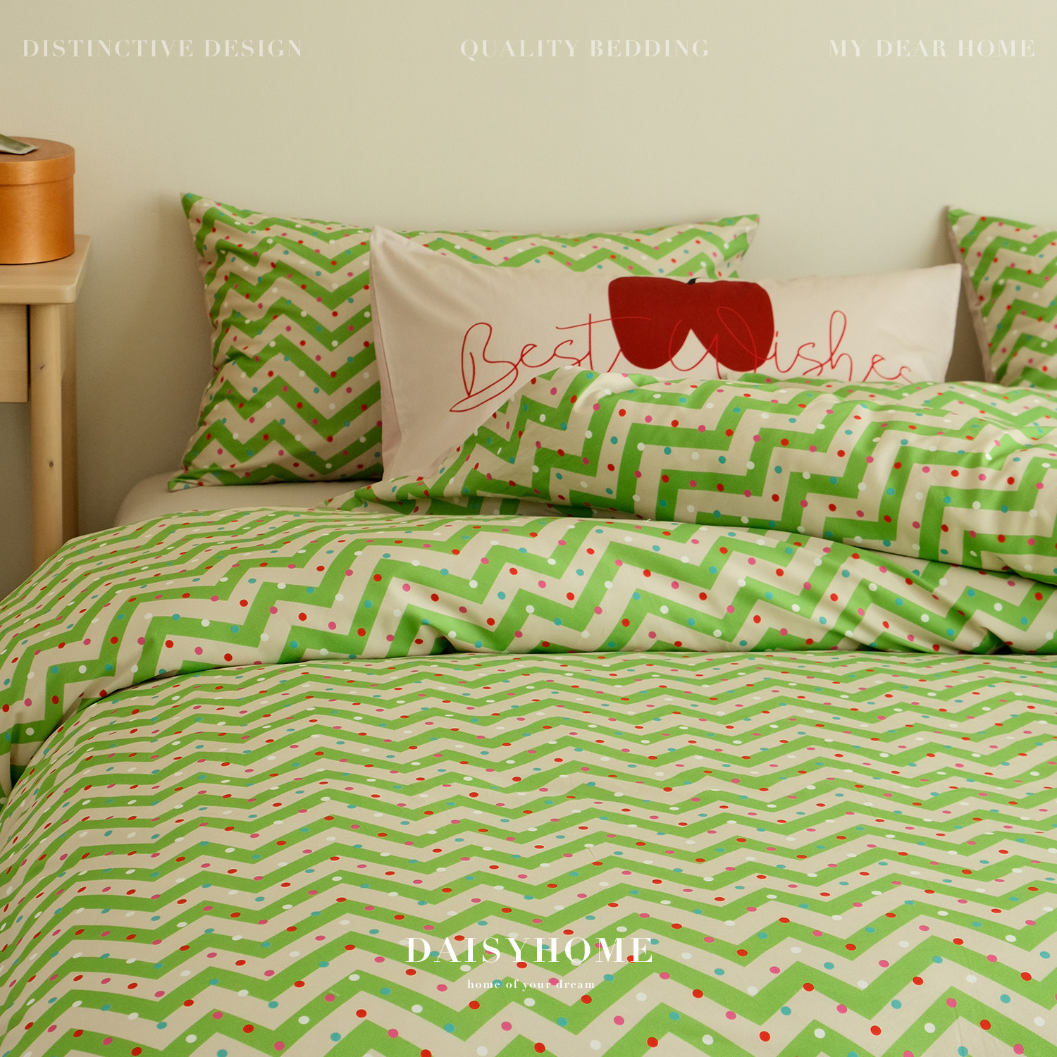 DAISYHOM春夏60支贡缎绿色波点波浪纹100全棉被套床单床上四件套