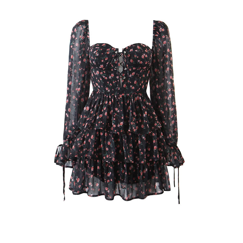 小谷姿雪纺长袖印花连衣裙胸前绑带叠层公主甜美气质碎花抹胸短裙