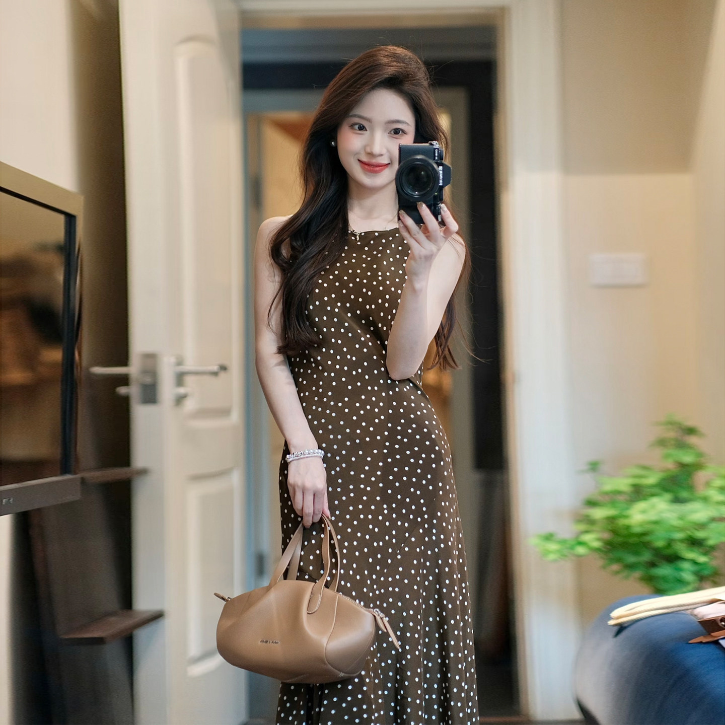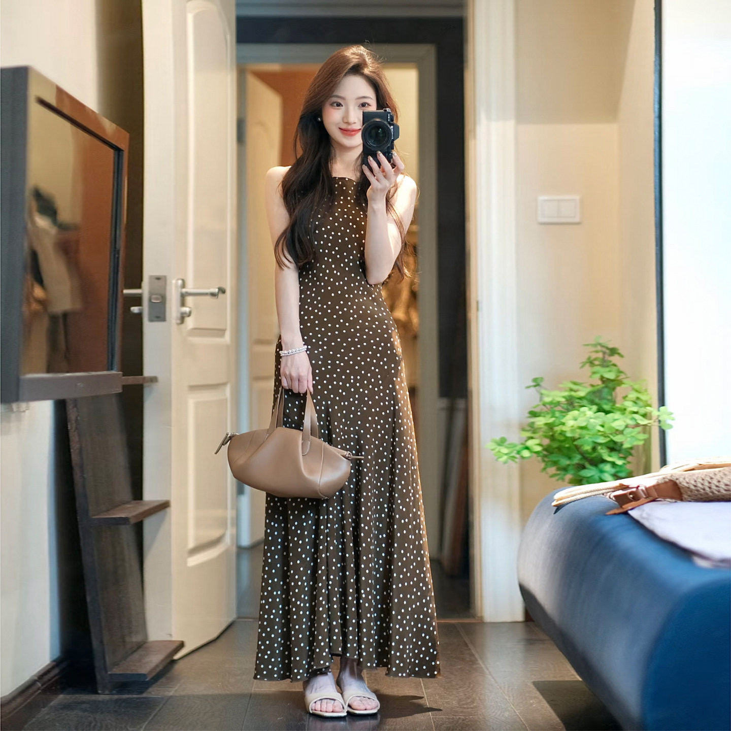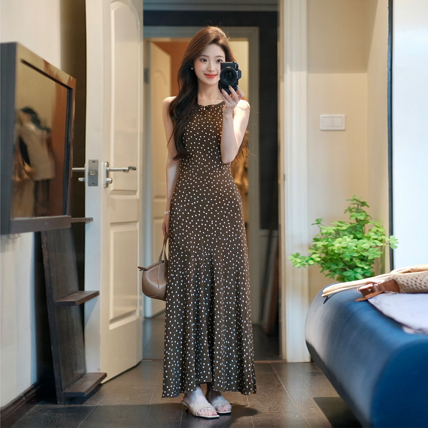 温柔风法式棕色波点无袖连衣裙垂感鱼尾长裙小个子通勤约会都好穿