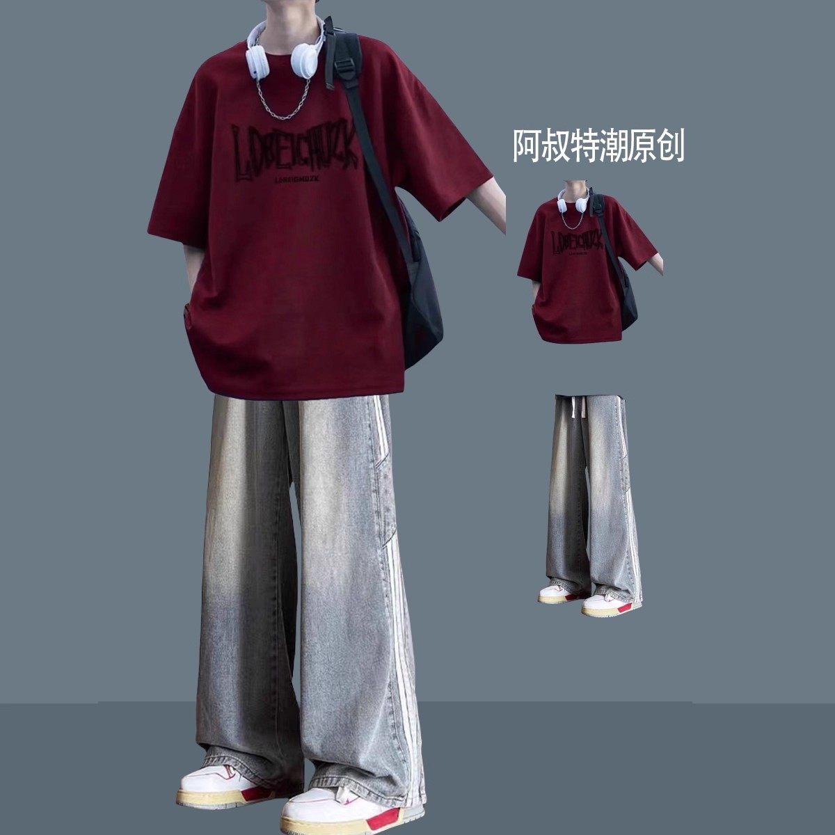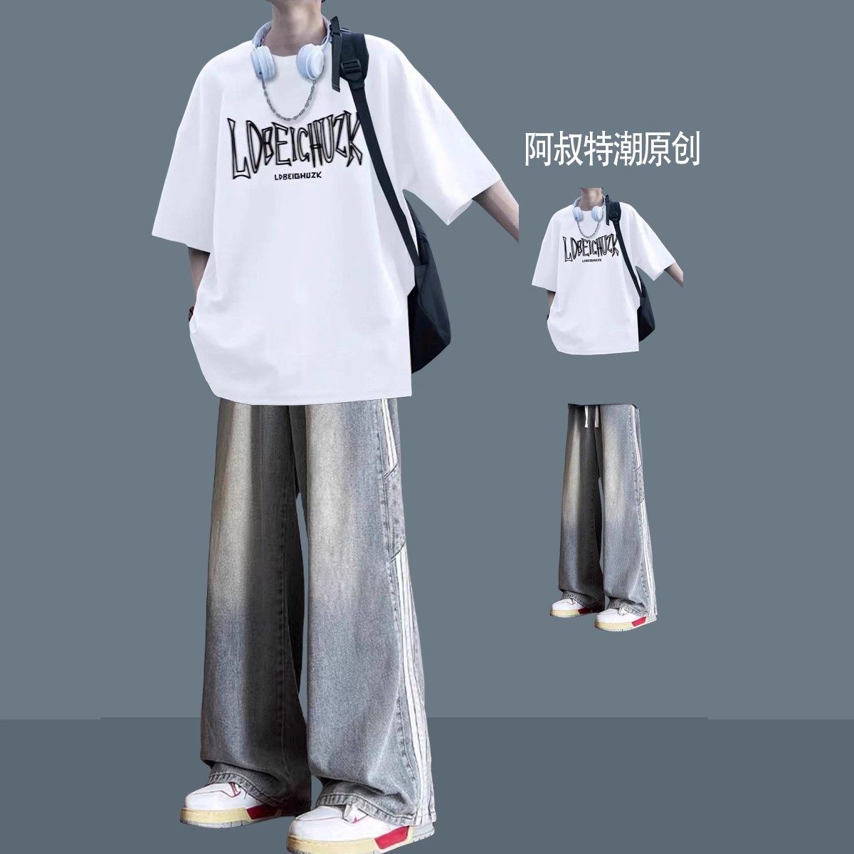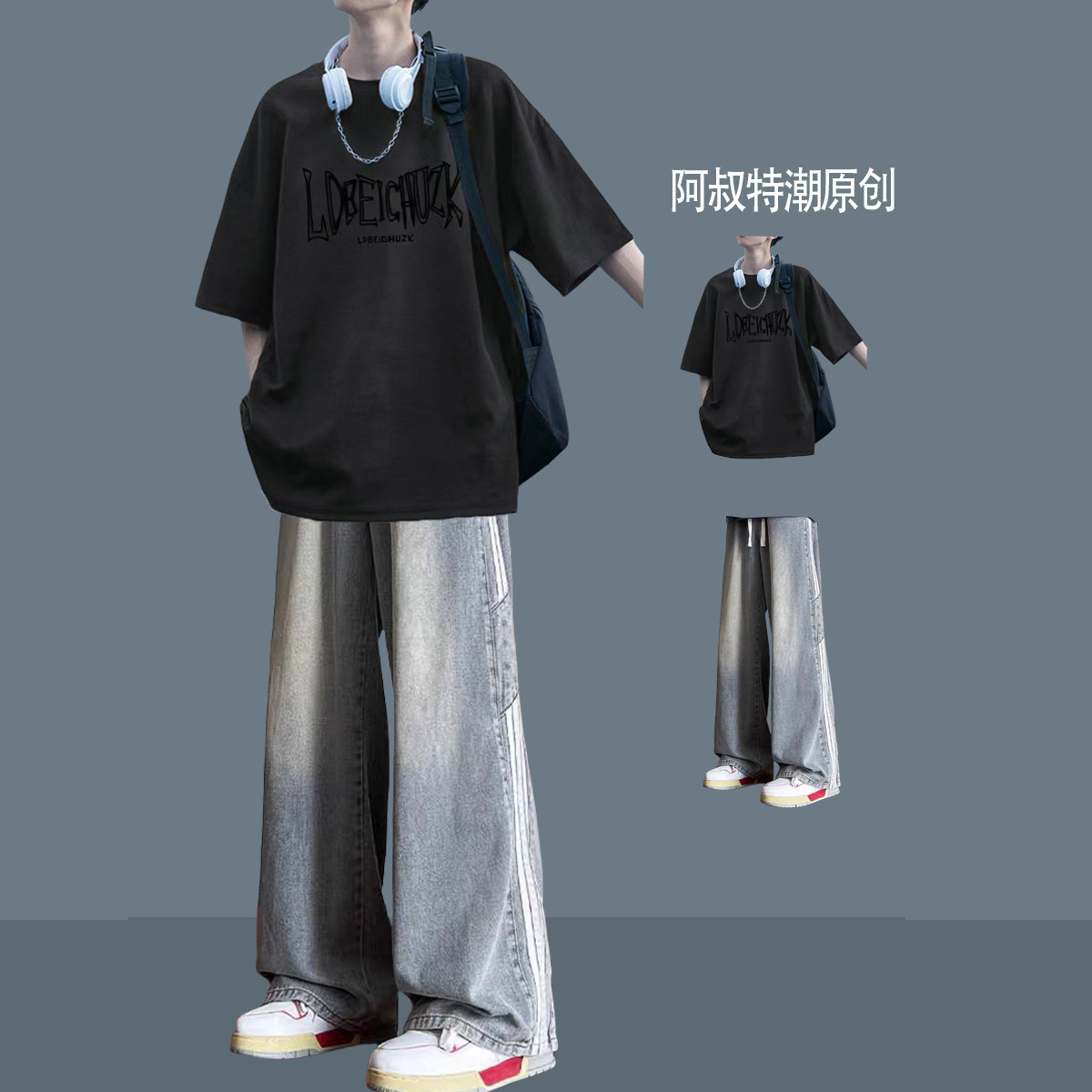 夏季青少年纯棉短袖印花t恤男套装宽松休闲男装一套搭配痞帅体恤