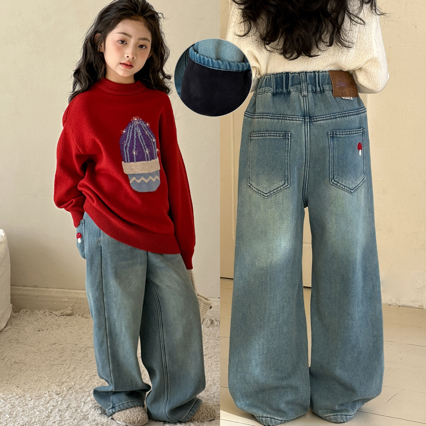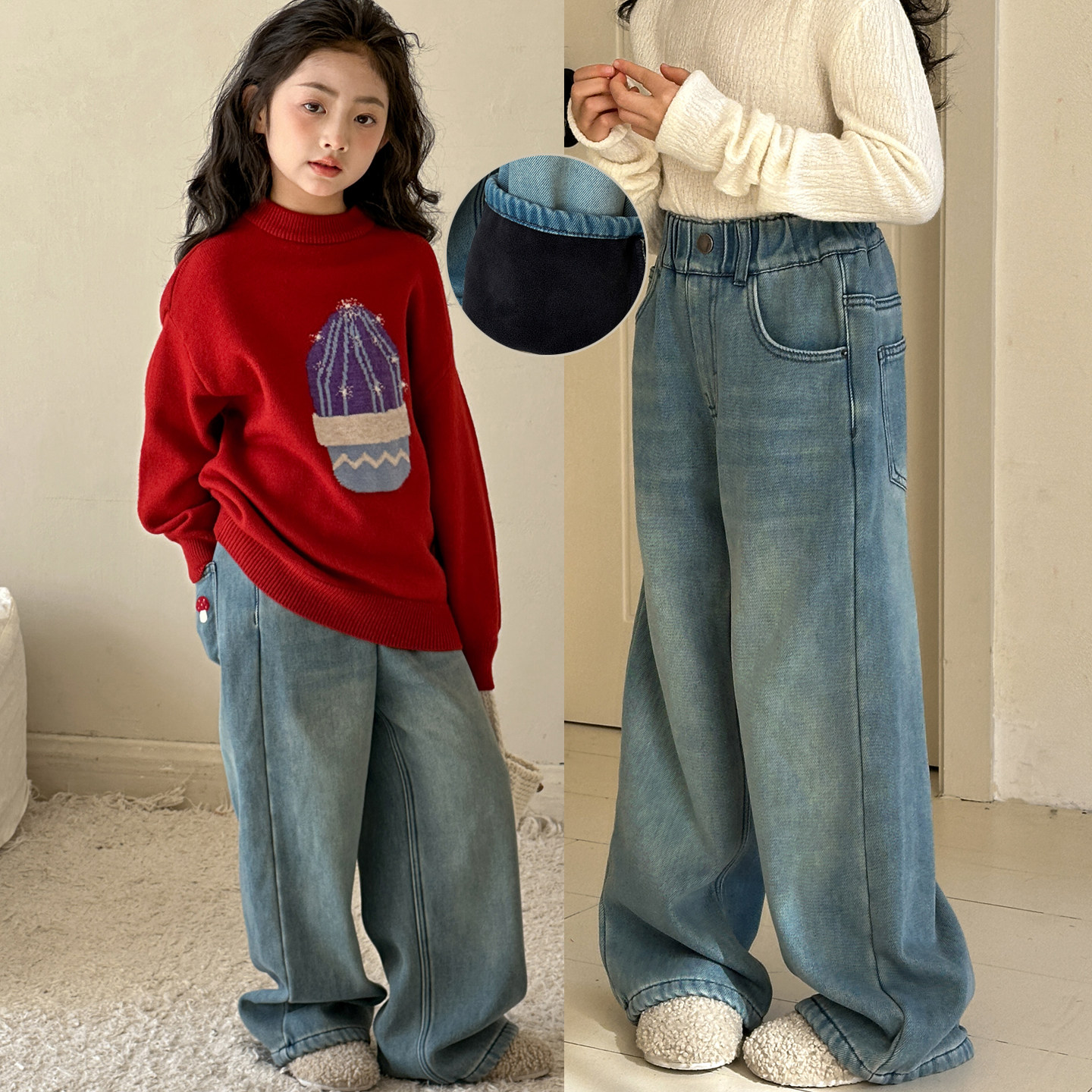 女童加绒牛仔裤2026冬季新款女大童裤子冬儿童阔腿裤一体绒直筒裤