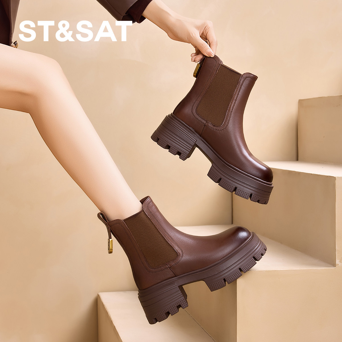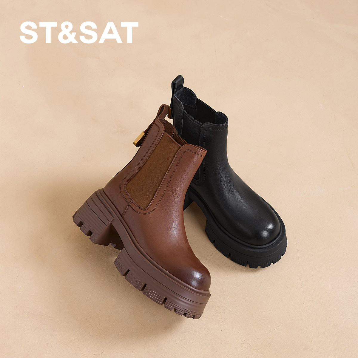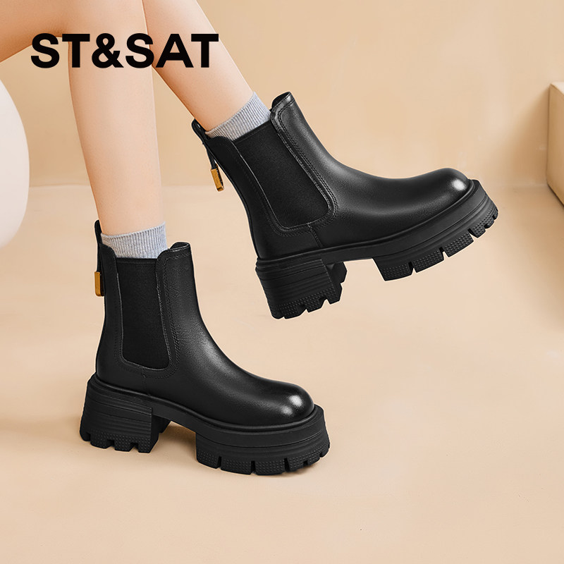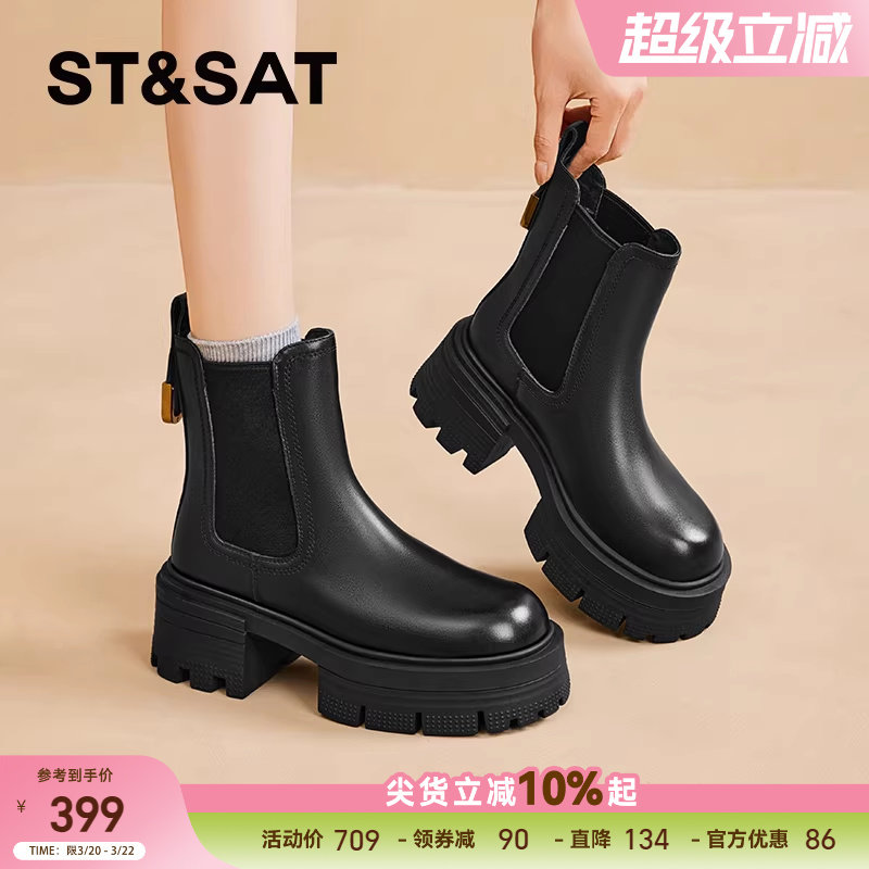 【真皮头层牛皮】星期切尔西靴女款粗跟厚底增高春秋不累脚马丁靴