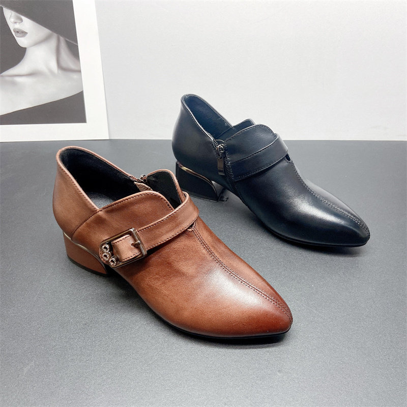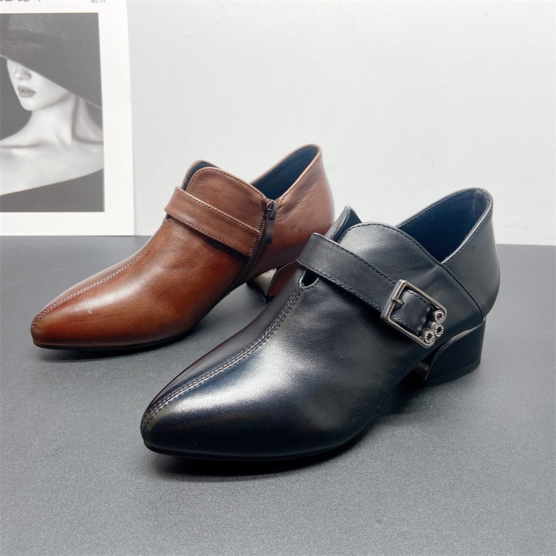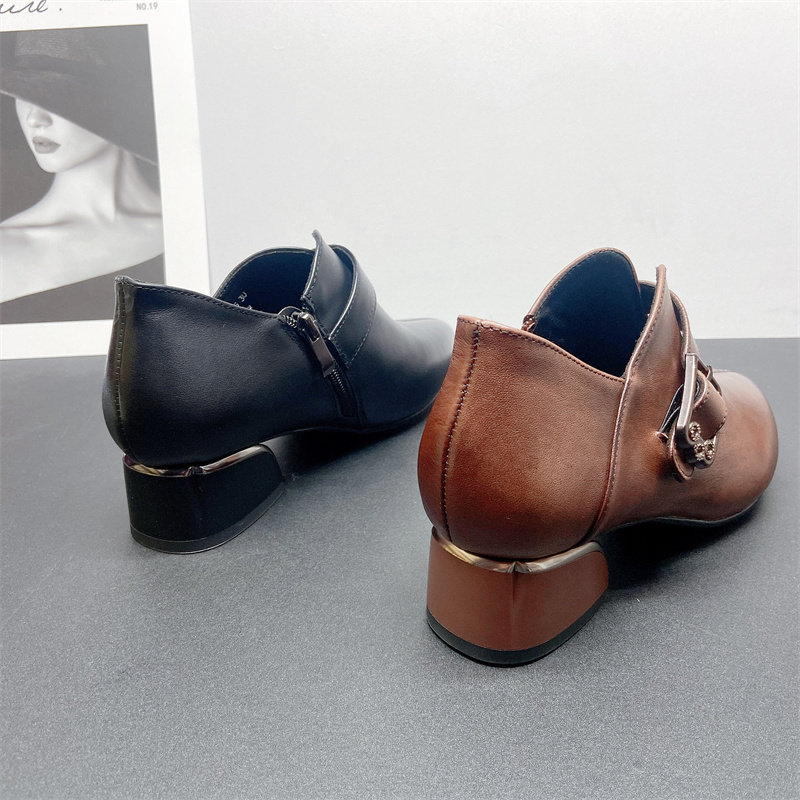 头层牛皮真皮2025秋深口单鞋女短靴裸靴粗低跟时尚妈妈单鞋小皮鞋