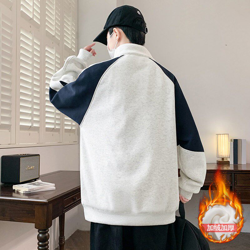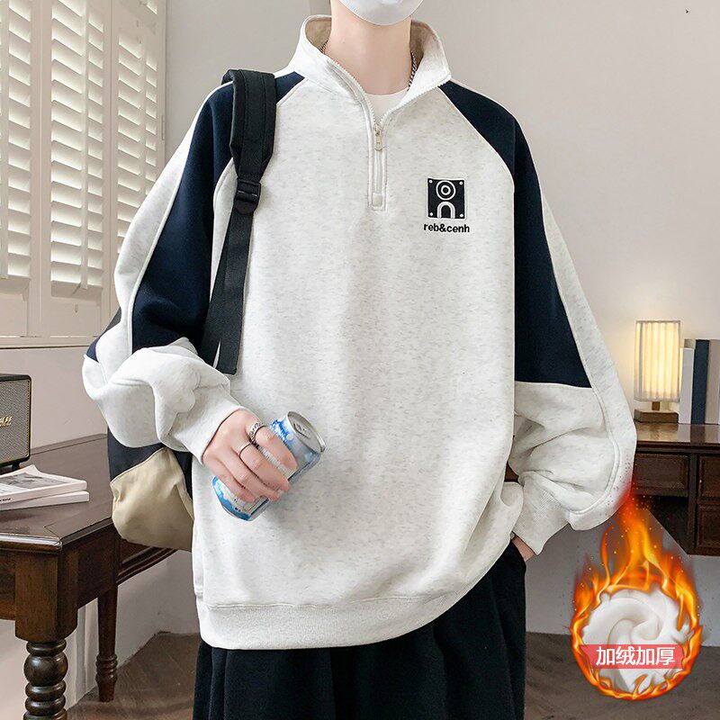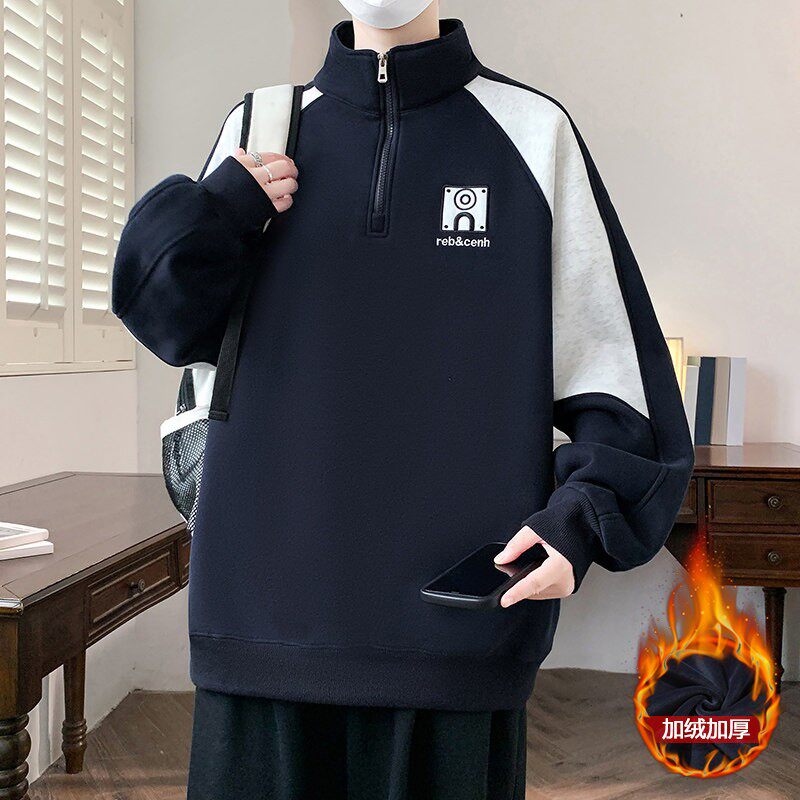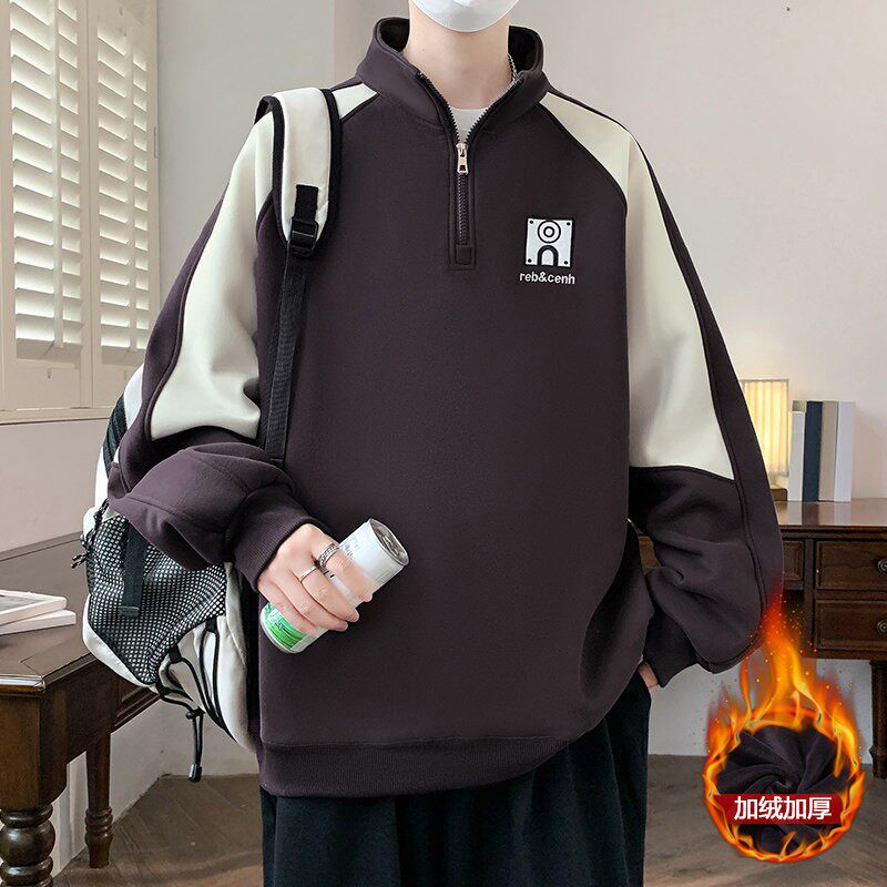 半拉链加绒卫衣男青少年秋冬季中学生拼色打底衫立领加厚内搭上衣
