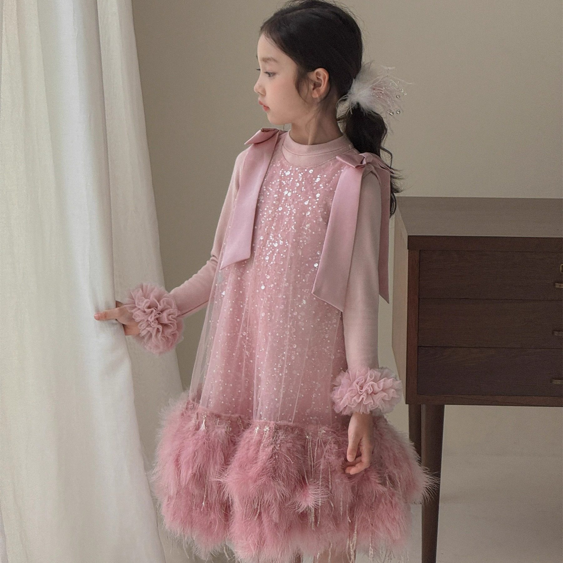 kw家女童粉色羽毛流苏连衣裙秋冬亮片蝴蝶结网纱生日礼服公主裙