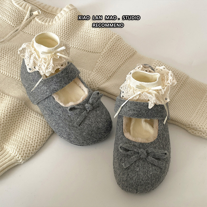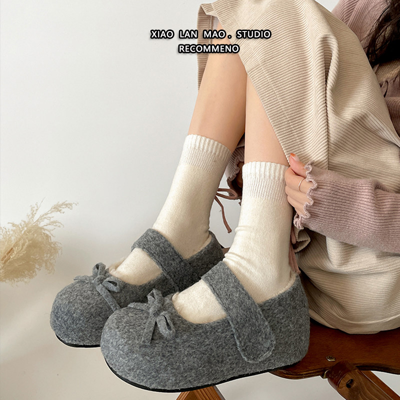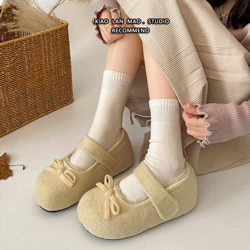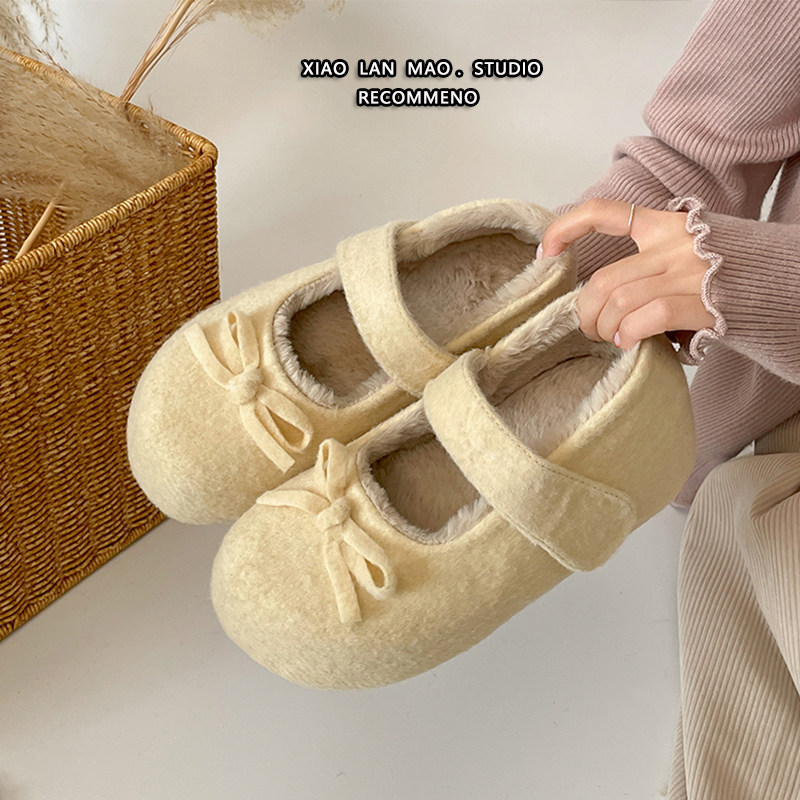蝴蝶结毛毛鞋加绒冬季玛丽珍浅口单鞋女内增高魔术贴保暖百搭棉鞋