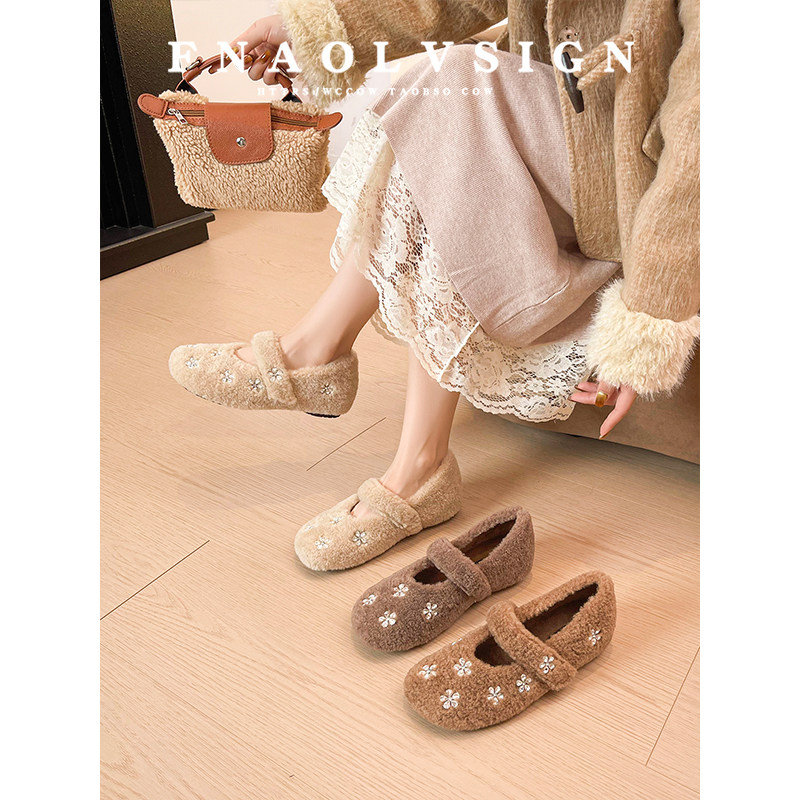 羊皮版~法式内增高加绒外穿毛毛鞋女保暖水钻一字带玛丽珍单鞋女