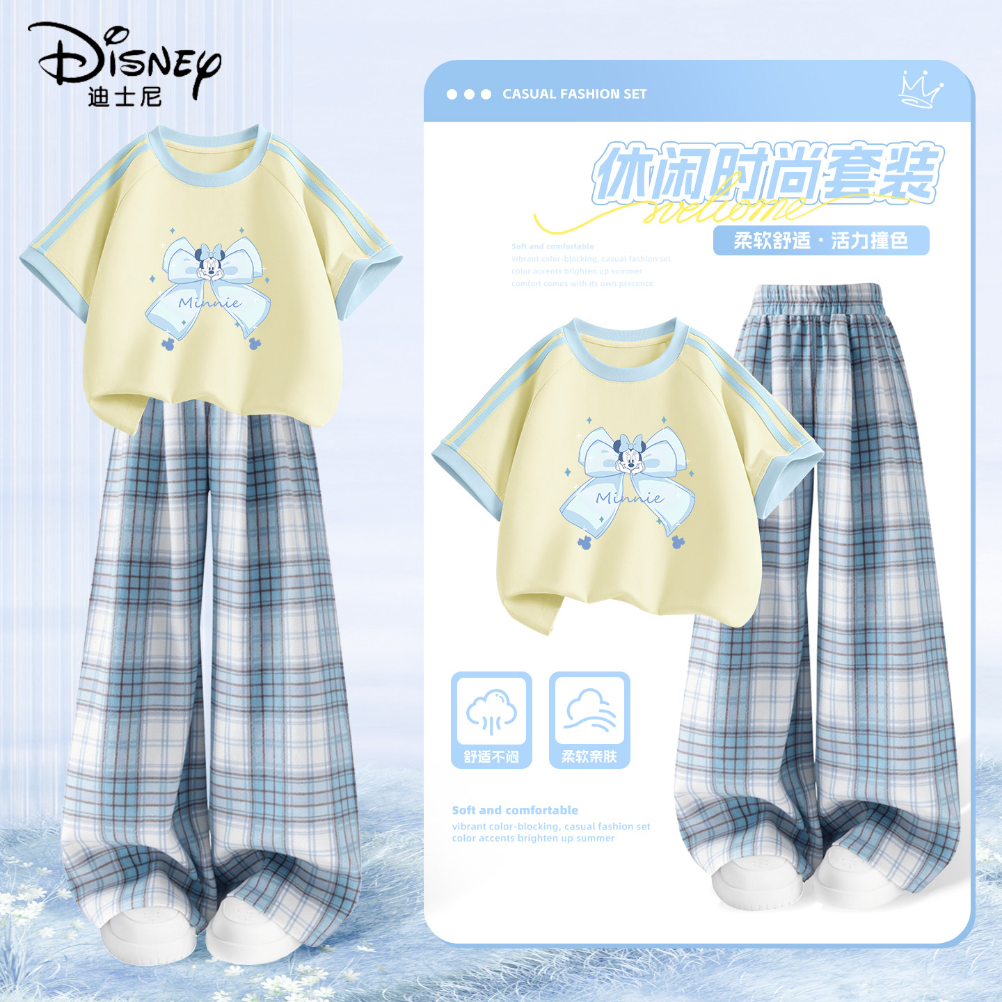 迪士尼童装儿童套装夏季薄款撞色女童短袖t恤2026新款大童休闲裤