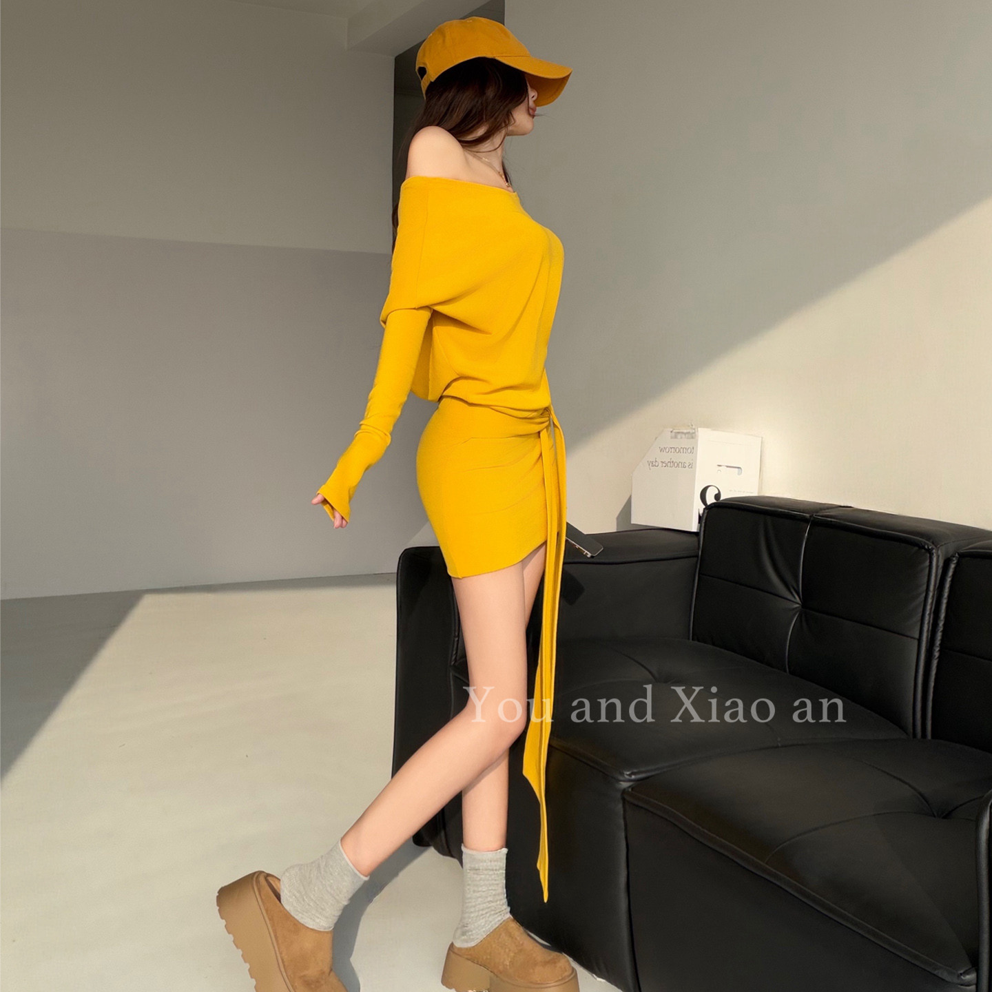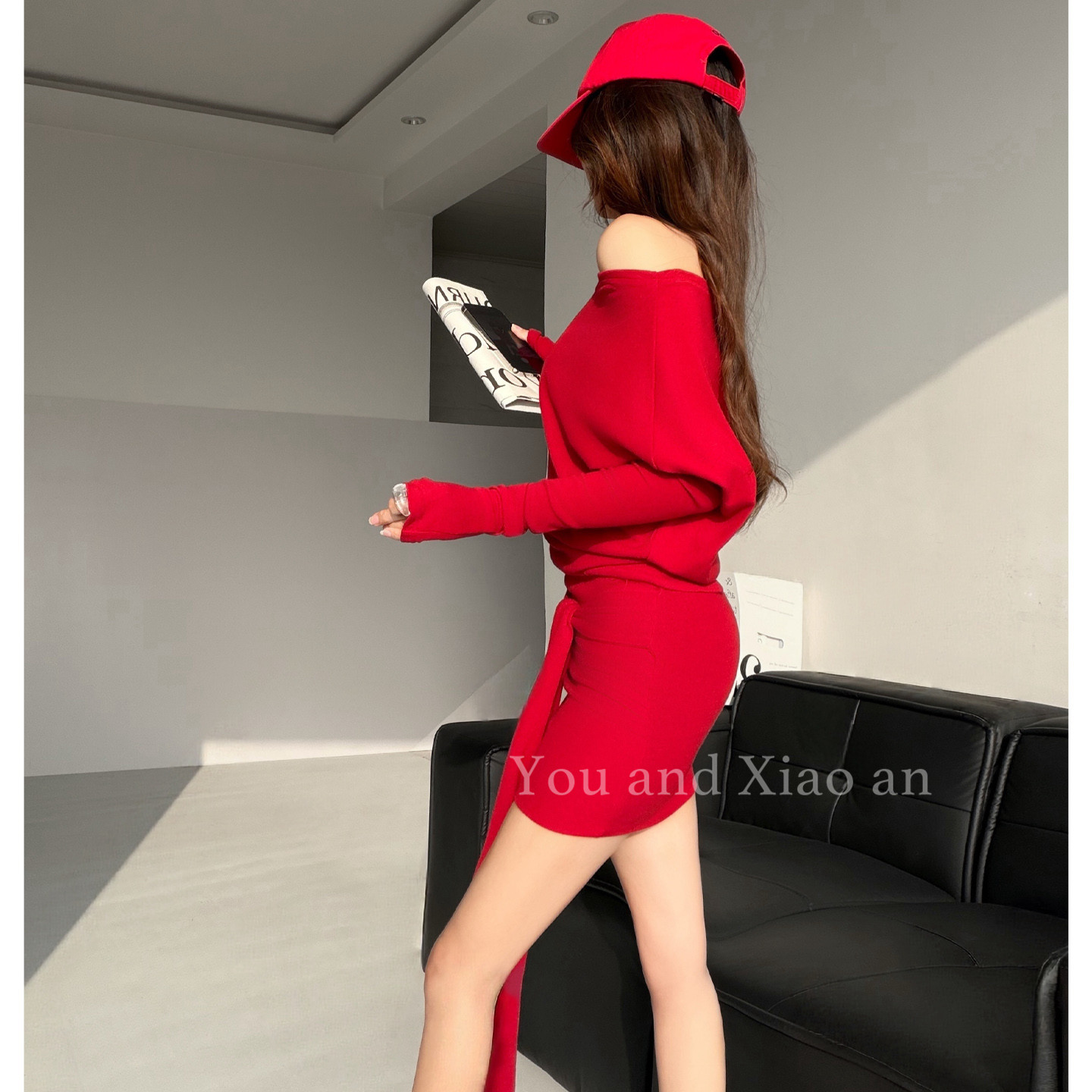 绝美腰臀~ABG风卡戴珊辣妹风性感斜肩长袖连衣裙女收腰包臀短裙子