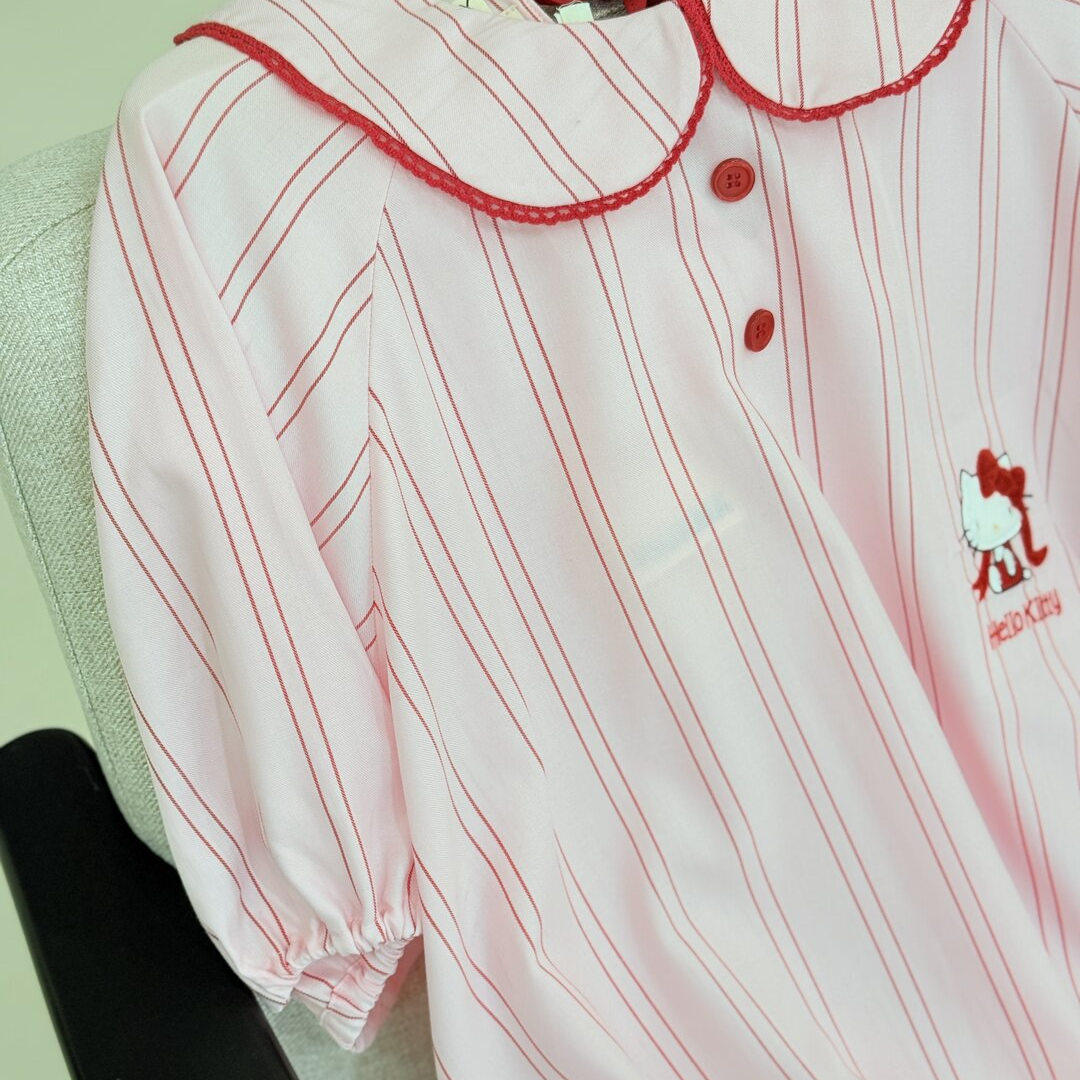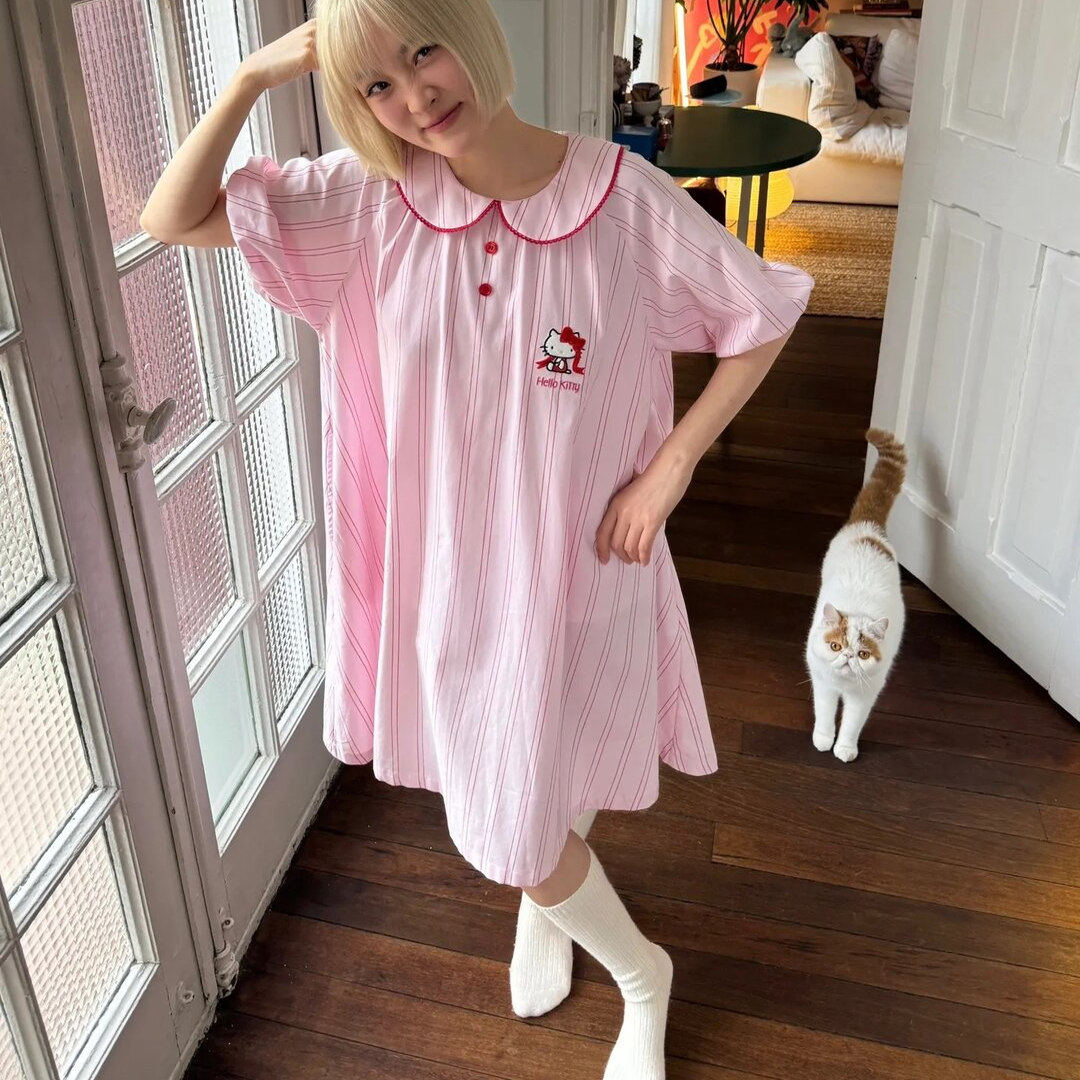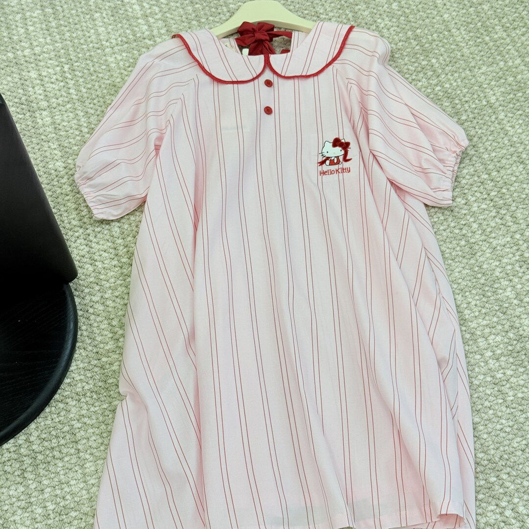 小众轻奢 韩版甜粉少女条纹Kitty睡裙女中长款春夏款家居服连衣裙