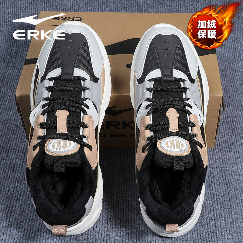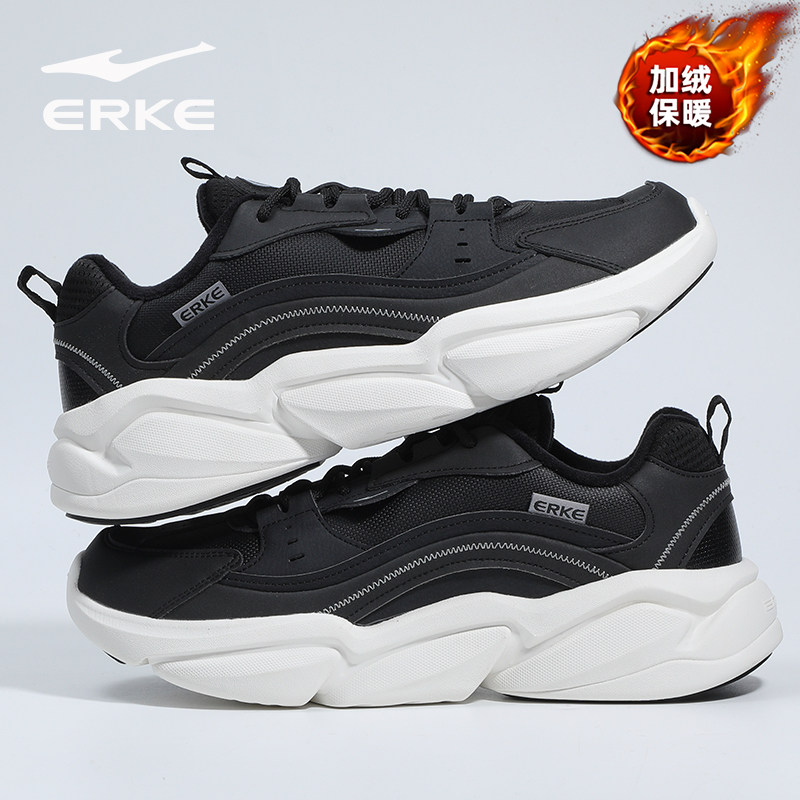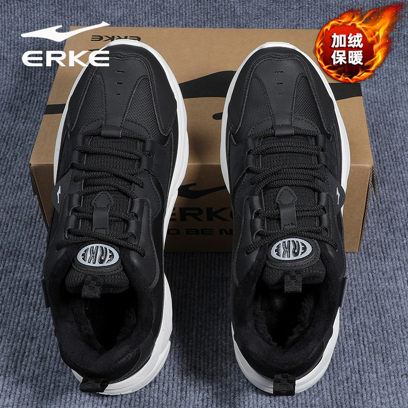 鸿星尔克加绒男鞋冬季新款黑色皮面保暖跑步鞋子男款软底运动鞋子