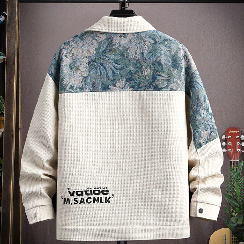 华夫格外套男春秋款拼色民族风翻领休闲夹克男士2026新款春装衣服