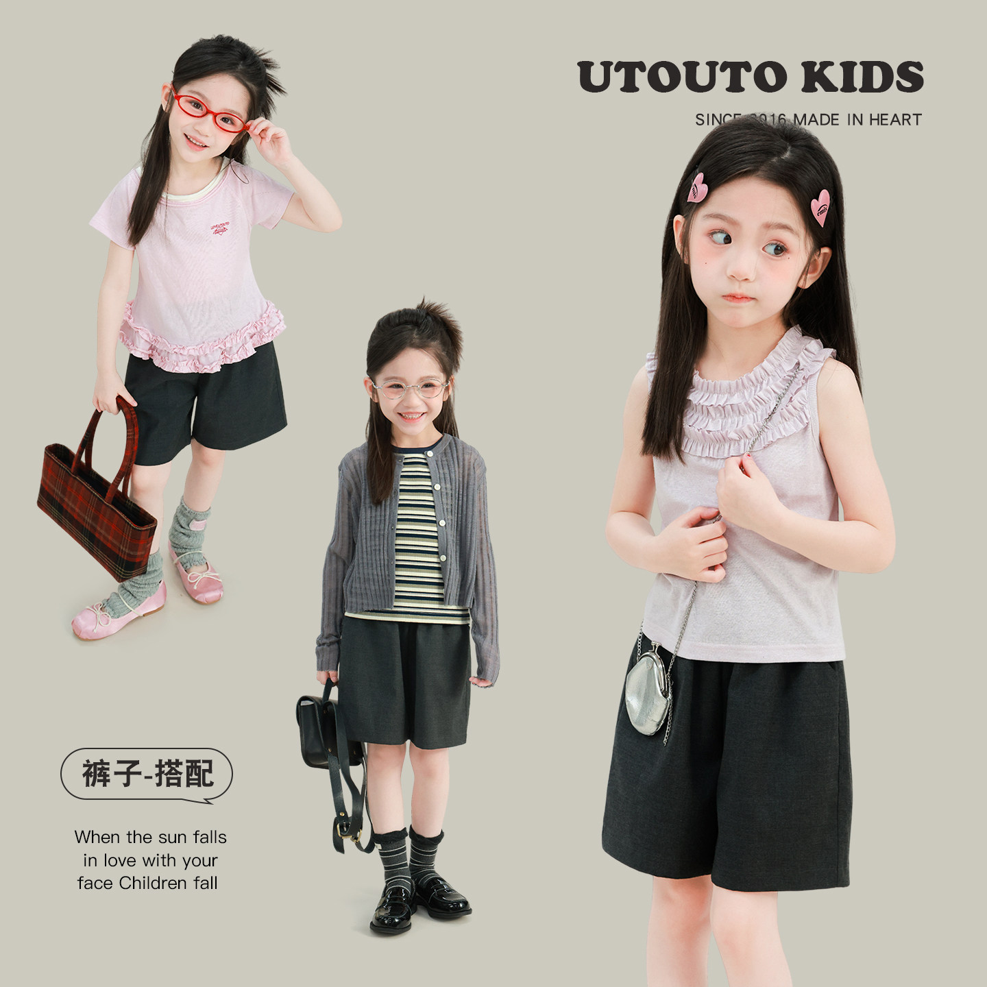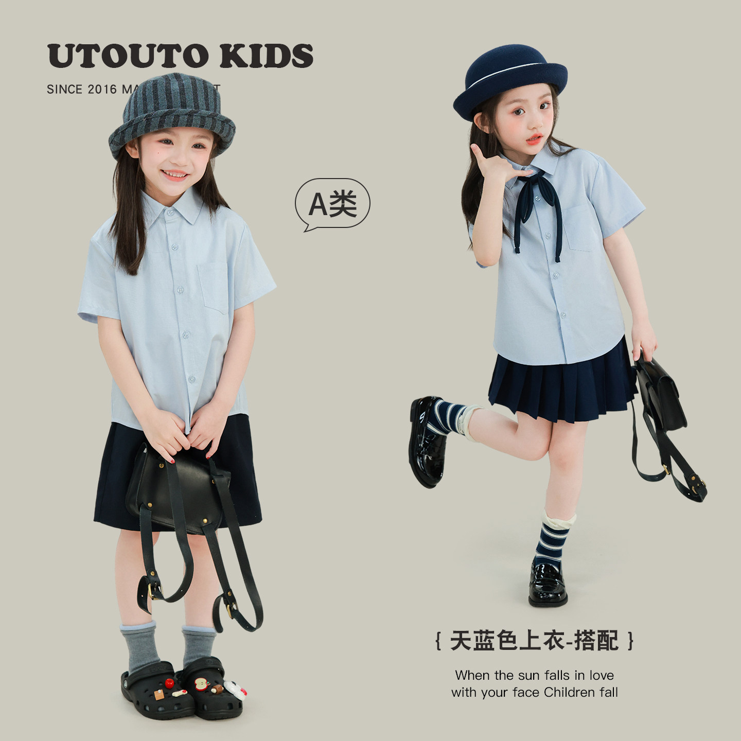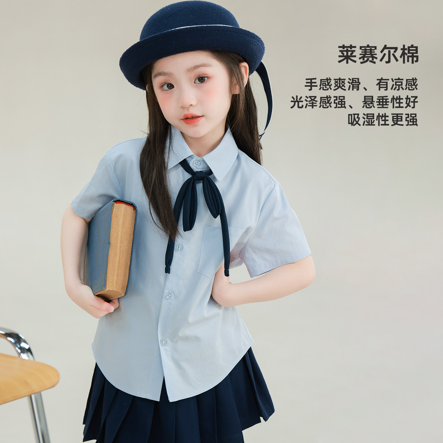 大耳象女童纯色翻领衬衫/纯色学院风短裤2026夏季新款薄休闲套装