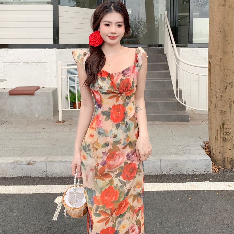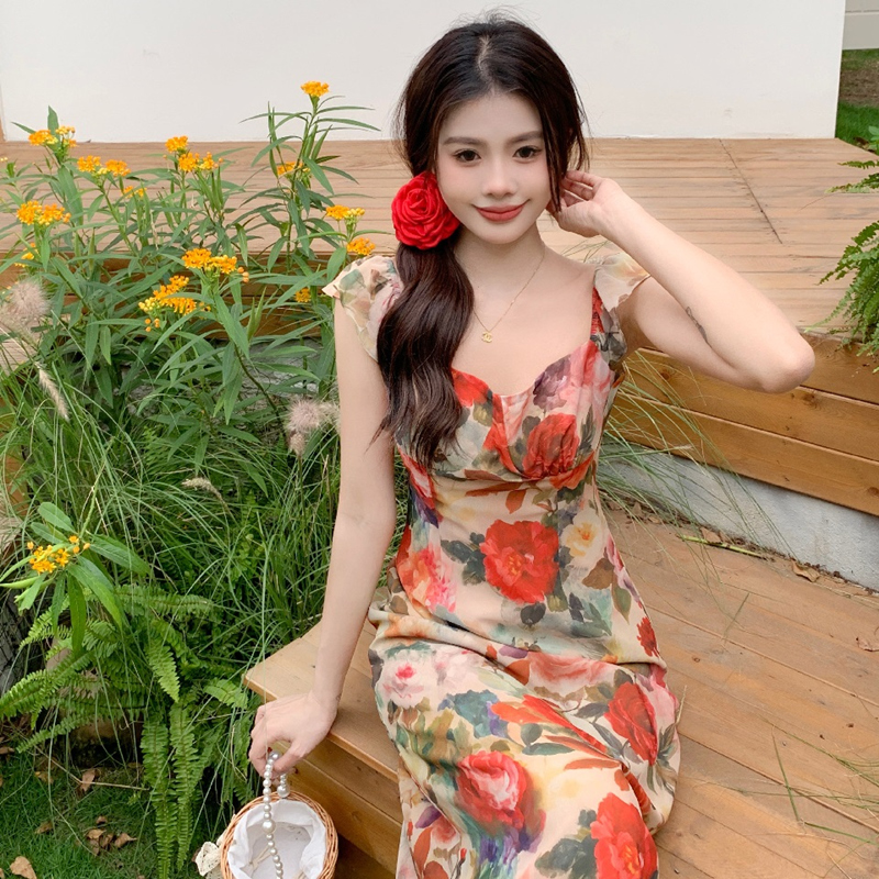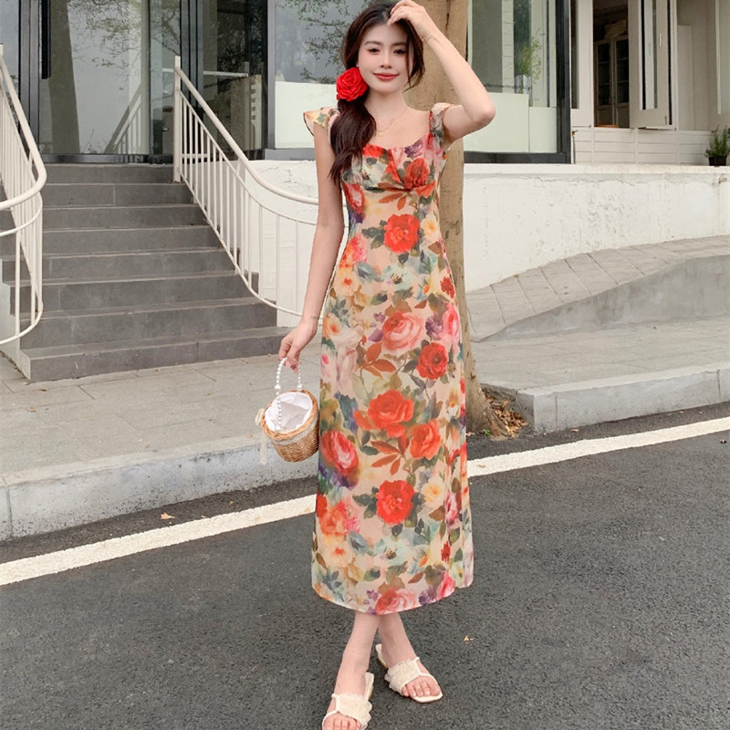 大码胖mm纯欲复古方领收腰碎花连衣裙女春夏气质显瘦海边度假长裙