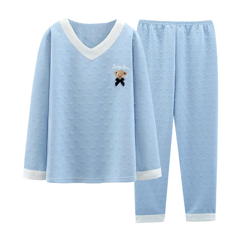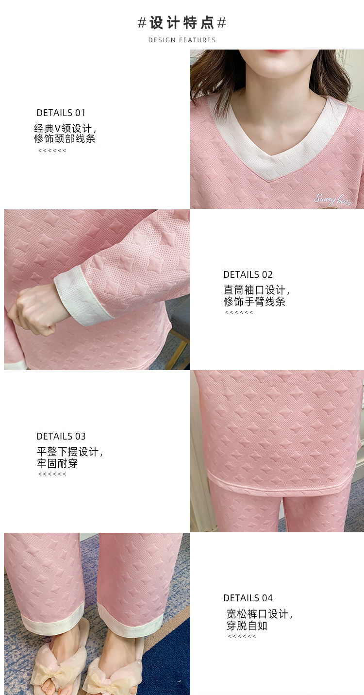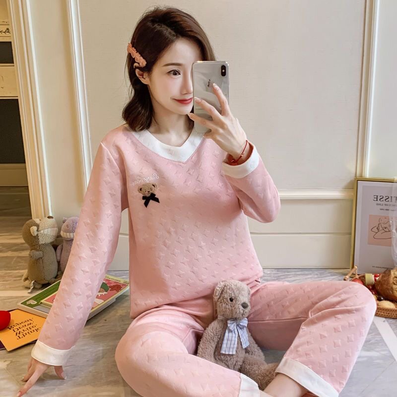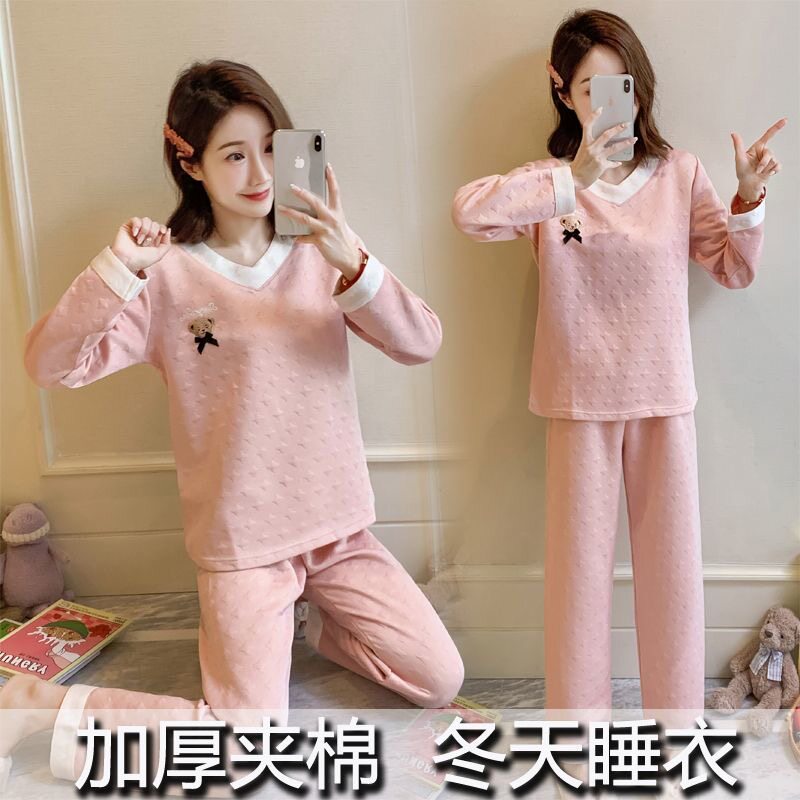秋冬加厚夹层空气棉睡衣女新款纯色套头小个子家居服套装月子服