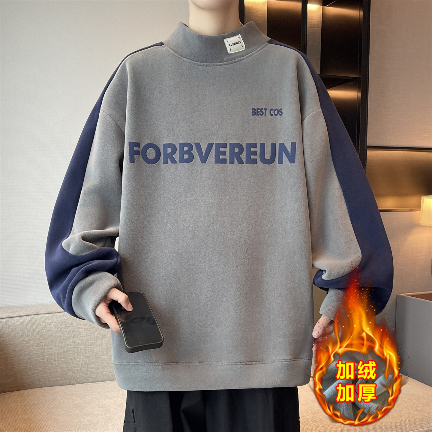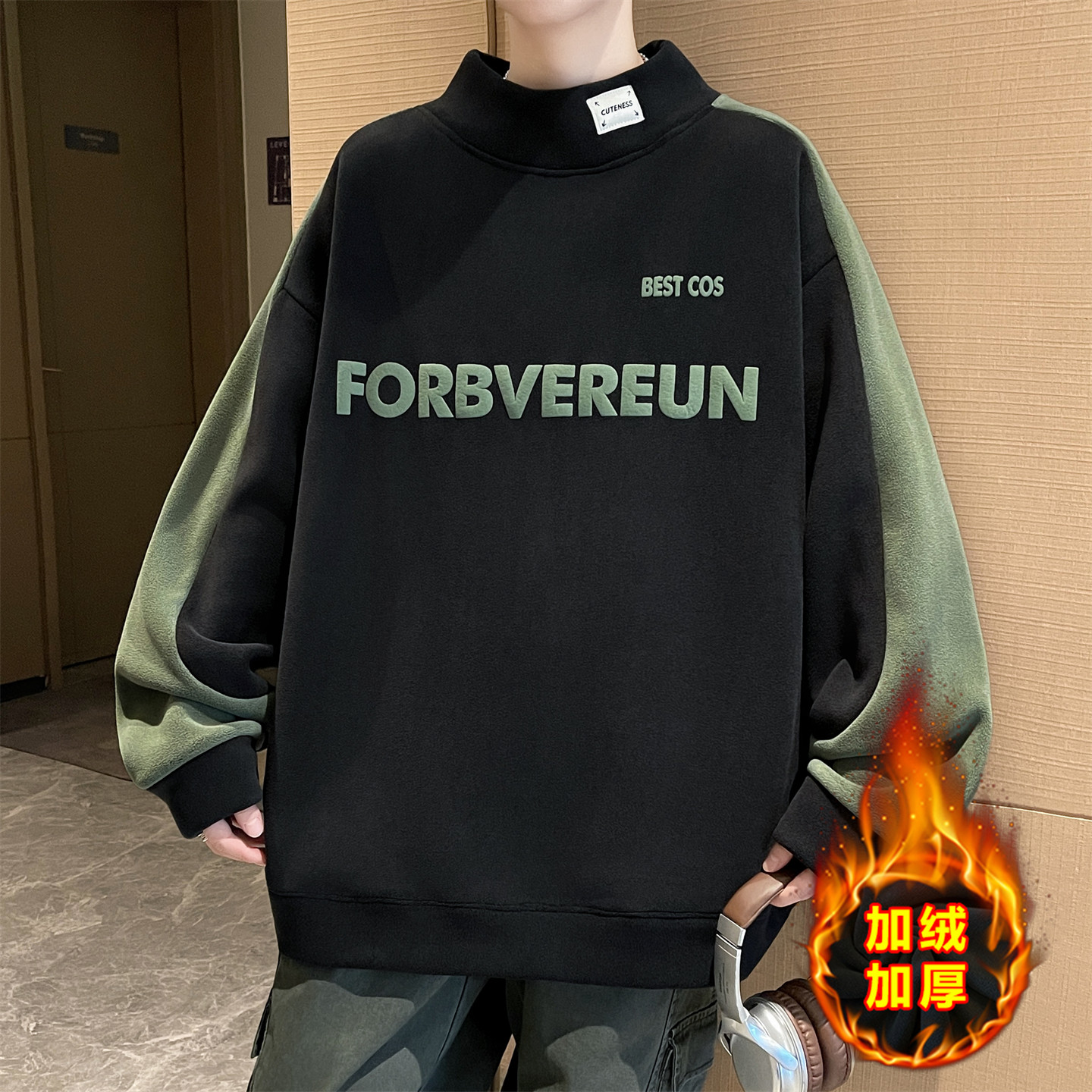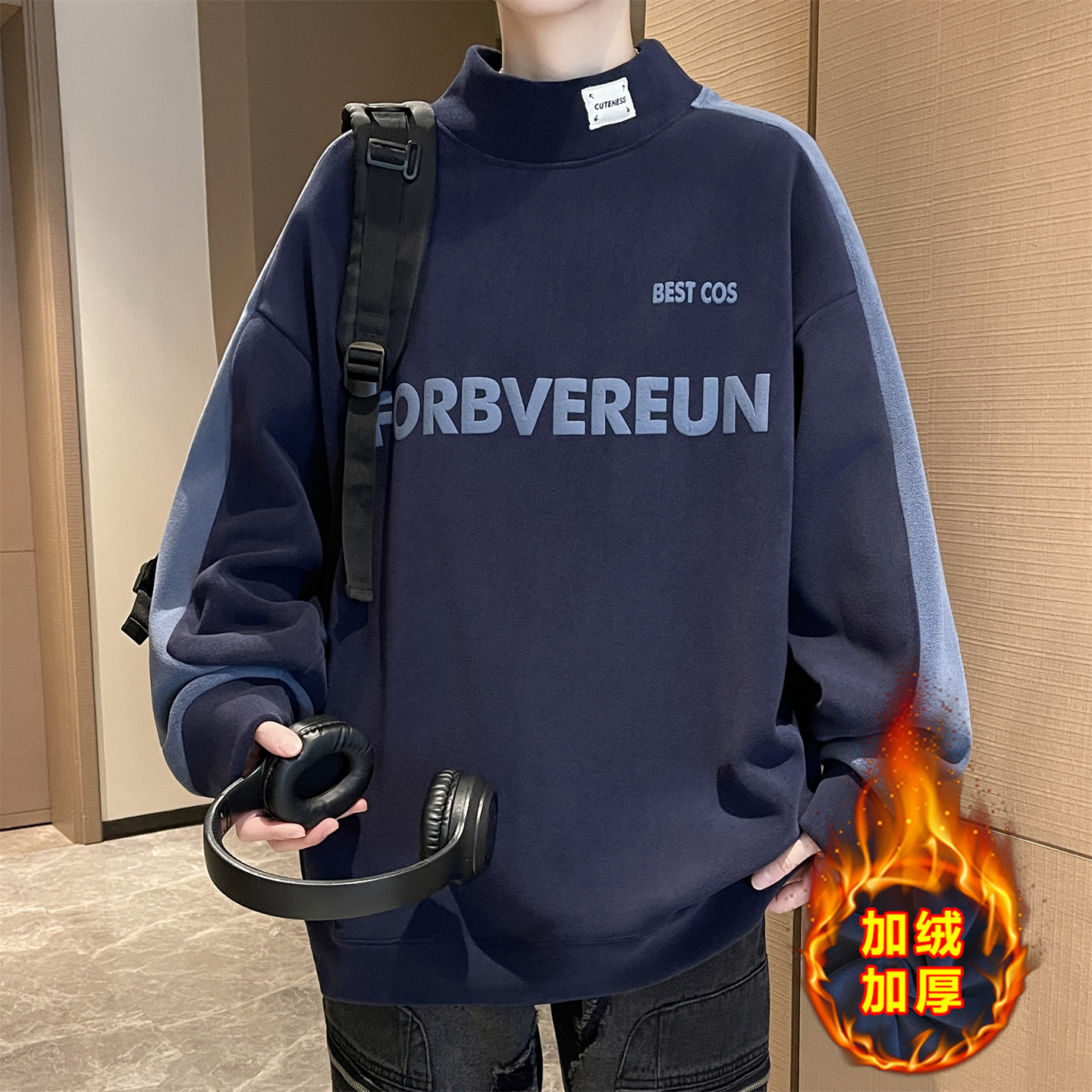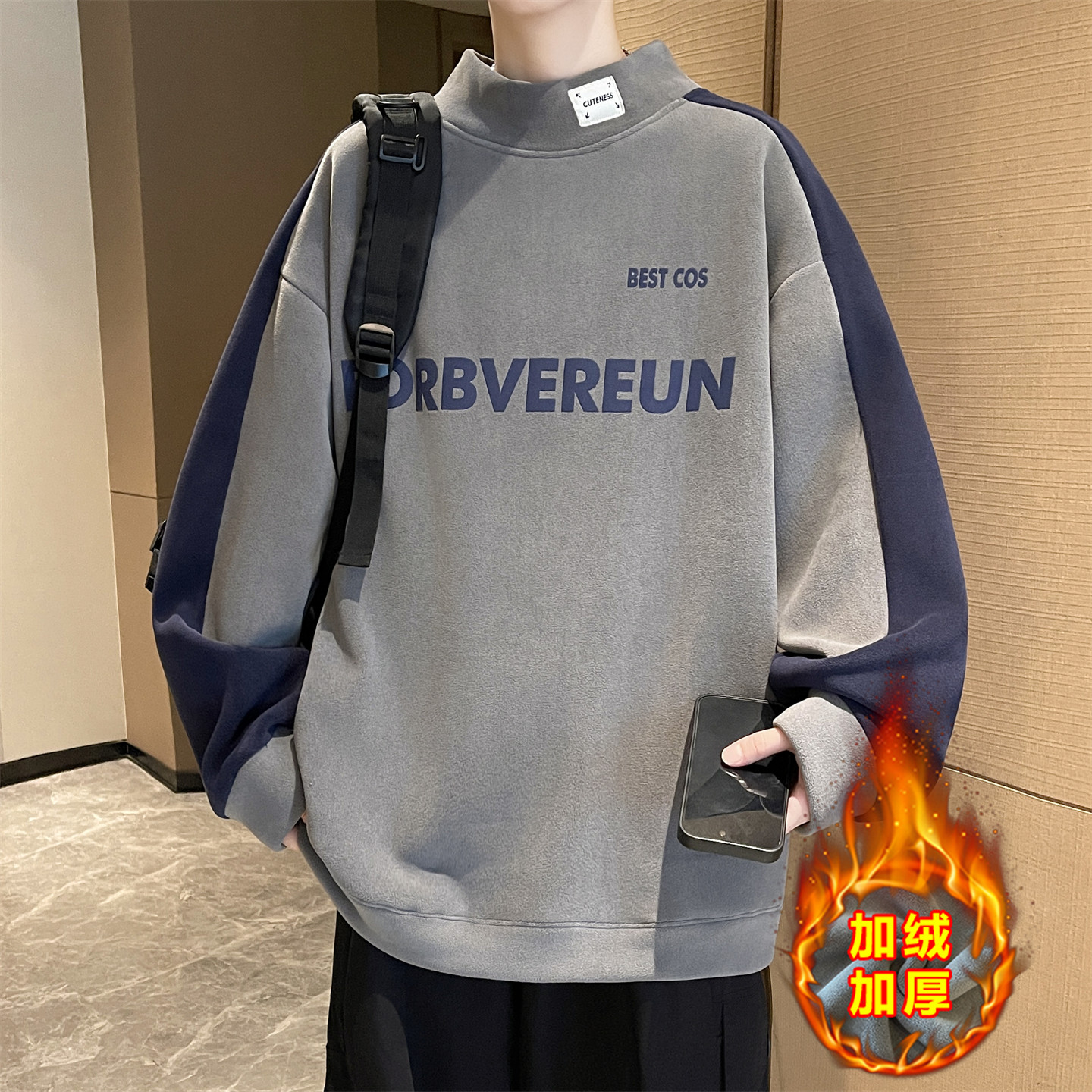 奥粒绒半高领卫衣男款青少年加绒加厚初高中学生保暖打底上衣内搭