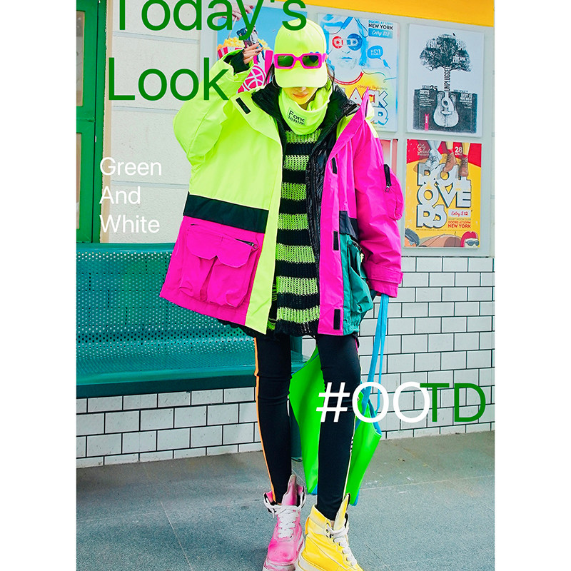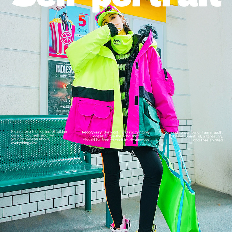 311线报网描述:荧光绿玫红拼接连帽休闲中长保暖羽绒服棉服