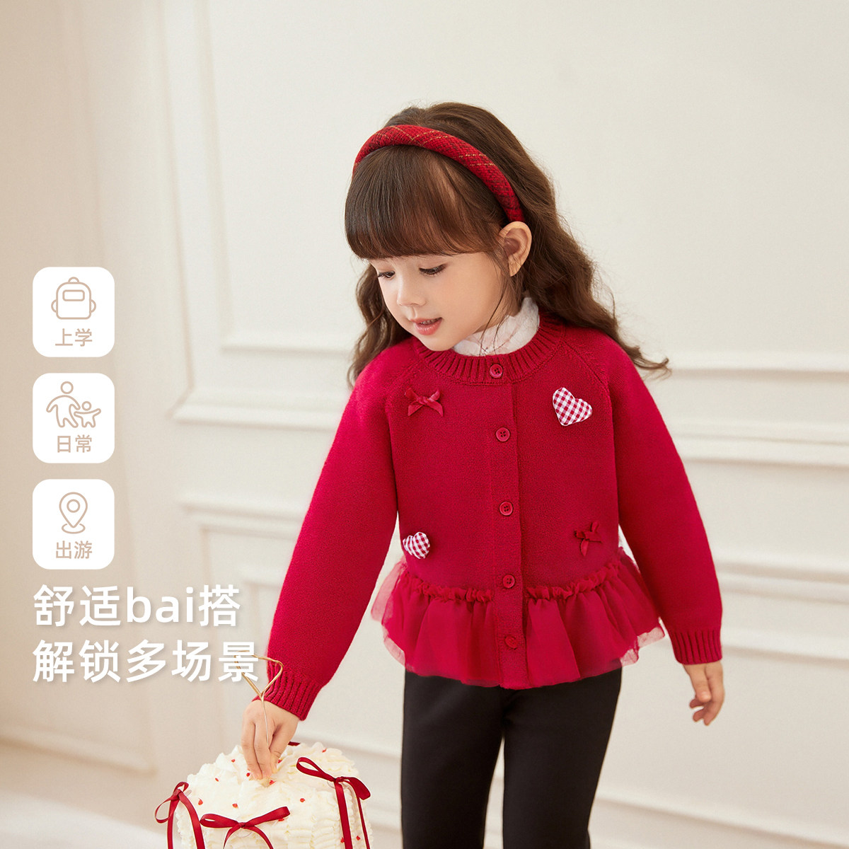 [抗菌远红外]女童毛衣2026新款宝宝红色女小童洋气开衫儿童针织衫