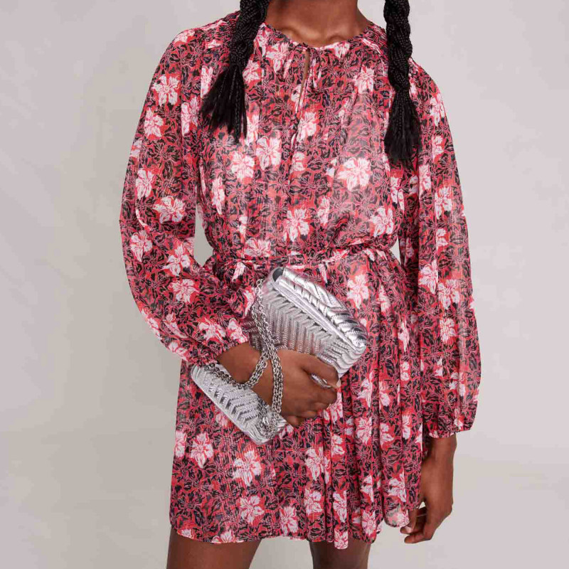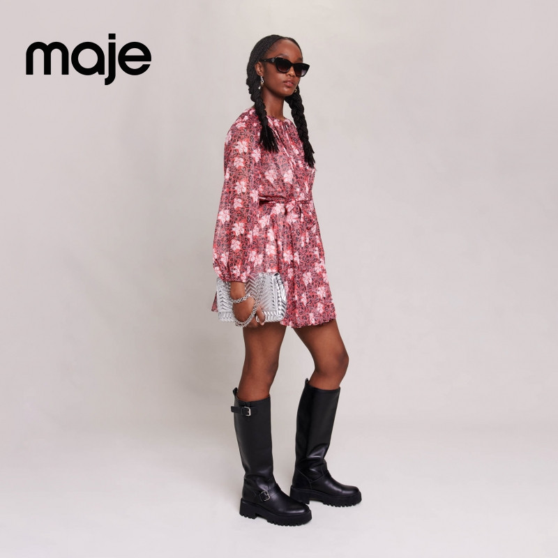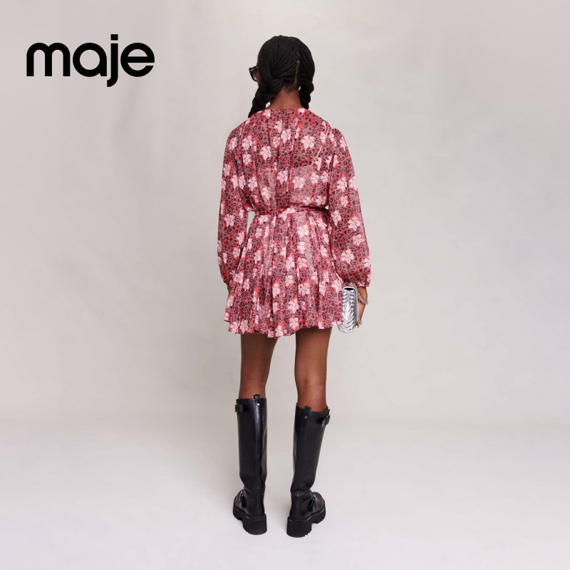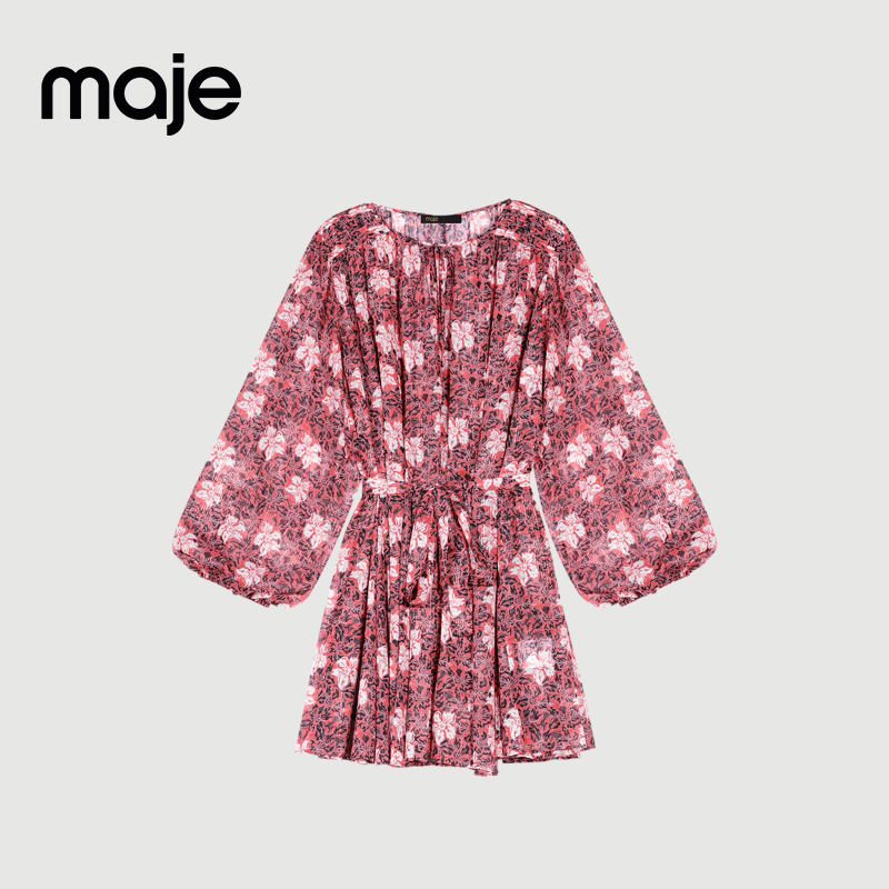 Maje Outlets秋冬女装法式薄纱碎花系带收腰V领长袖短款连衣裙