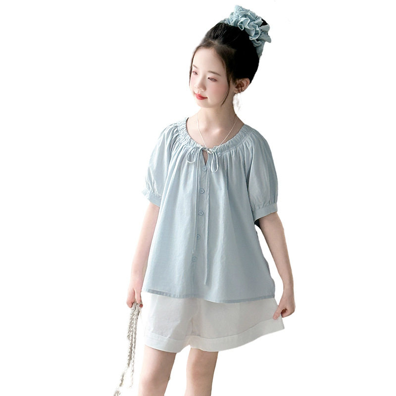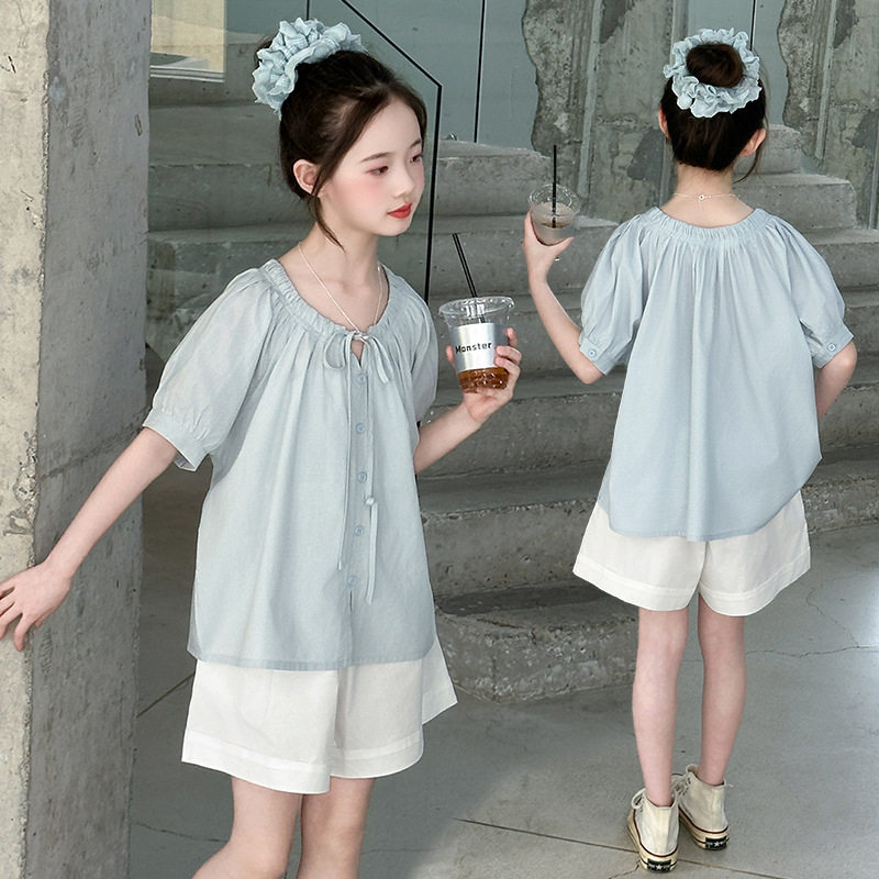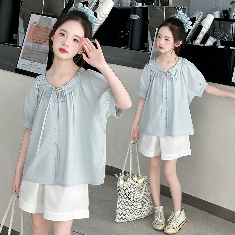 女童夏套装2026新款儿童洋气时髦短袖衬衫套装休闲短裤两件套12岁