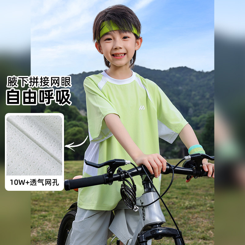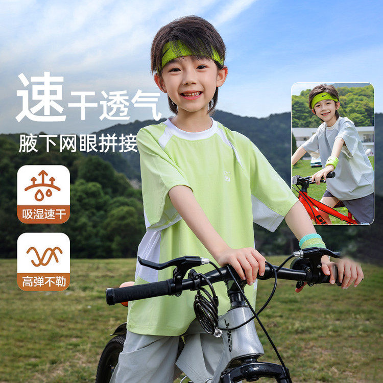 运动风圆领短袖T恤男童荧光绿拼接速干透气宽松户外2026透气薄款