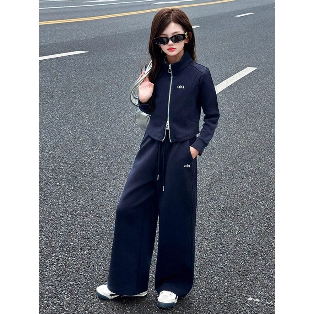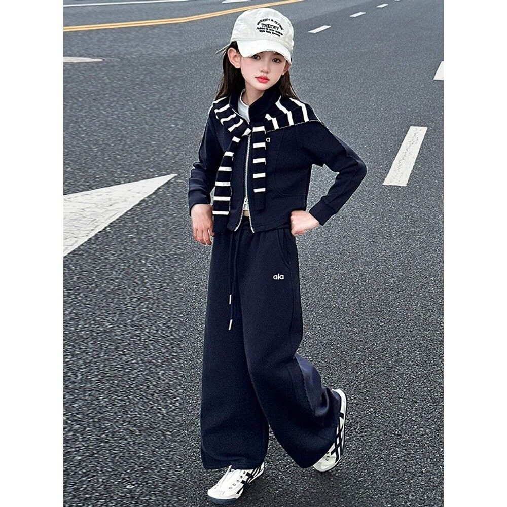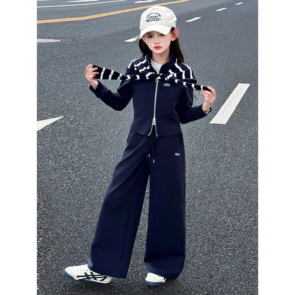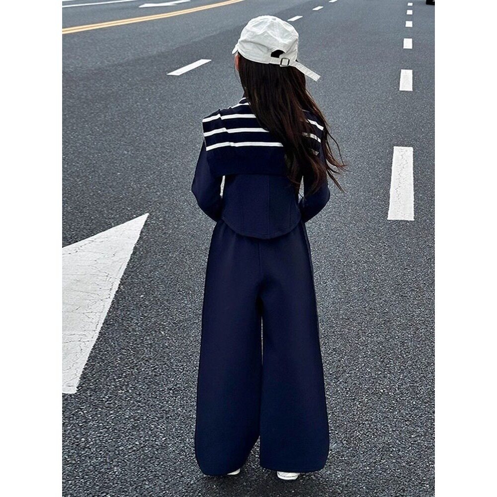 女童春秋休闲套装2026新款大童条纹披肩外套阔腿裤春装运动两件套