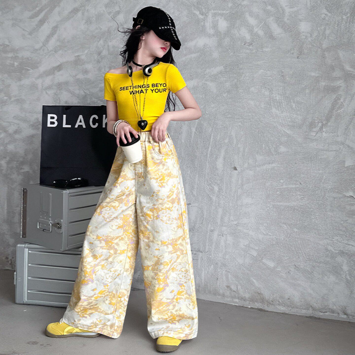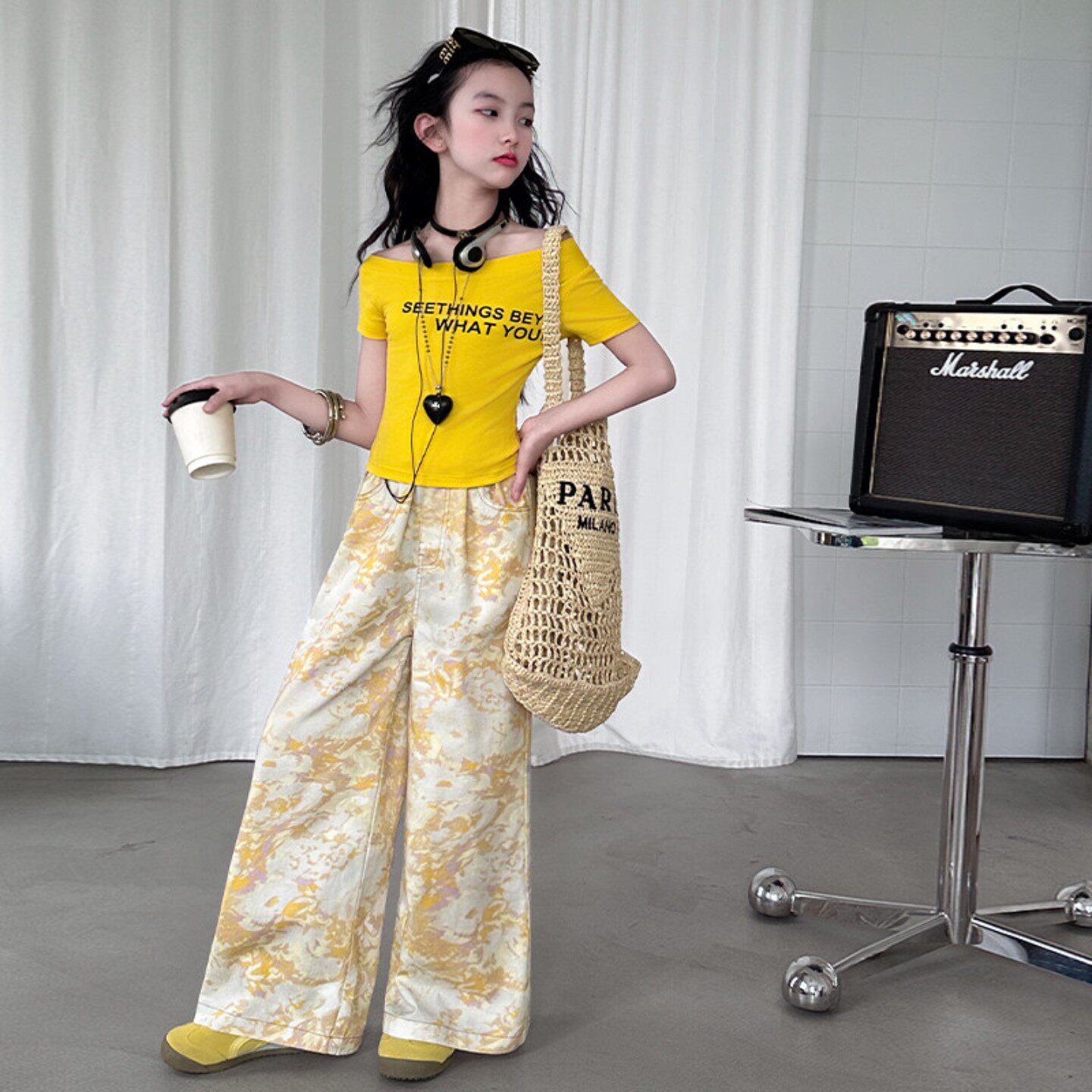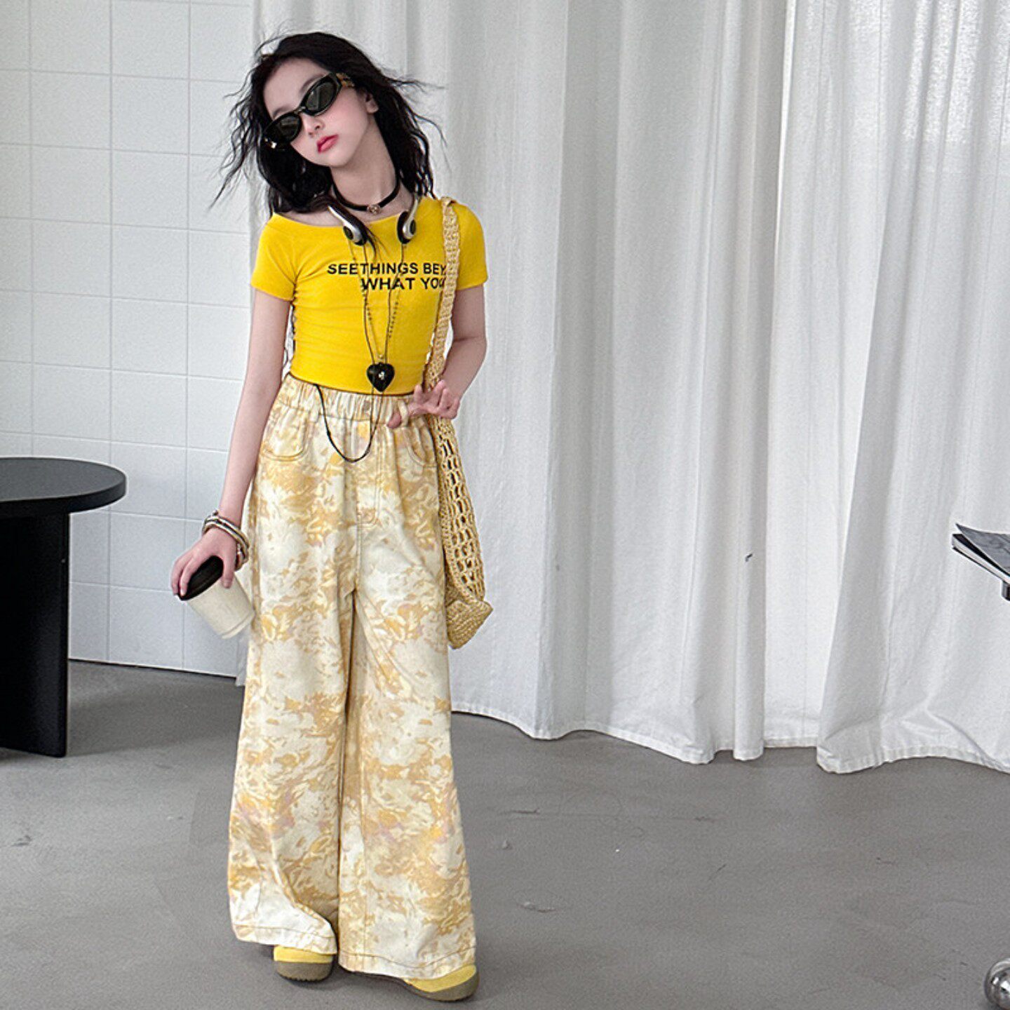 女童夏装儿童露肩短袖印花长裤套装2025夏季新款中大童tT恤阔腿裤