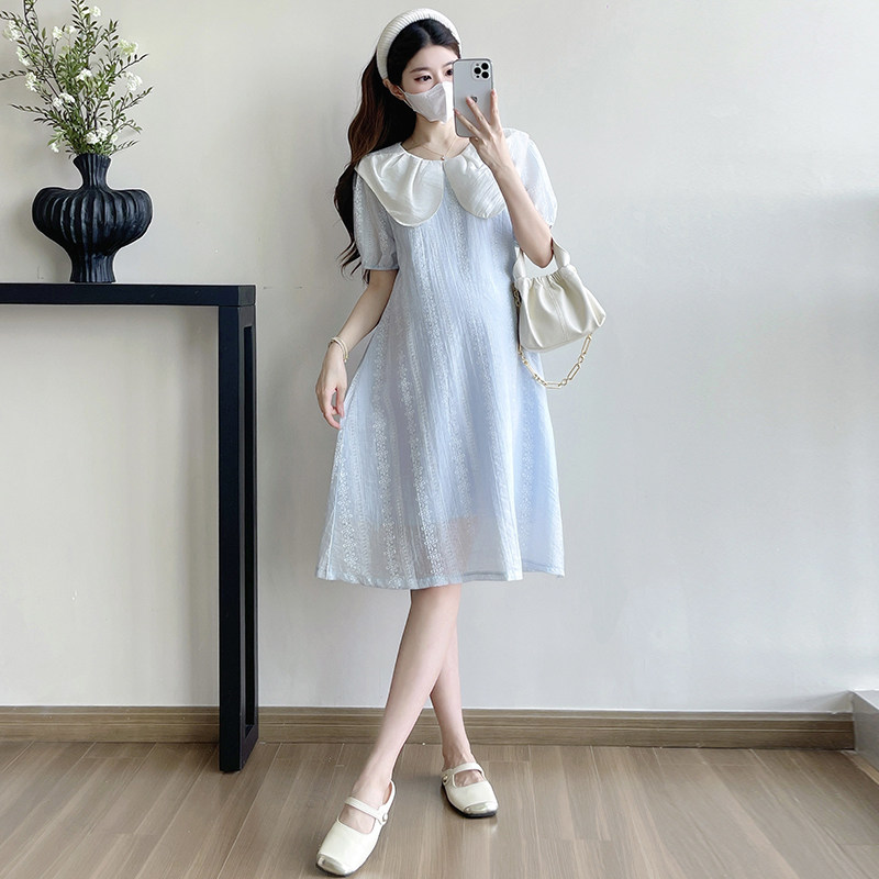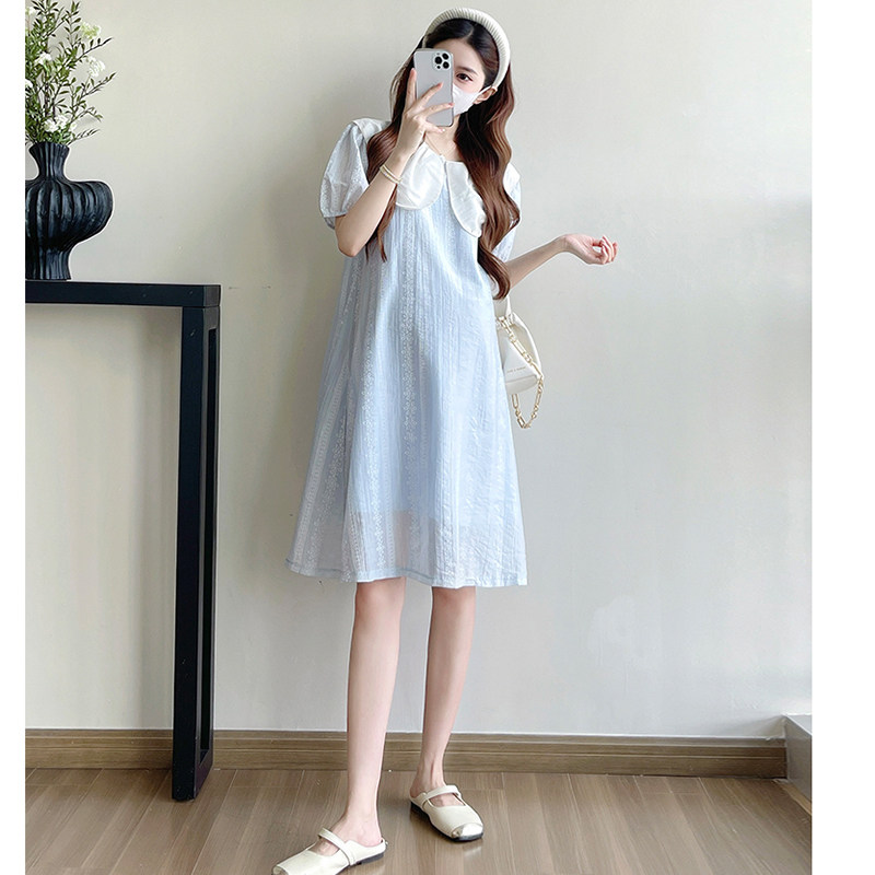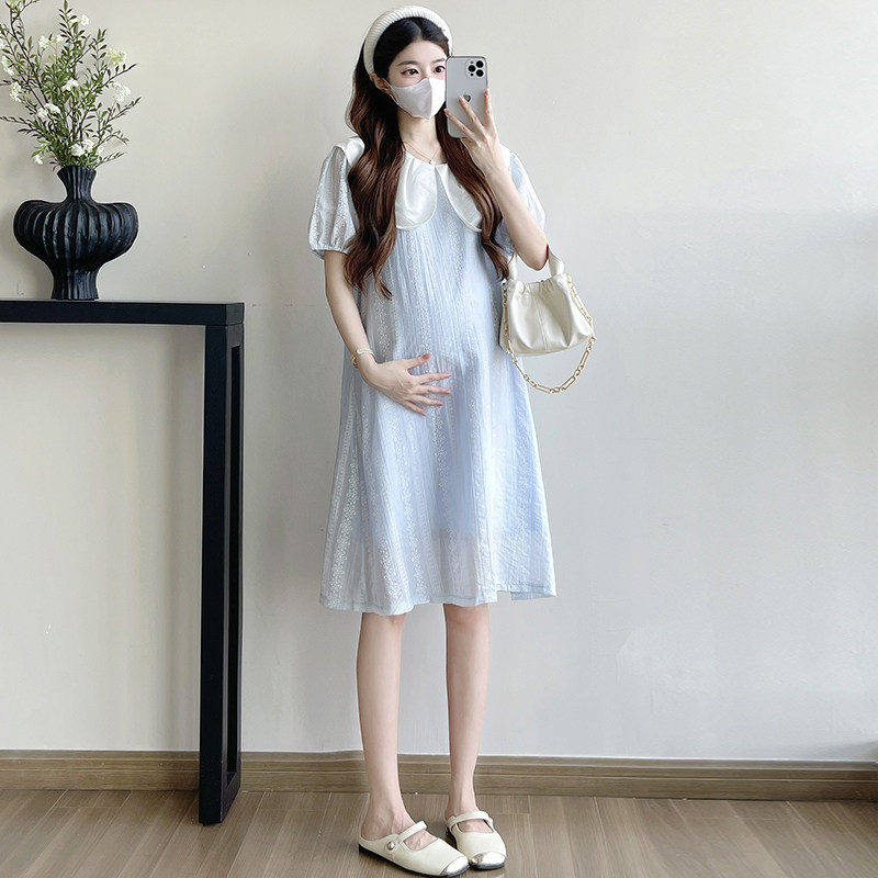 孕妇连衣裙夏季2026新款韩版浅蓝色娃娃领甜美减龄小个子中长款女
