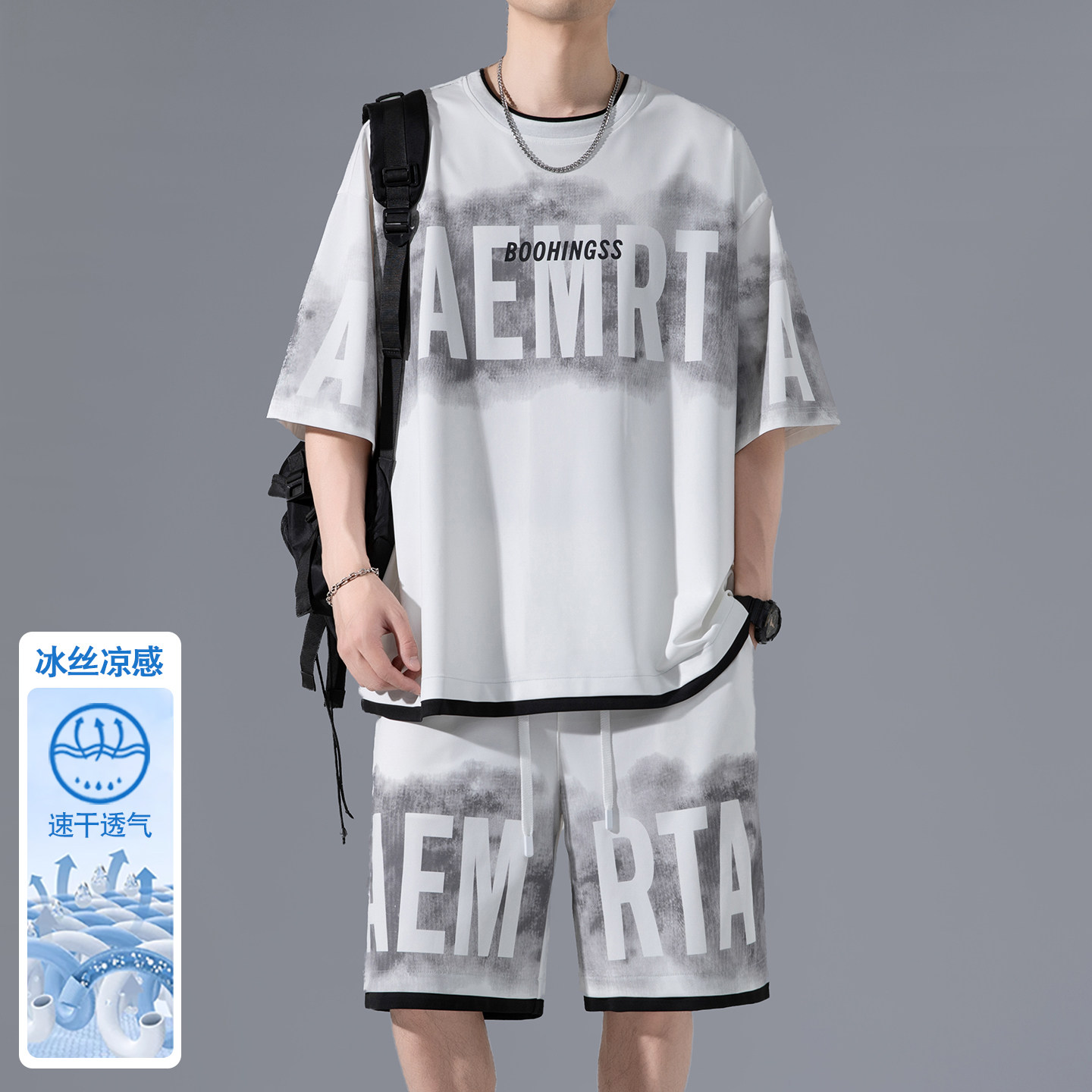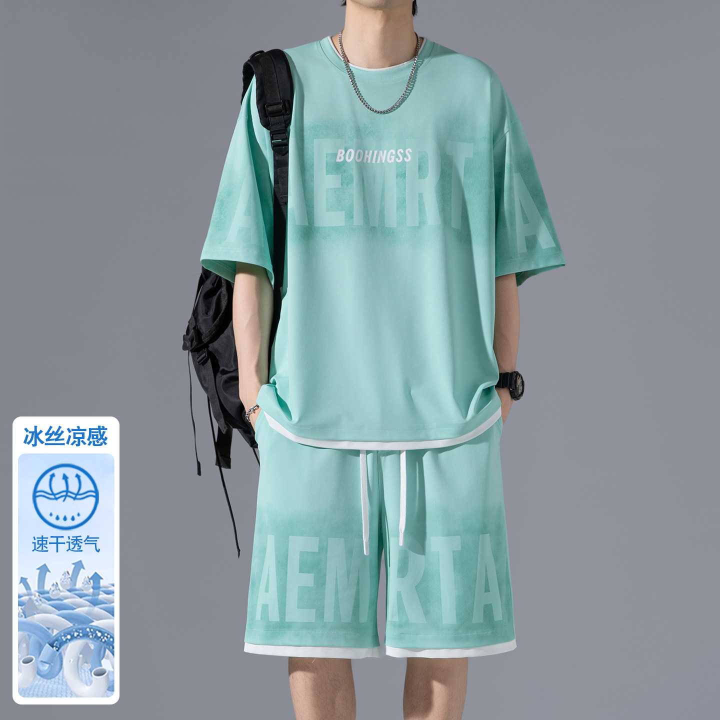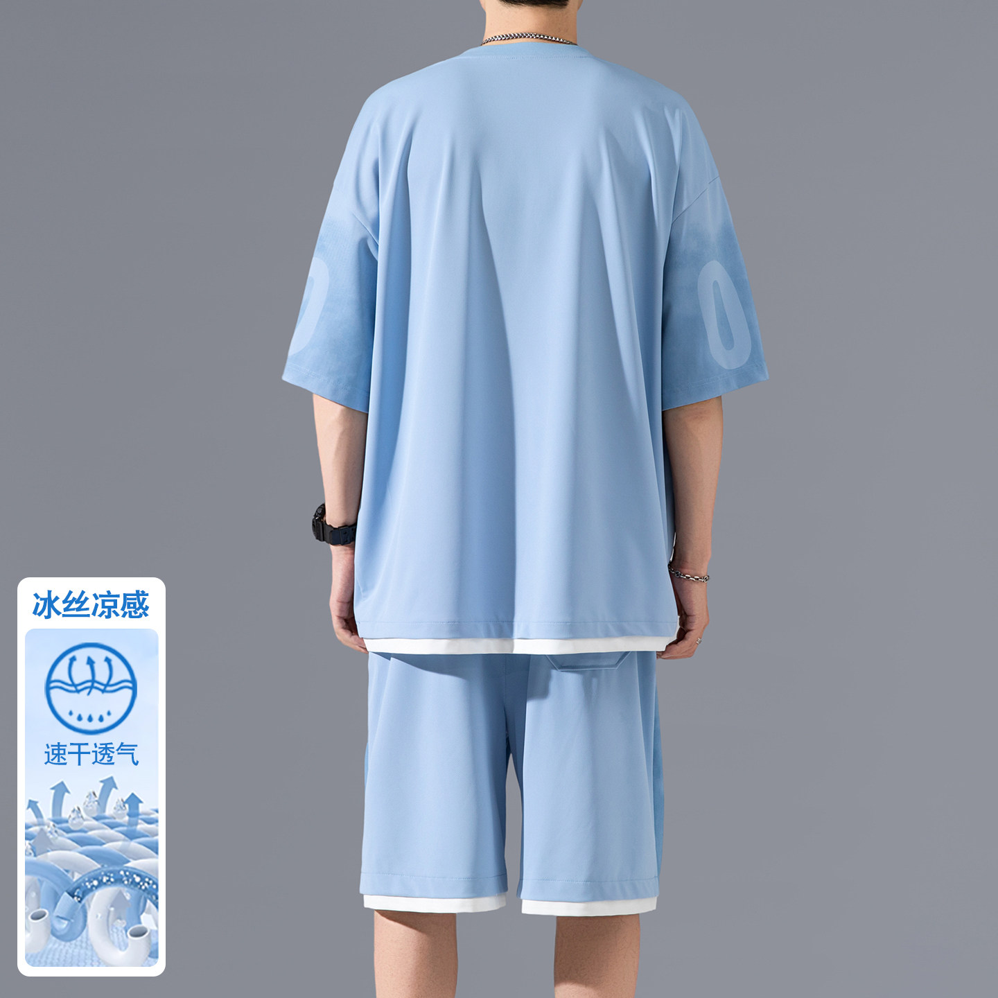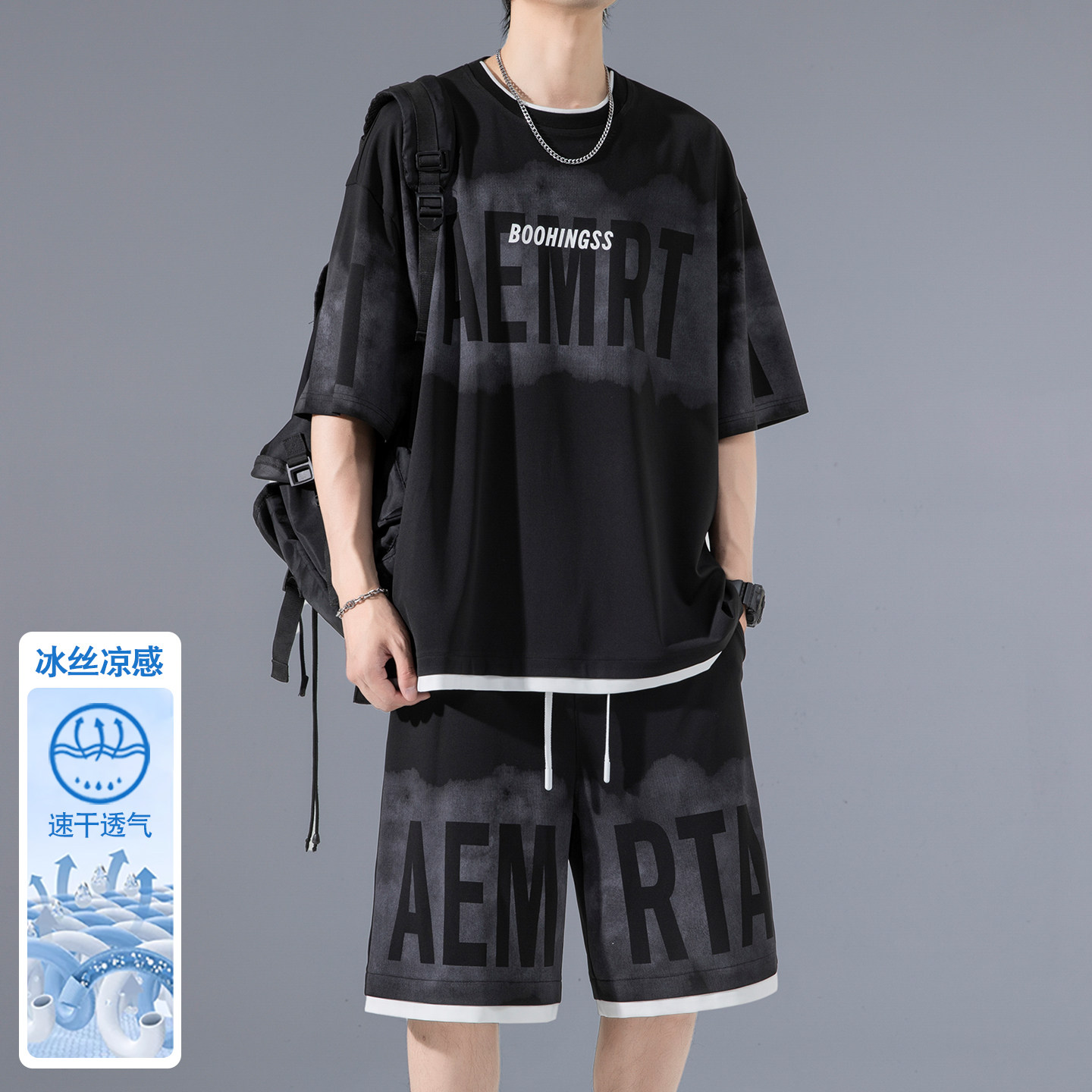 高品质冰丝凉感男士休闲运动套装夏季T恤速干短袖t五分短裤两件套