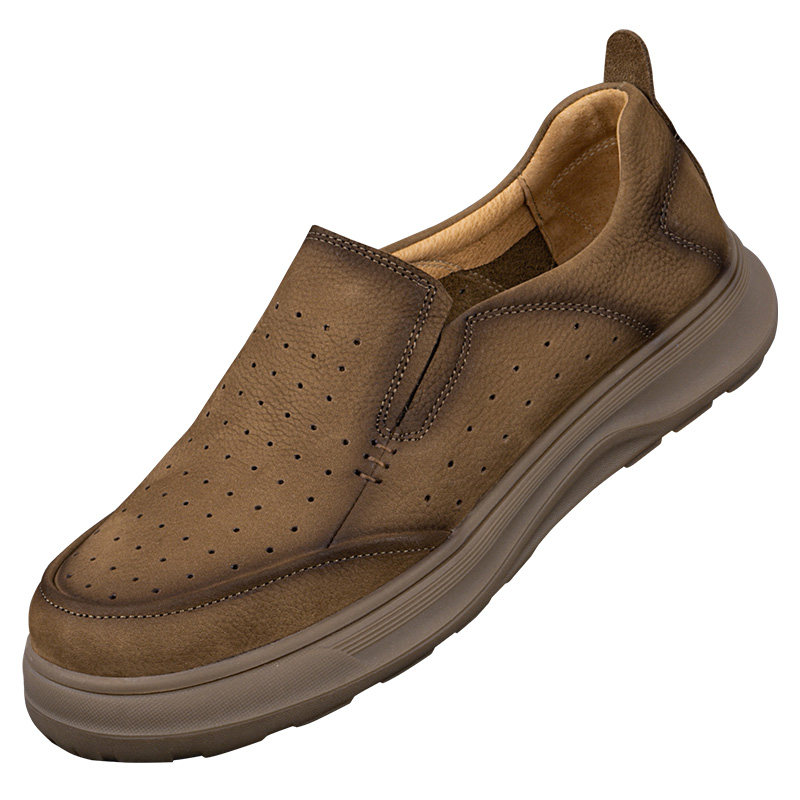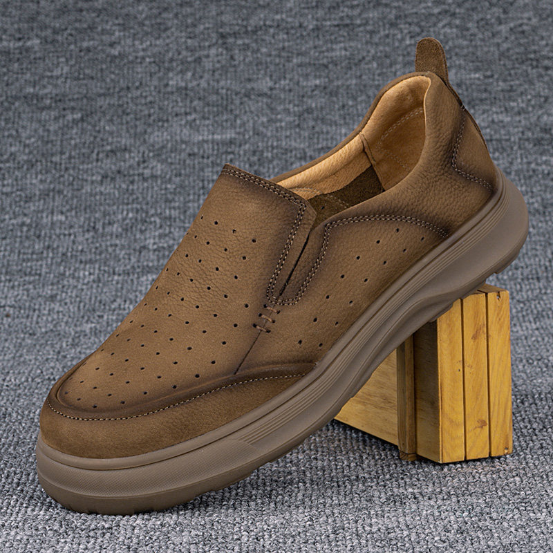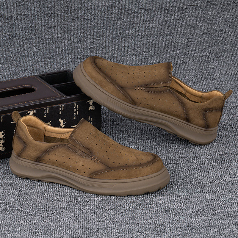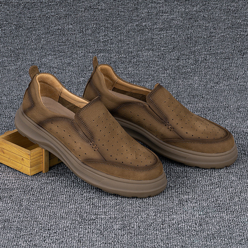 外贸休闲皮鞋男真皮夏季新款透气薄款头层牛皮镂空网眼一脚蹬男鞋