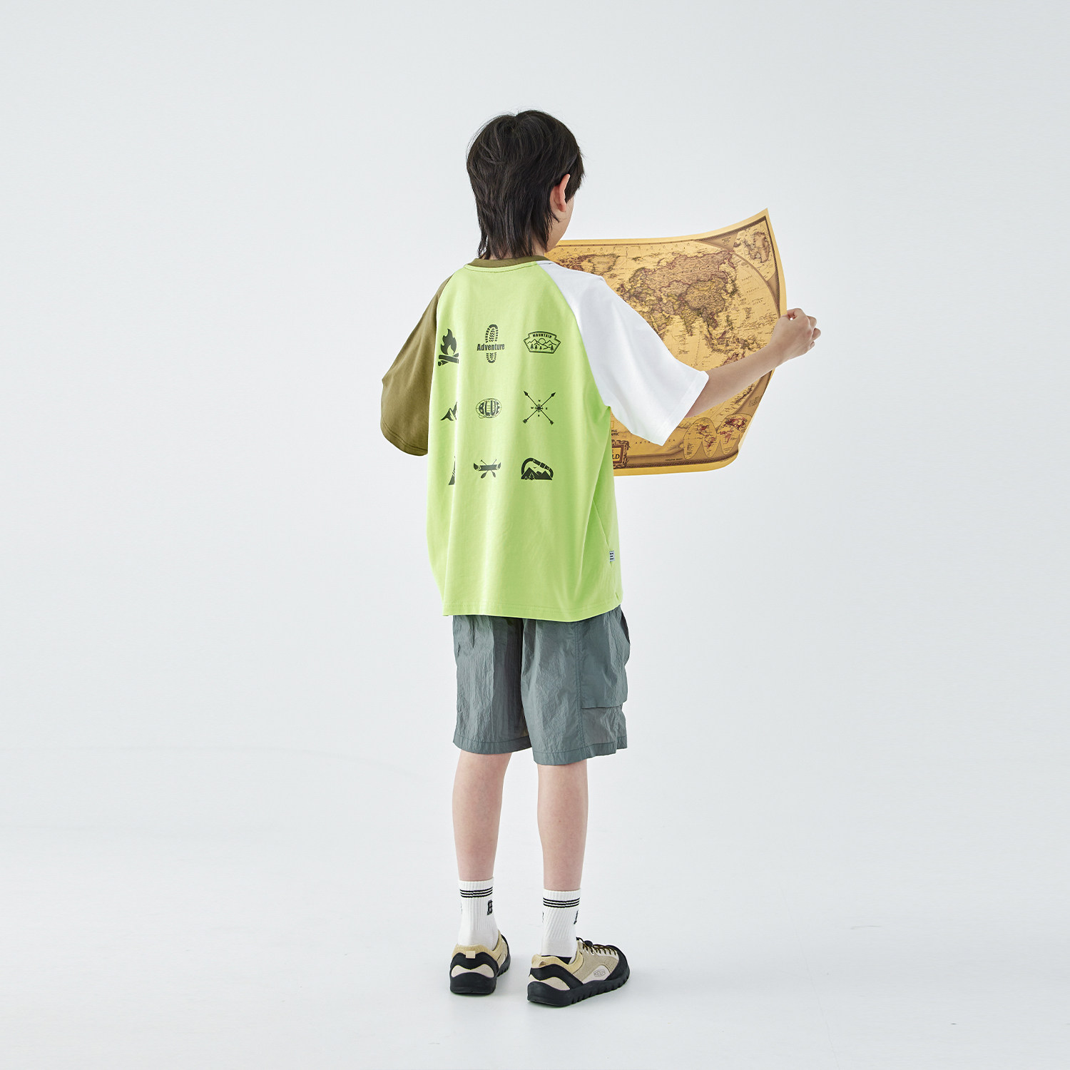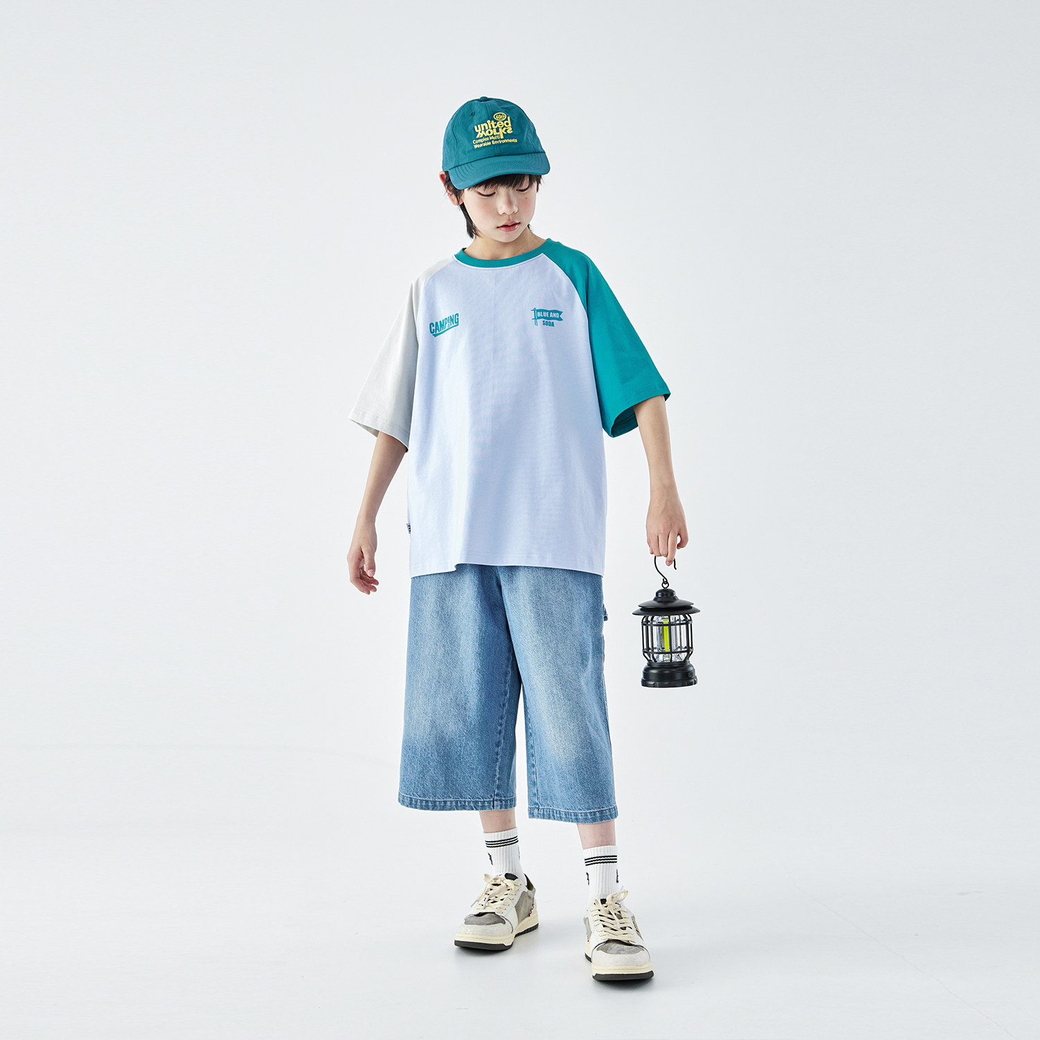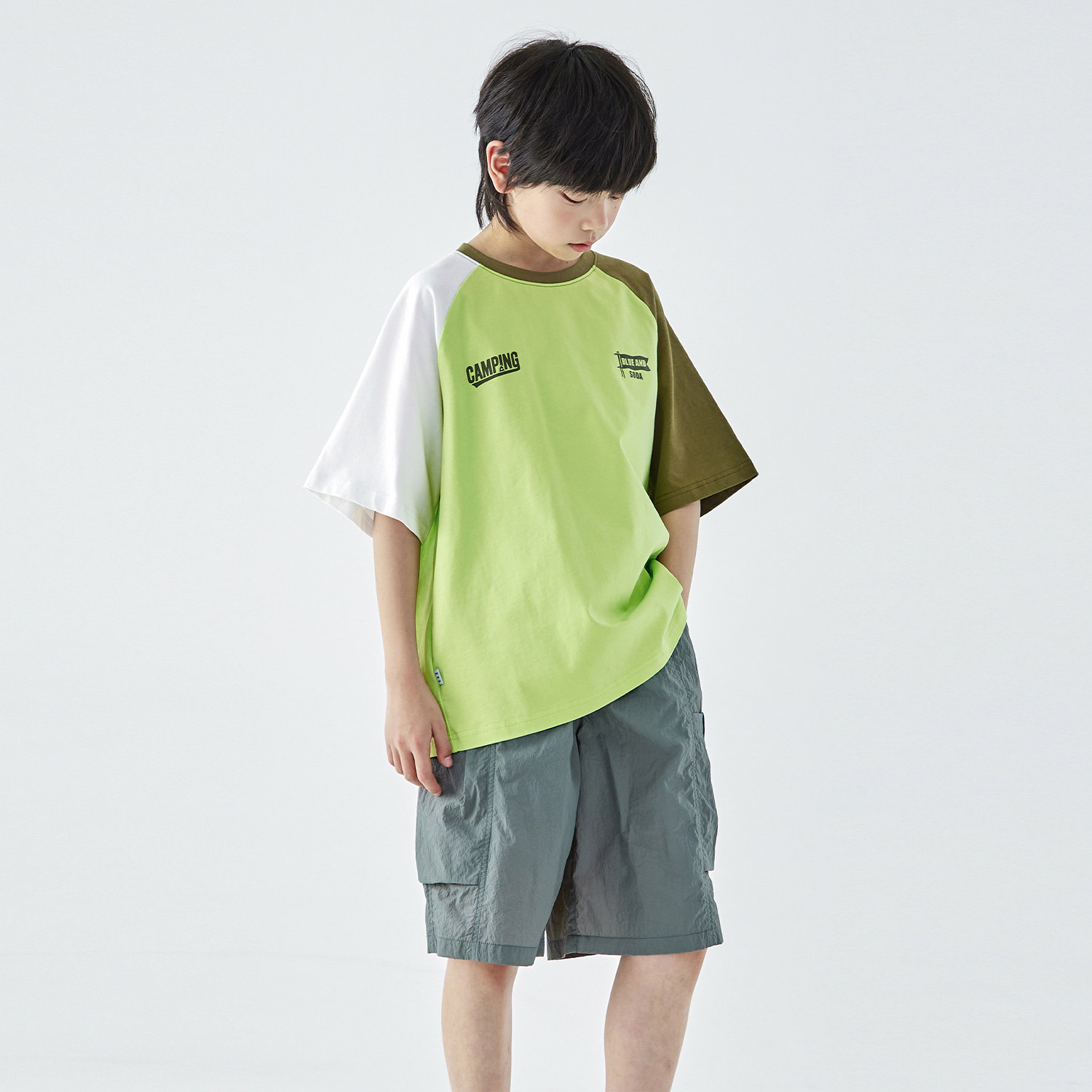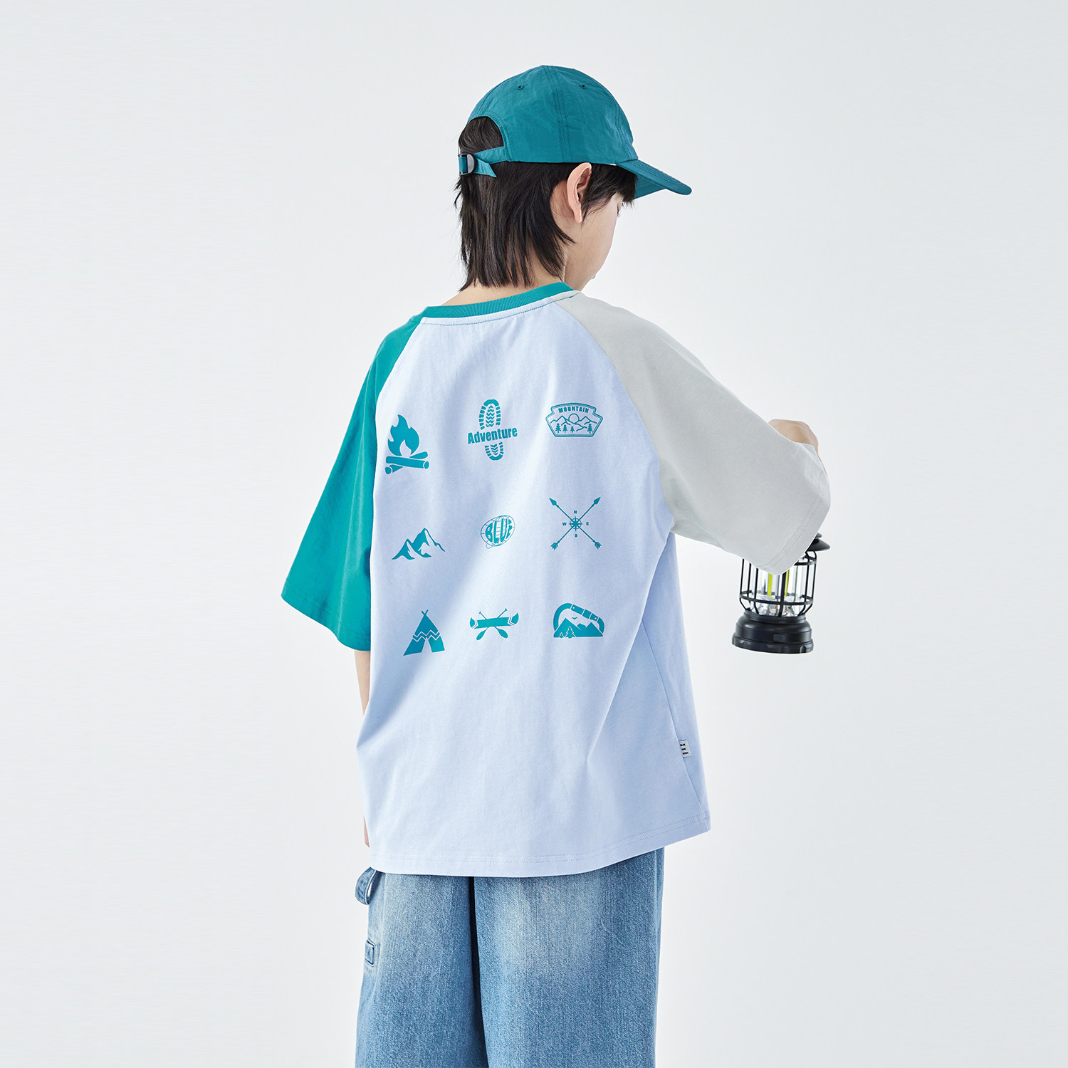 蓝汽水2026夏季新款男童山系露营全棉撞色短袖T恤青少年印花上衣