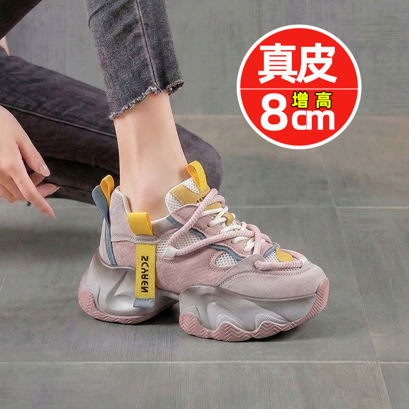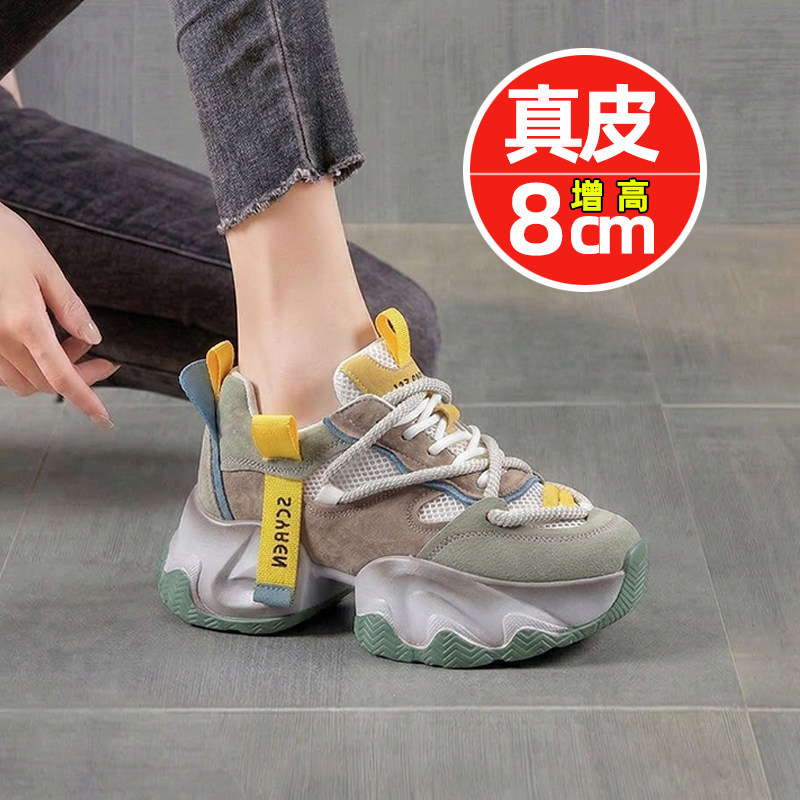 真皮老爹鞋女春季厚底内增高8cm网面休闲鞋百搭轻便女鞋小个子潮