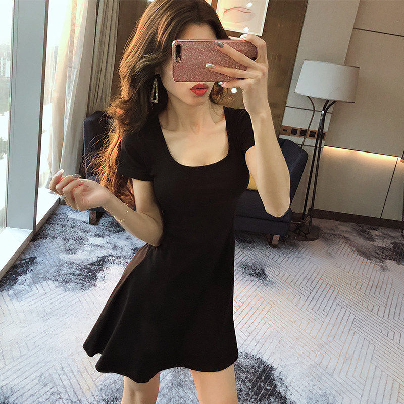 性感赫本风大u领显胸短袖a字连衣裙女夏新款修身显瘦收腰短款短裙