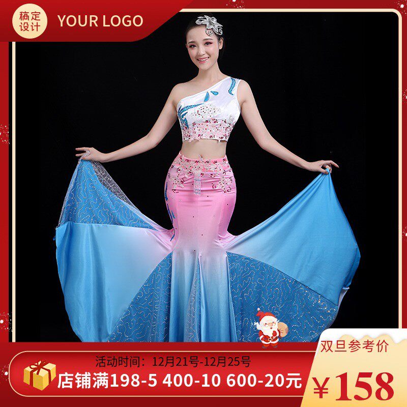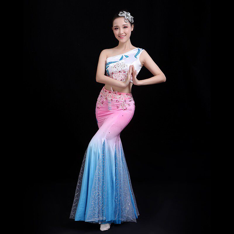 新品傣族舞蹈服装成人女儿童西y双版纳鱼尾裙渐变孔雀舞演出服艺