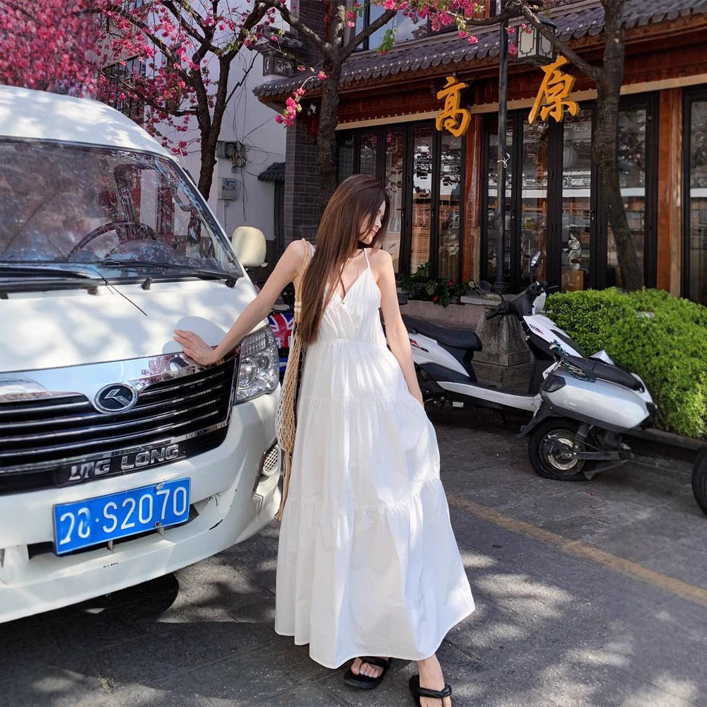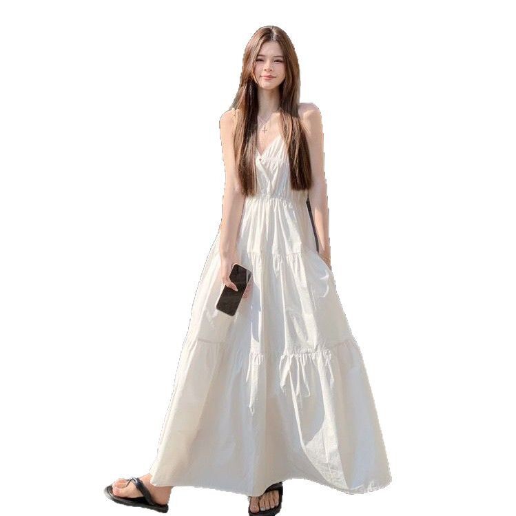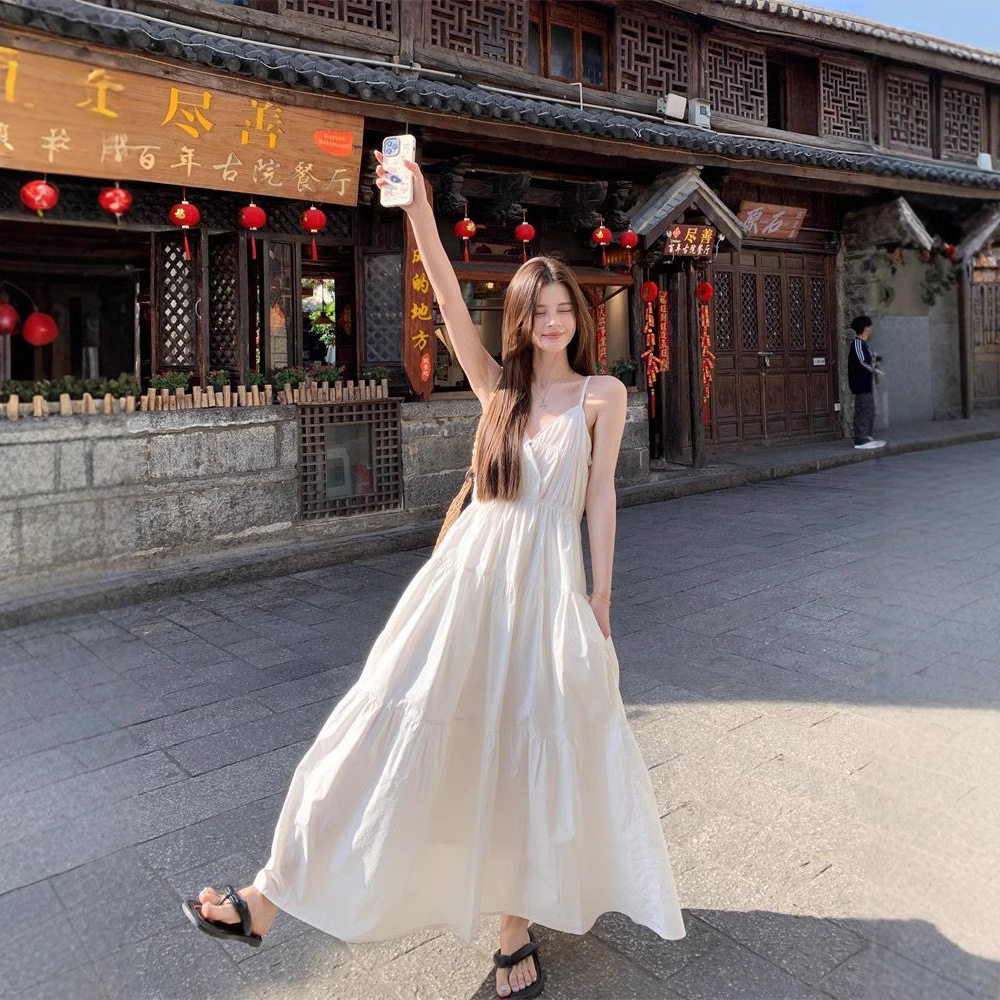 海边度假风白色吊带连衣裙女夏新款收腰显瘦大摆裙气质中长款裙子