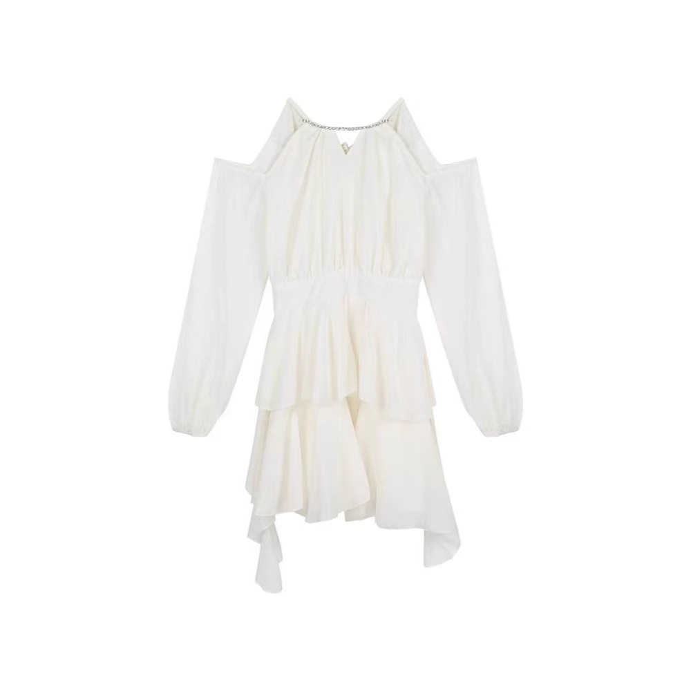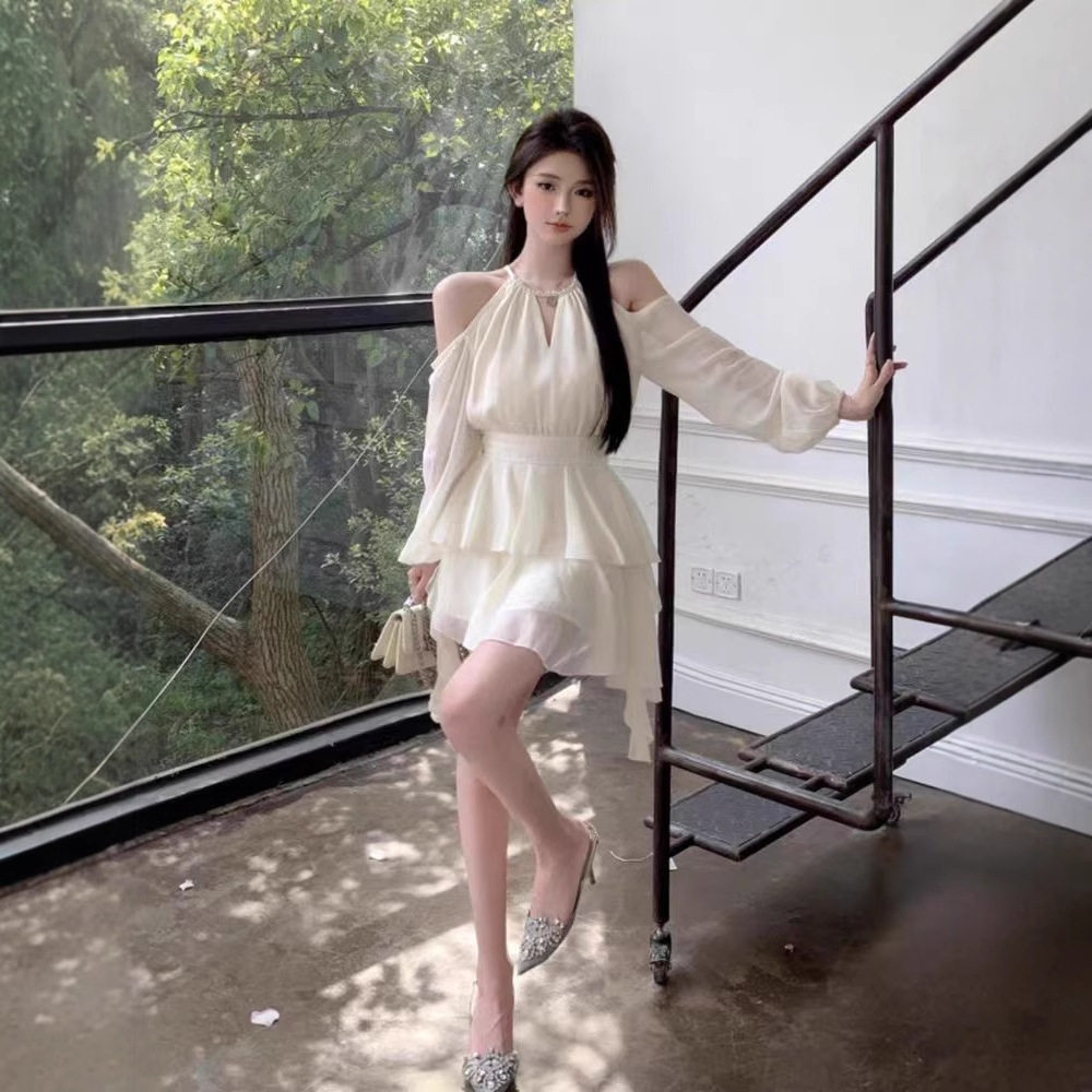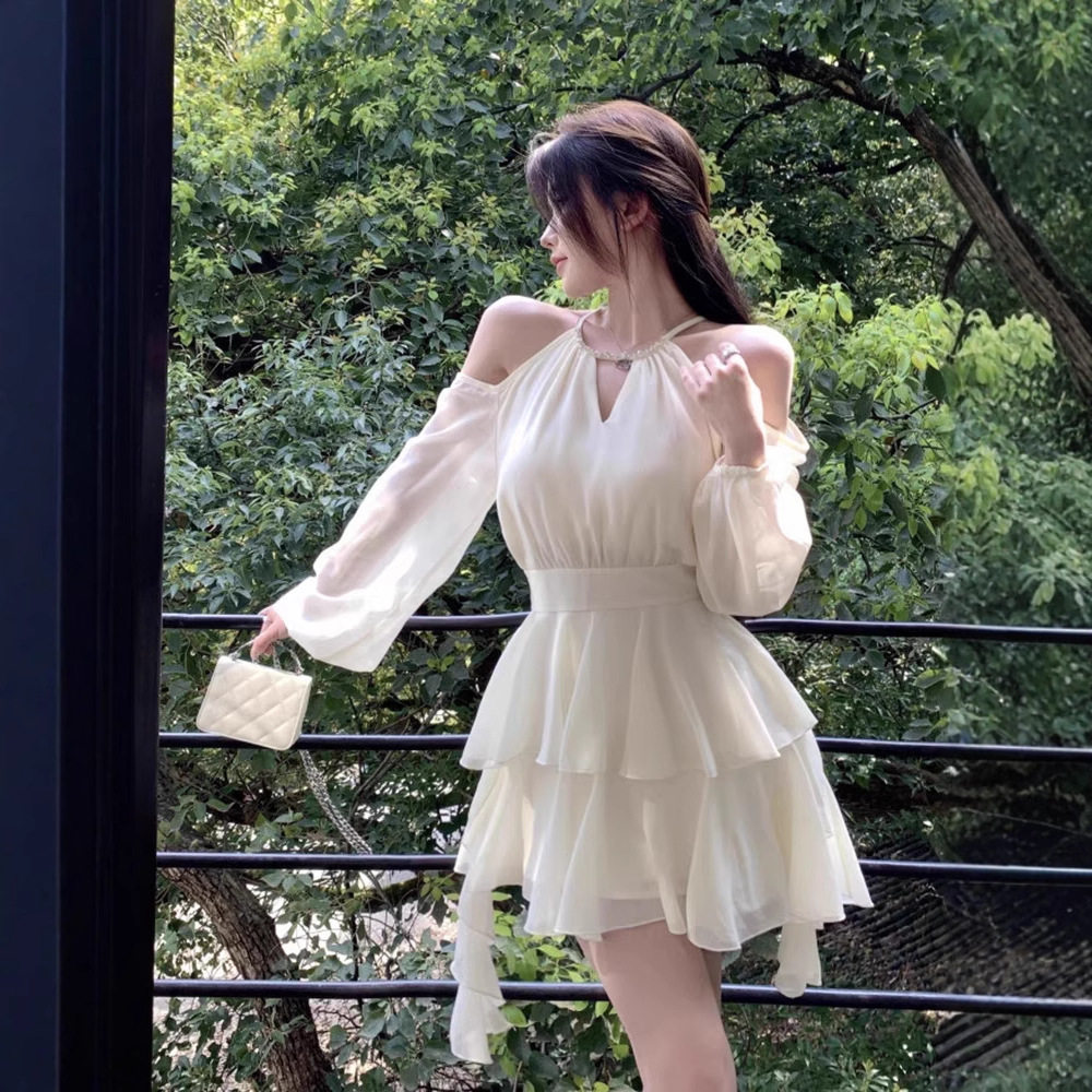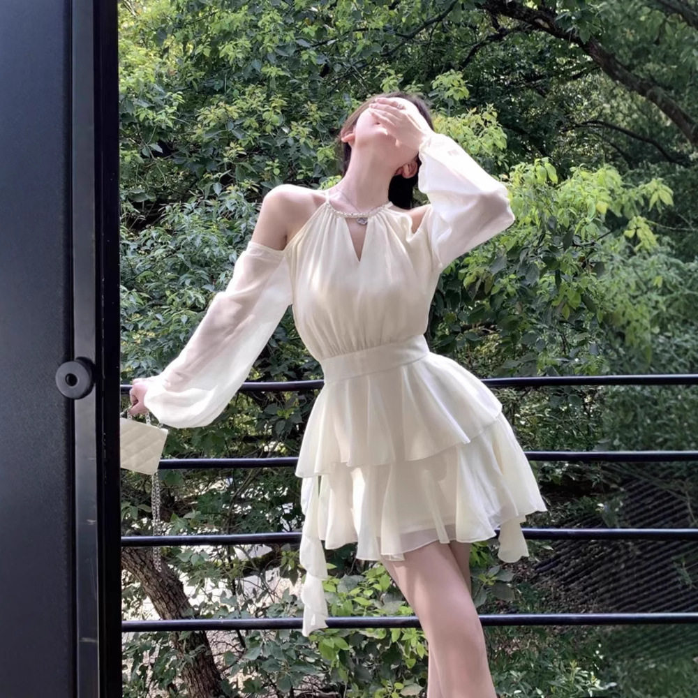 白色长袖连衣裙仙女夏季收腰雪纺短裙荷叶边蛋糕a字裙子复古风