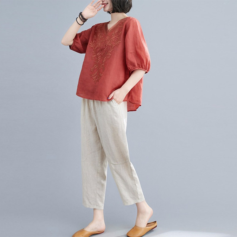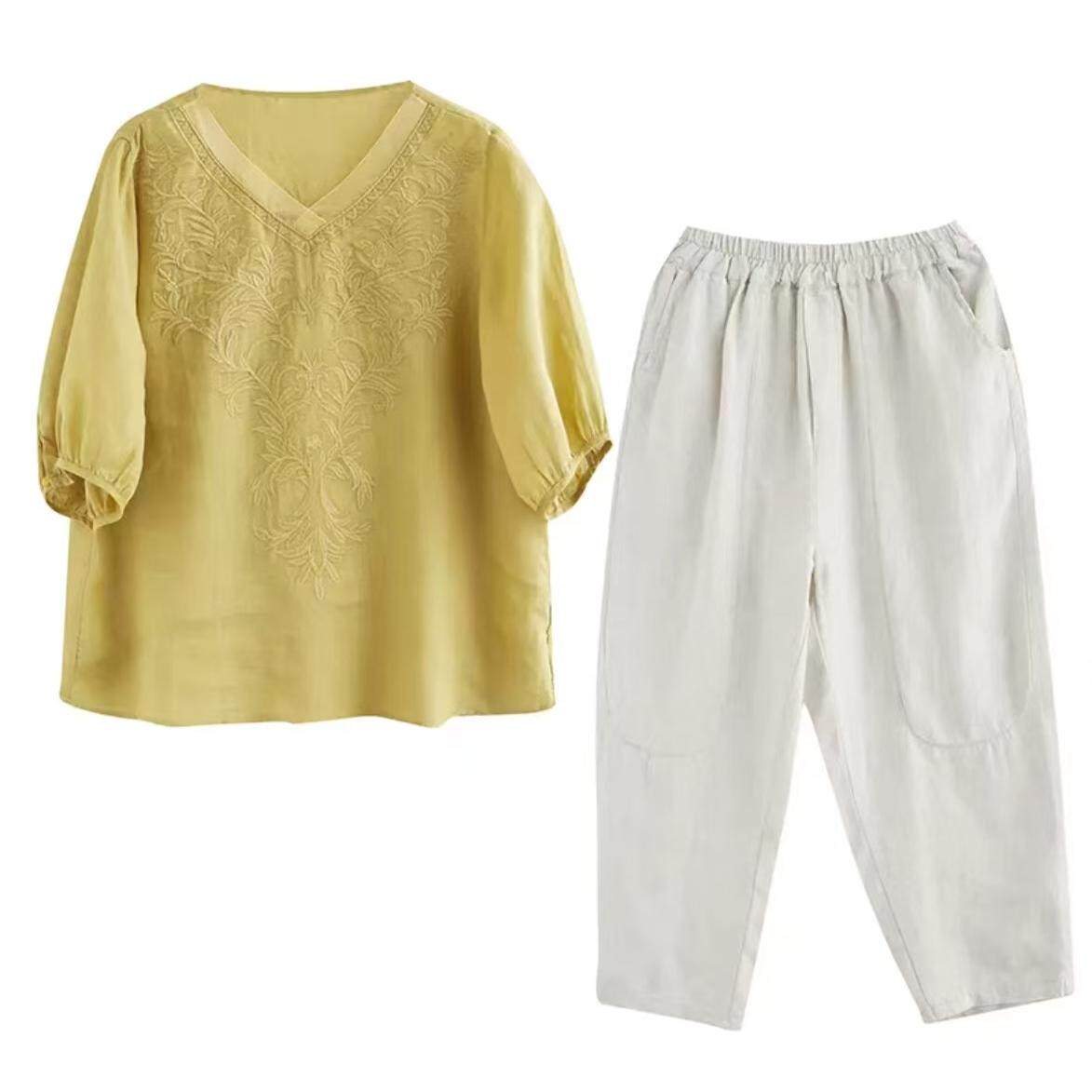 中年妈妈装2026夏装新款短袖上衣夏款中老年女装刺绣棉麻两件套装