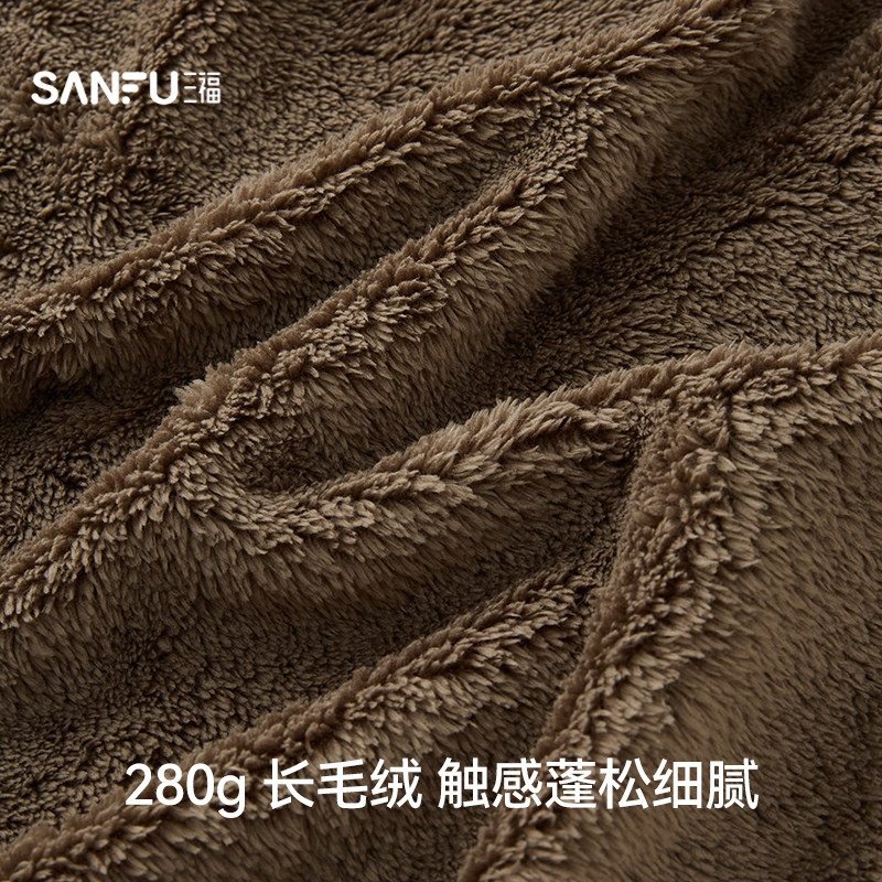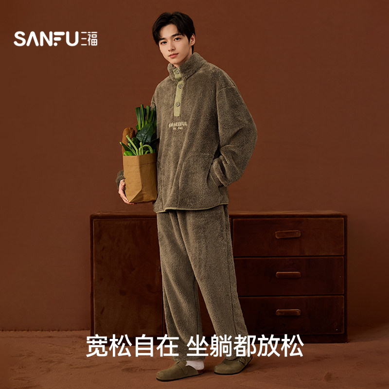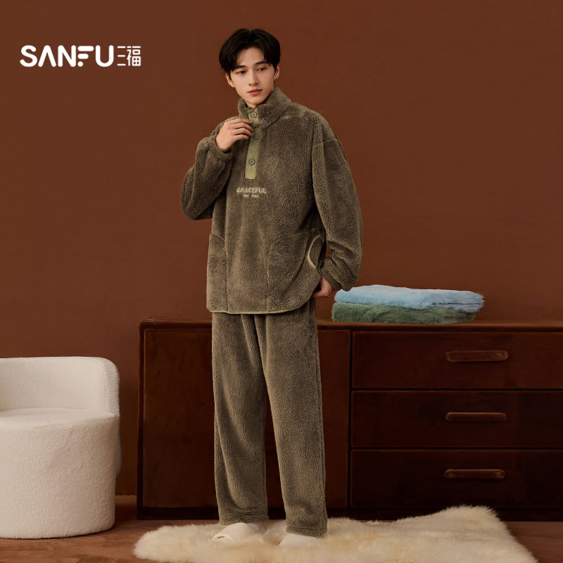 三福睡衣男款冬季长毛绒抗静电家居服半纽扣立领外穿保暖长袖套装